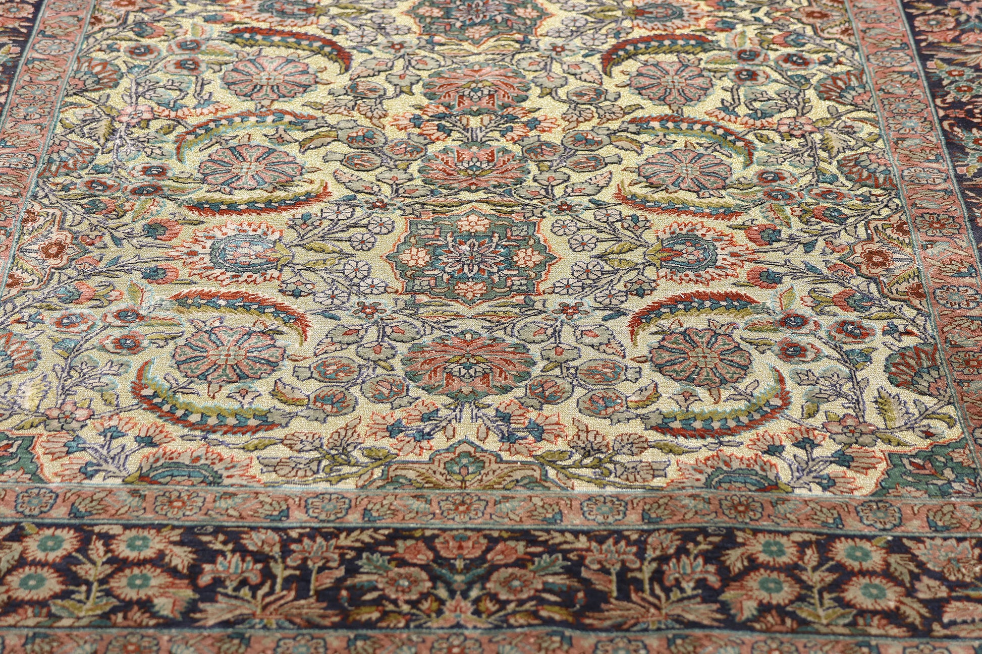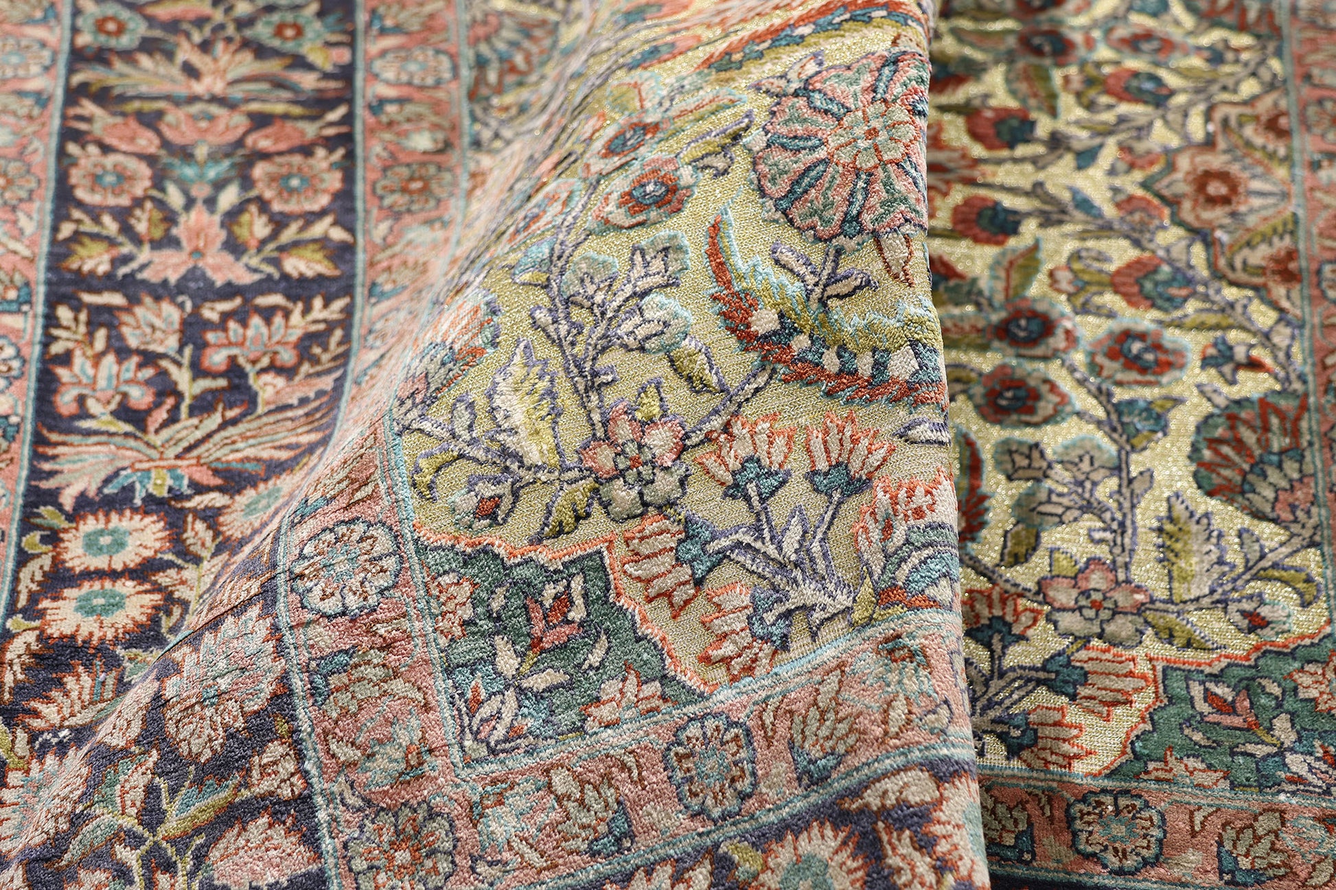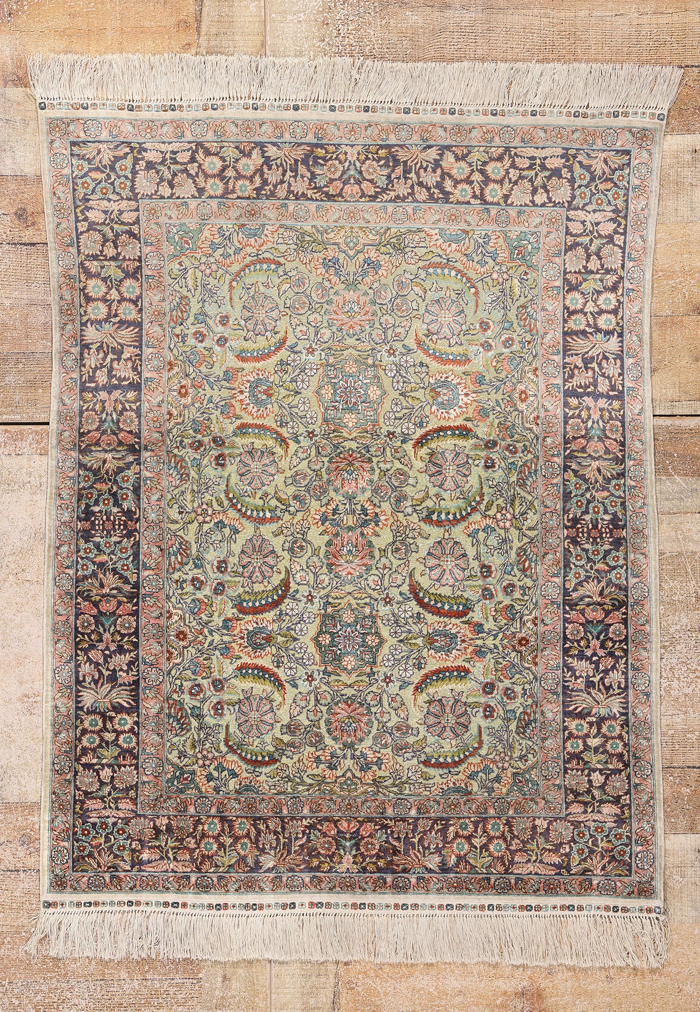 The dreamlike color palette evokes an exquisite sensibility, masterfully restrained yet seductively rich. Dusty rose, muted indigo, pale apricot, and faded saffron gently emerge from the cool celadon background, softened by the inherent sheen of silk. These spellbinding hues seem to shift with the light, creating a shimmering interplay that evokes the dappled glow of dawn over palace gardens. The enchanting floral motifs, with their painterly detail and elegant curvature, appear almost embroidered, inviting the eye to linger on each arabesque flourish and petal’s edge. In this nuanced spectrum of color and texture, this magnificent woven wonder transcends textile and becomes poetry woven into form.