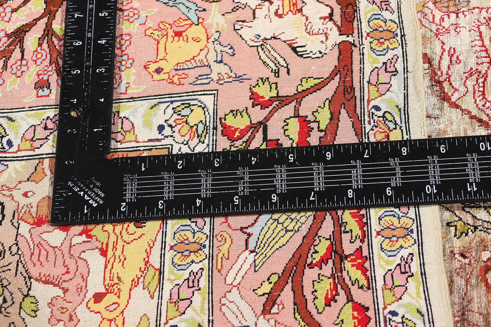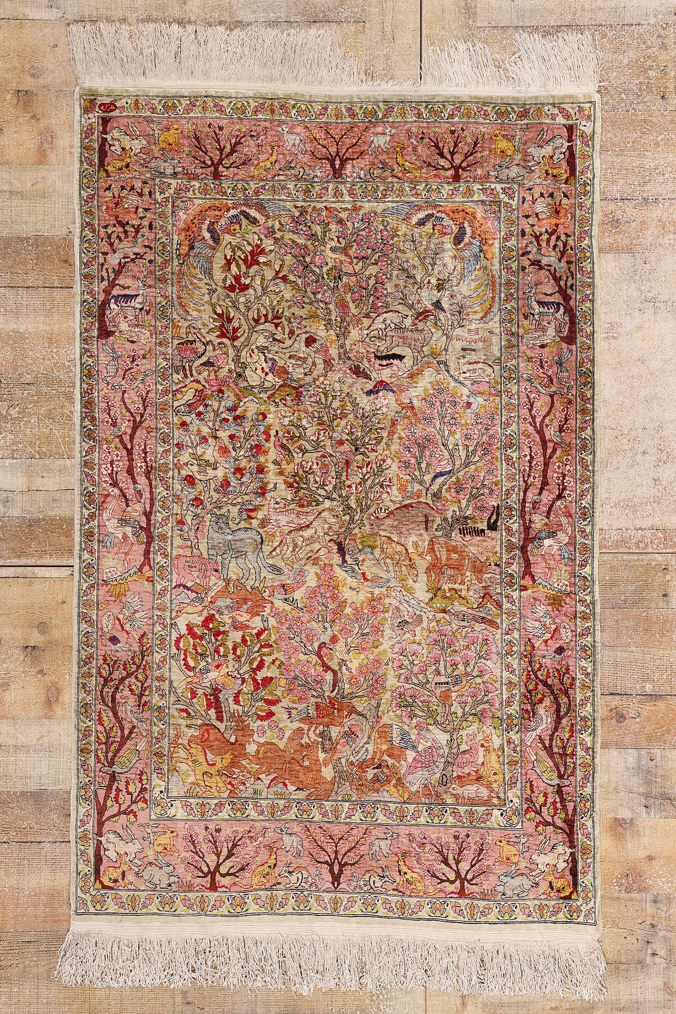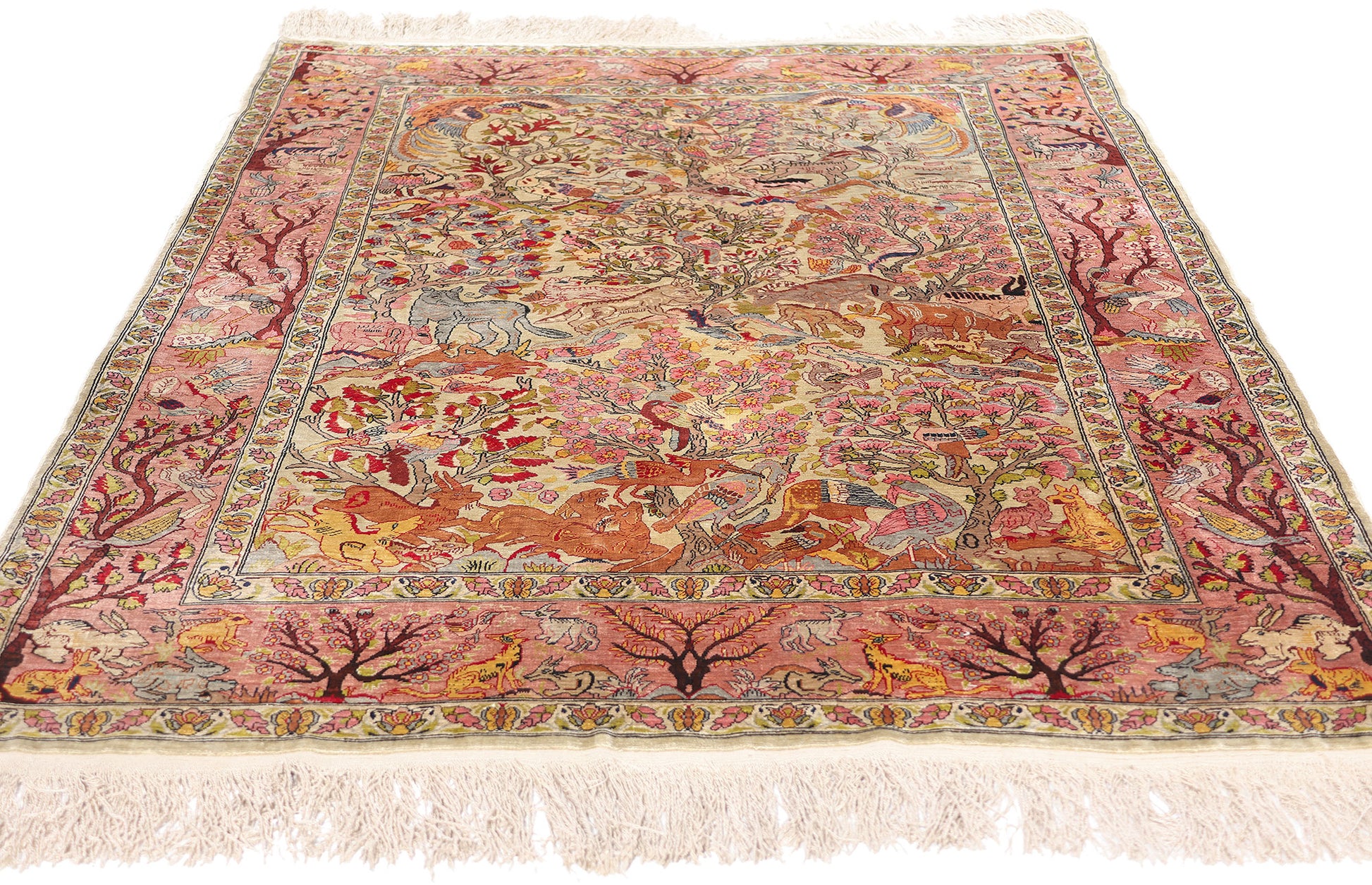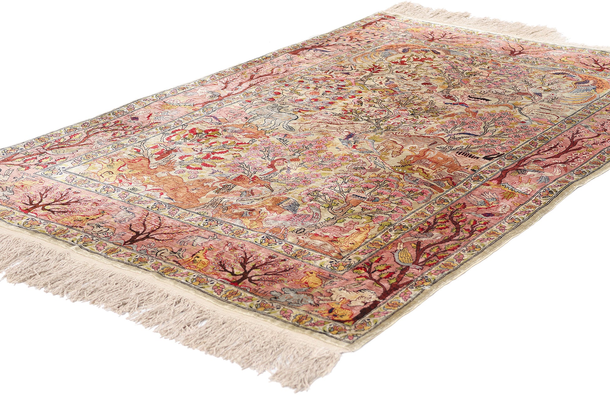 This hand-knotted vintage Turkish silk Hereke rug unveils a vivid pictorial scene, a magnificent Garden of Paradise woven into its very fibers. The Hereke rug's design is a lush tableau, where nature thrives in every corner. At the heart of the composition lies the revered Tree of Life, its roots deep in the earth, its branches reaching to the heavens, surrounded by an array of life in motion—birds, animals, and blossoms—all painted with the delicate brushstrokes of silk. The rich pinks, reds, and soft golds of the field create an ethereal glow, as though the garden itself has been bathed in the first rays of dawn.