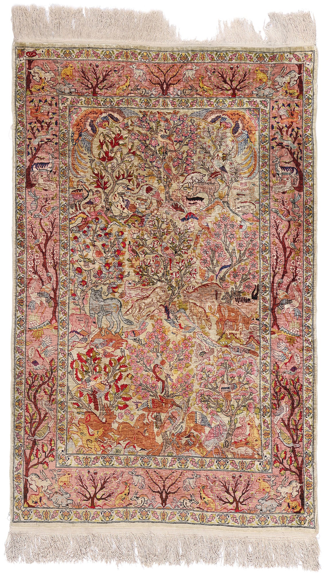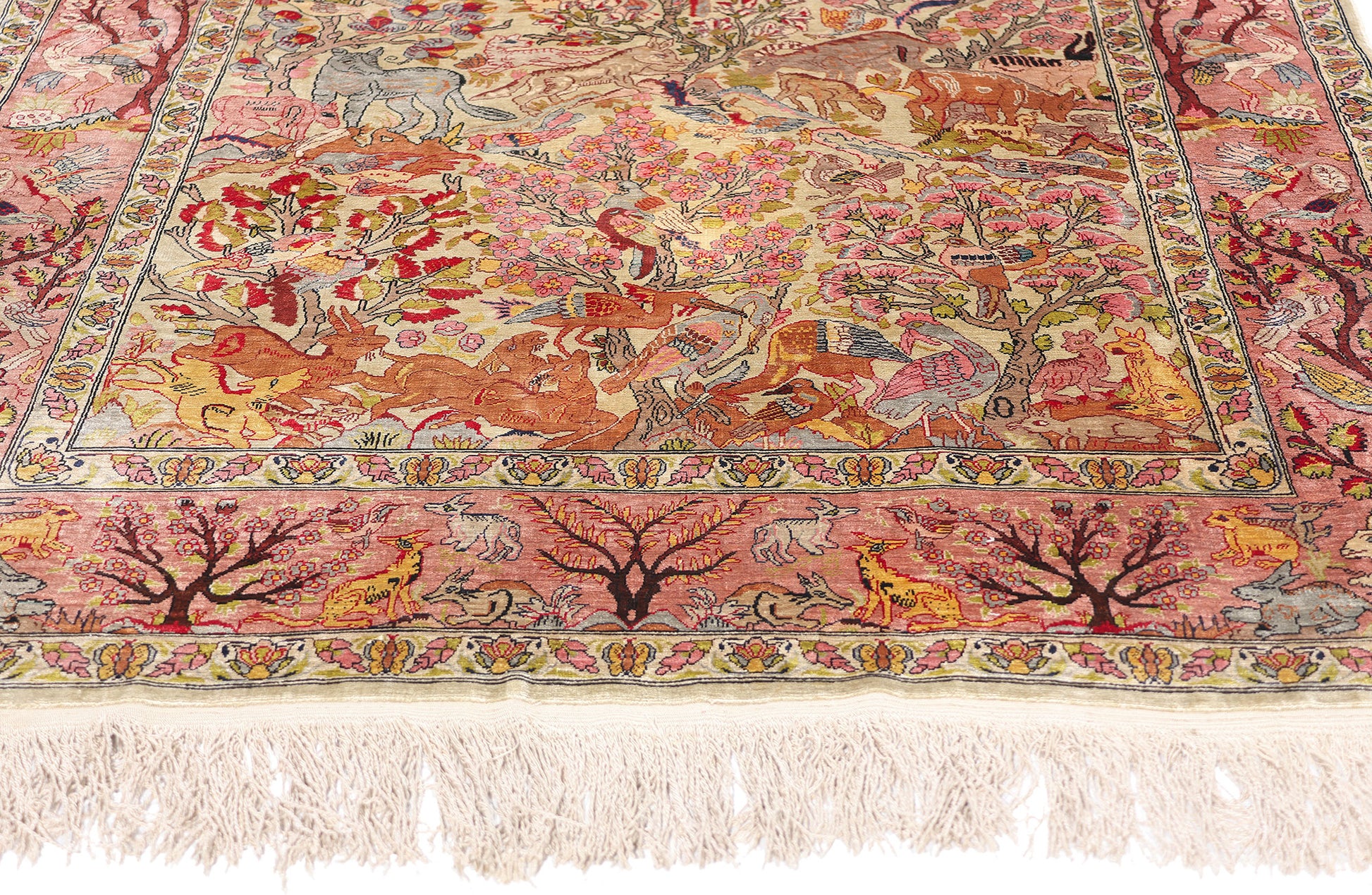 The elegant design weaves seamlessly into the Tree of Life motif, a symbol of eternal growth and renewal, revered across cultures for its deep spiritual meaning. The trees bloom with abundant blossoms, their pink flowers echoing the natural beauty surrounding them. With each knot, this Hereke rug conjures the timeless beauty of the garden as a reflection of paradise—an Eden where life thrives in its most harmonious and vibrant form. The symbiotic relationship between the flora and fauna within this motif paints a picture of idealized nature, of peace, of sacred unity between all living beings.