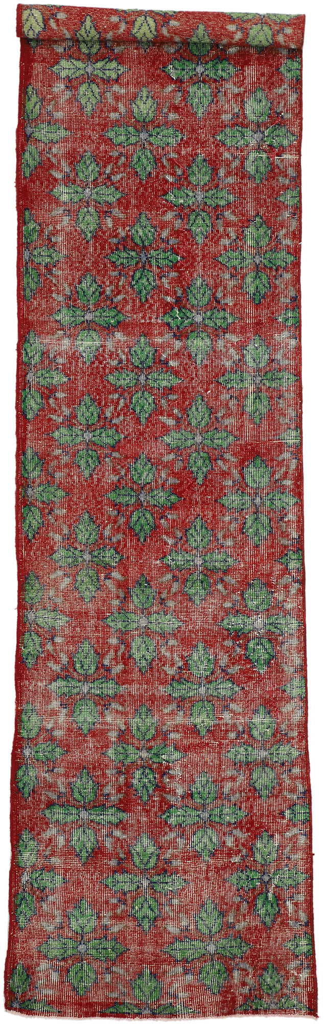 Esmaili Rugs Collection. Warm and inviting, this hand knotted wool distressed vintage Turkish Sivas runner awakens the soul with its understated elegance and traditional English charm. It features an all-over botanical pattern composed of serrated green quatrefoils with leaflets rhythmically spread across the abrashed red field. With its soft washed-out colors and just the right amount of age-wear, this vintage Turkish Sivas runner would add style and a hint of romance to nearly any interior. Perfect for a short Hallway, stair landing, lounge area, bedroom, entertaining space, private library, home office, sitting room, urban loft, studio, study, game room, grand foyer, alcove, small space, designer entryway, nook, or mudroom. Well-suited for a wide range of interior styles: English Country, Traditional, Shabby Chic, Romantic Country, Arts & Crafts, English Cottage, Swedish Farmhouse, French Provincial, Gustavian, Rustic, Artisan, French Country, Lodge, Cabin, Feminine Industrial, Southern Living, Craftsman, and Eclectic. Rendered