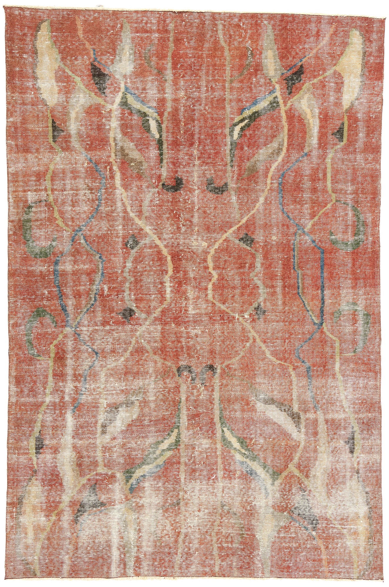 In this Zeki Muren vintage Turkish Sivas rug, Biophilic Design seamlessly intertwines with avant-garde interior design, transcending the constraints of time and challenging conventional classism. The rug's bold geometric pattern and faded earth-tone colors coalesce harmoniously, creating an eclectic yet nostalgic ambiance. Its distressed composition features an abstract linear art form adorned with biomorphic forms and amorphous shapes, reminiscent of Biophilia and humankind’s innate connection with nature. Despite the faded appearance and shorn pile, the Turkish rug's bright earthy colors strike a delicate balance with warm neutral tones, resulting in a captivating juxtaposition that evades a chaotic aesthetic.