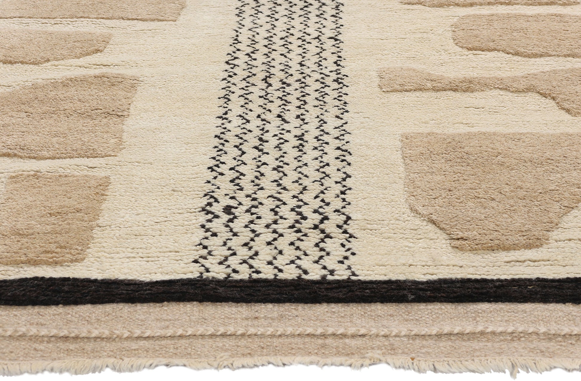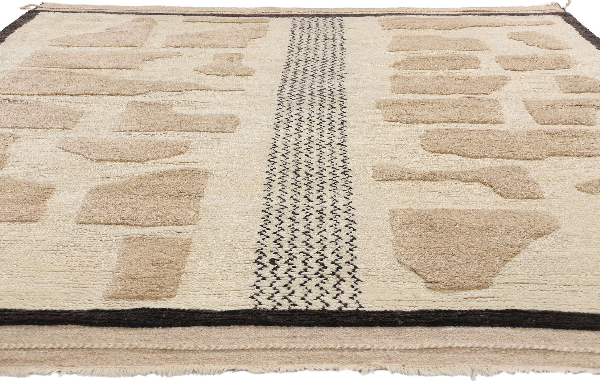 Step into the world of natural beauty with the Nomadic Stones Organic Modern Moroccan Rug. This hand-knotted masterpiece is an ode to the earthy tones and textures found in the landscapes of ancient pathways and nomadic trails. Crafted from fine wool, the Moroccan area rug features a harmonious palette of neutral earth-tone colors, reflecting the soothing hues of sand, stone, and clay. The irregular shapes of sandstone fragments, scattered across the surface, create a dynamic pattern that embodies the essence of a wandering earth, inviting you to explore its natural terrain.