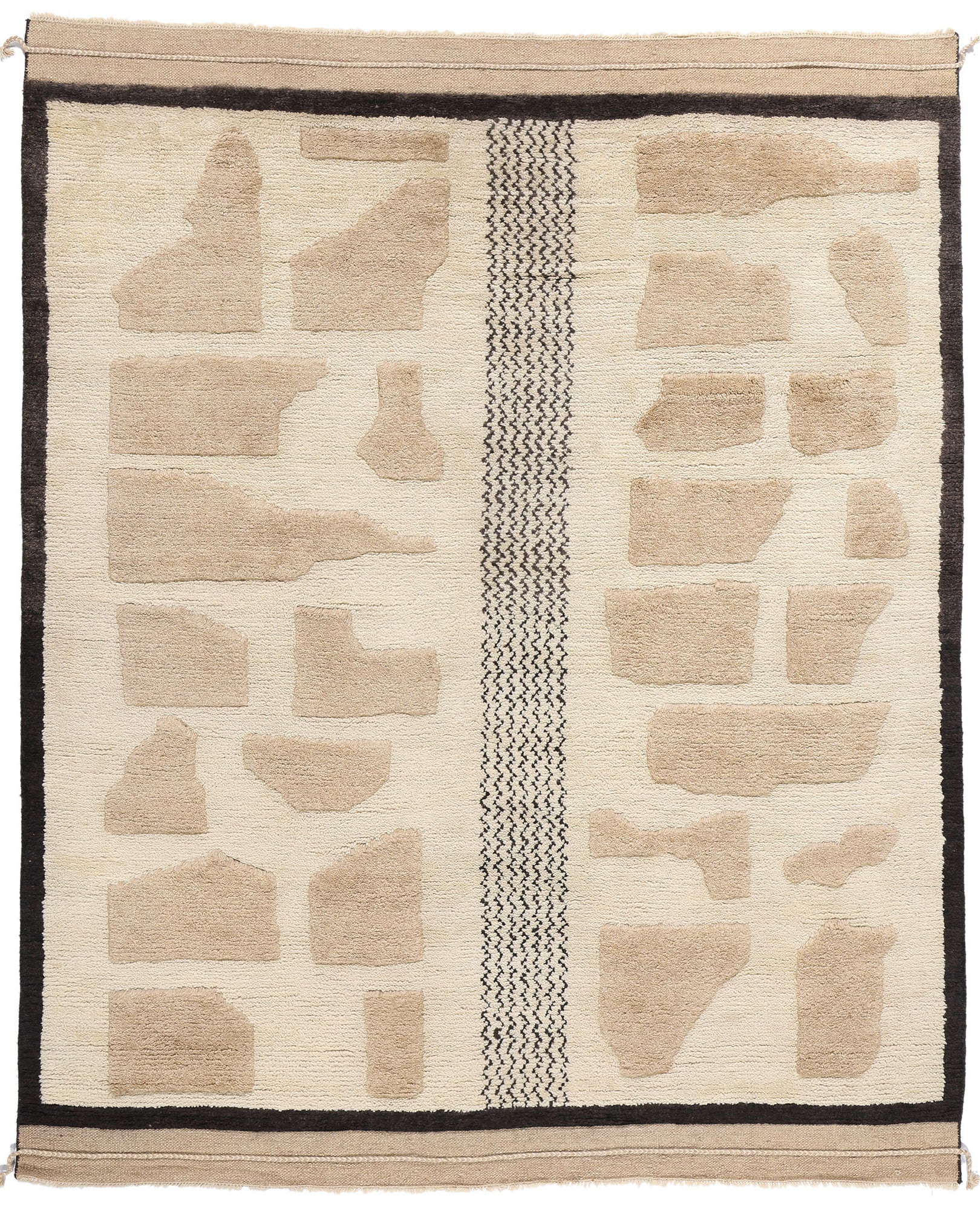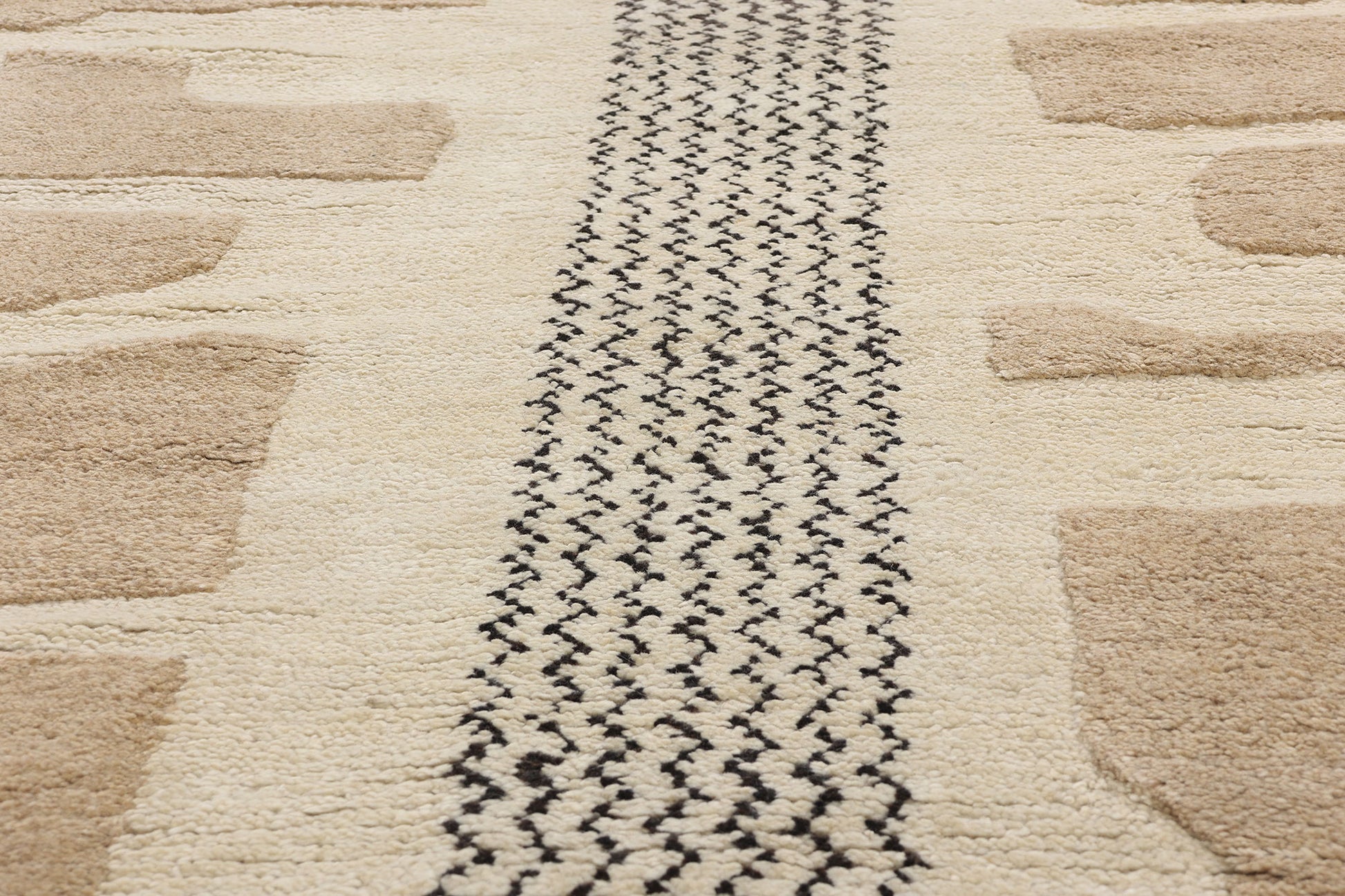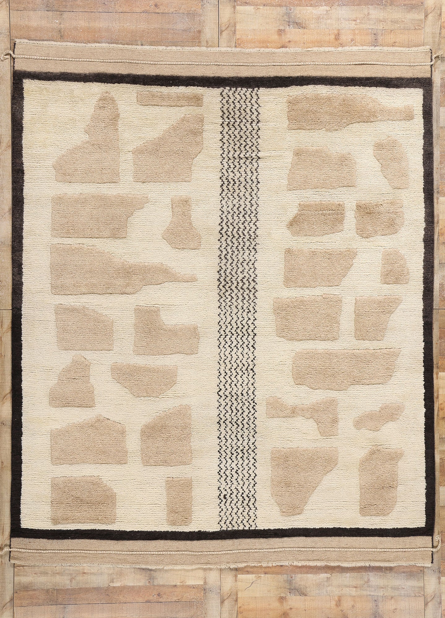 The Moroccan rug’s high and low pile construction adds depth and dimension, creating a tactile experience that mirrors the organic texture of rugged landscapes. Each shape and line is carefully woven to evoke the feeling of walking on earthen pathways, where every step reveals a new story embedded in the ground. The contrast between the raised and level surfaces highlights the craftsmanship and artistry involved in its creation, while the subtle variations in color and texture echo the principles of Wabi-Sabi — finding beauty in imperfection and the passage of time.