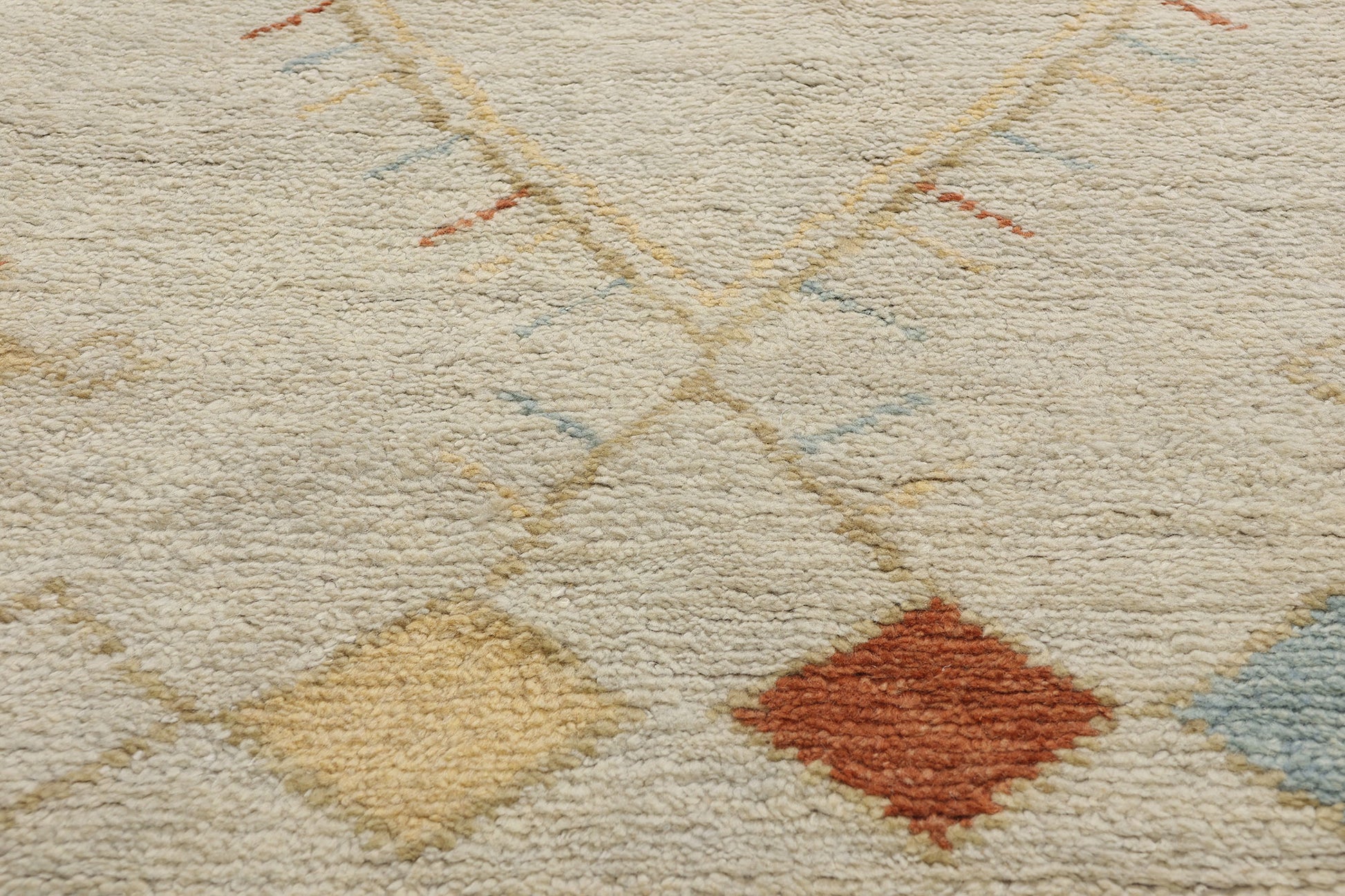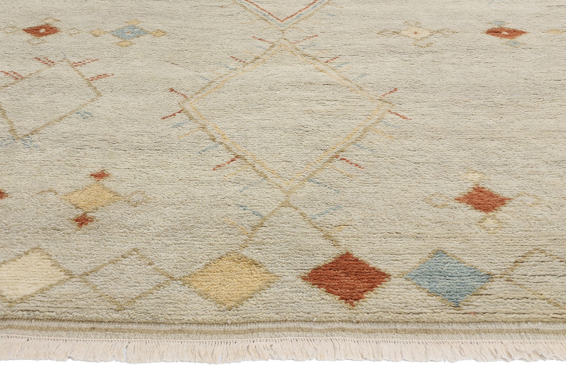 This hand knotted wool Desert Breeze Modern Moroccan Rug is a captivating piece that effortlessly blends traditional Moroccan design with contemporary aesthetics. This Moroccan area rug exudes warmth and tranquility, with its delicate color palette of light blue, tan, terra cotta, beige, and light yellow. The soft, earthy tones create a serene atmosphere, reminiscent of the calm and quiet beauty of a desert landscape at dawn. The rug's understated elegance makes it a perfect fit for various interior styles, from Boho Chic to Modern Tribal.