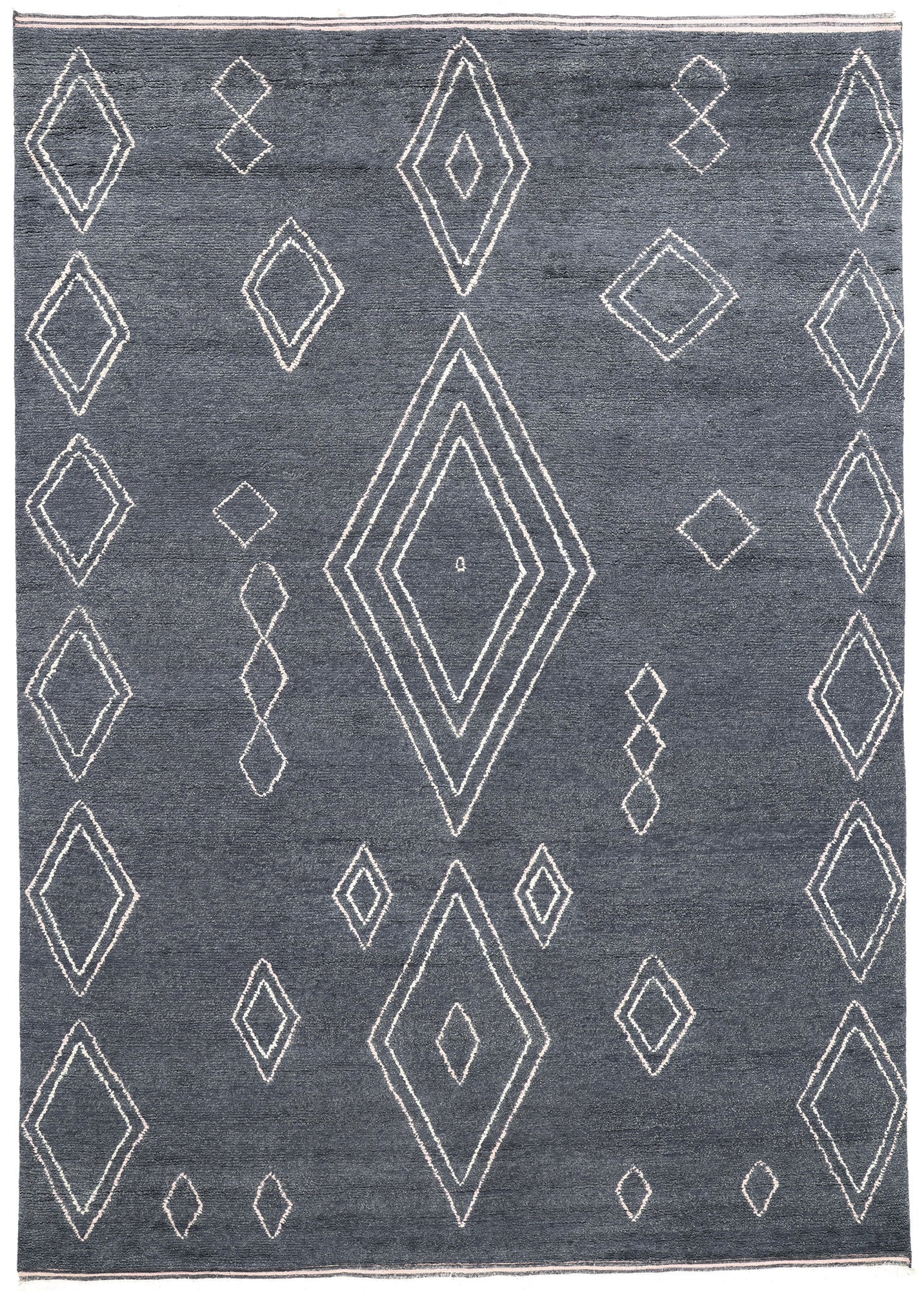 This hand knotted wool Celestial Nightfall Modern Moroccan Rug is a mesmerizing example of how Moroccan style can meet contemporary elegance. Handcrafted with precision, this Moroccan area rug features a deep navy blue field that evokes the calm and mystery of a starlit evening sky. The contrast between the rich background and the light pink and ivory diamond patterns creates an enchanting visual interplay that brings life to any interior space. The repeating geometric motifs, with their minimalist yet bold design, draw the eye and offer a sense of structure and harmony.