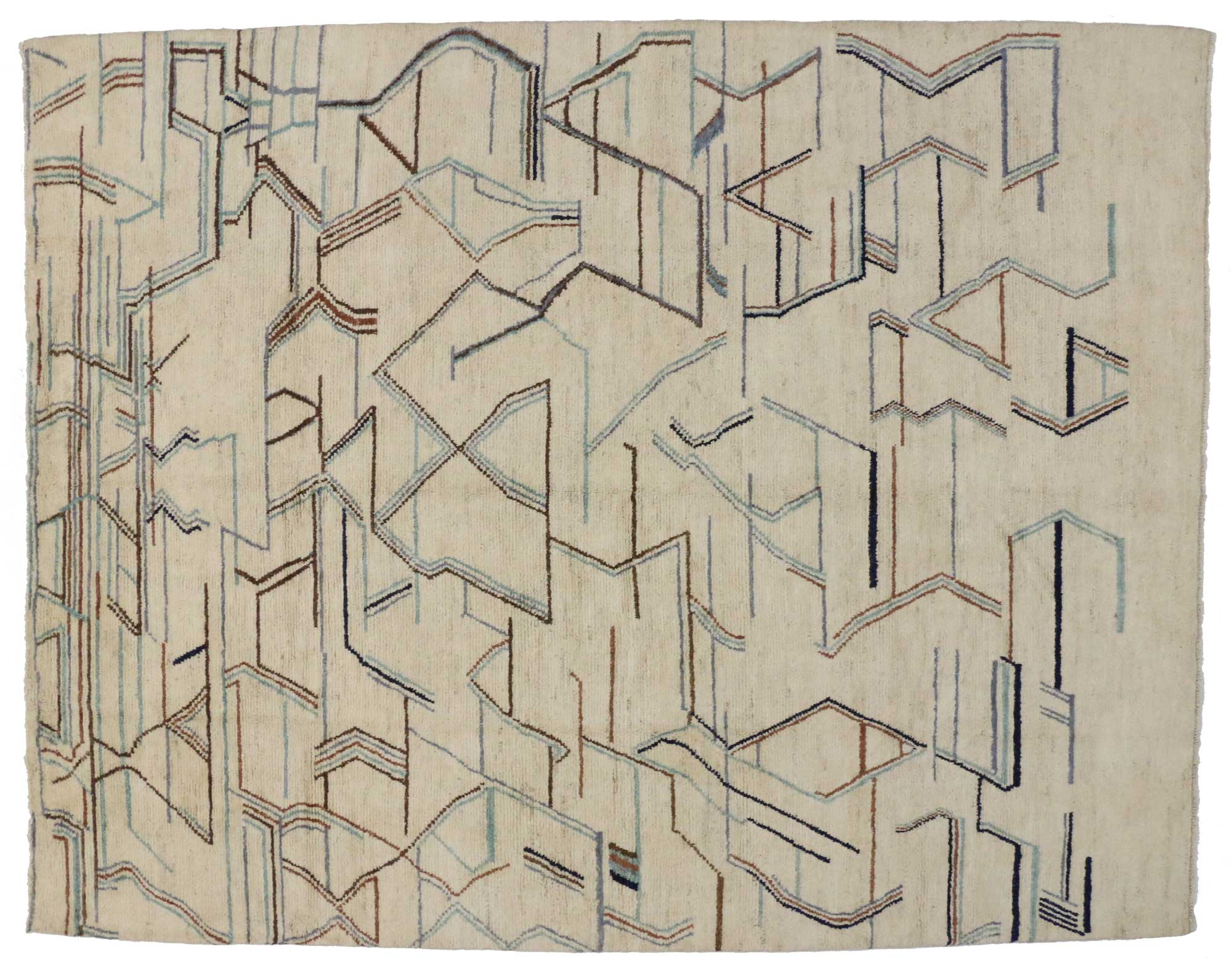 Contemporary Moroccan Style Area Rug in Cobalt Blue, 10'2" x 13'1" From Esmaili Rugs Collection. This beautiful Moroccan style rug showcases a series of asymmetrical auburn red spots produce a mesmerizing optical effect over the entire composition. With its uneven proportions combined with Folk Art creativity, this Moroccan style rug is an impeccable representation of Primitive tribal design in the 21st Century. Giving a youthful and whimsical feel, this area rug will add much-needed color, warmth and texture to contemporary or modern interiors. Measures: 10'2" x 13'1".