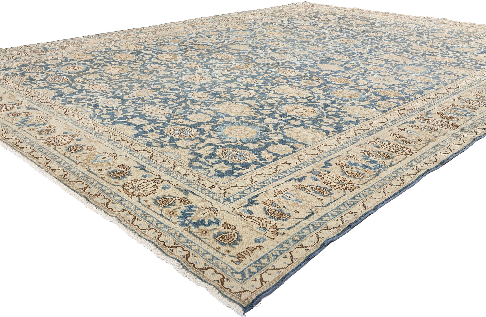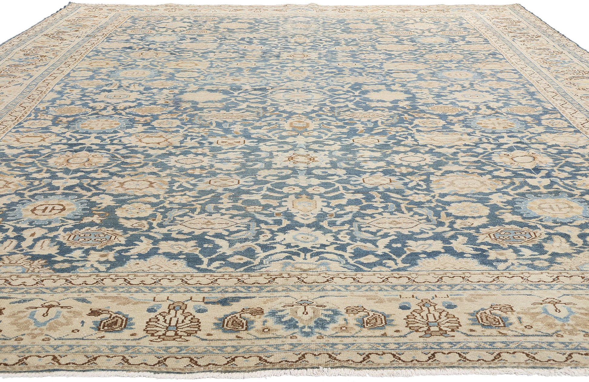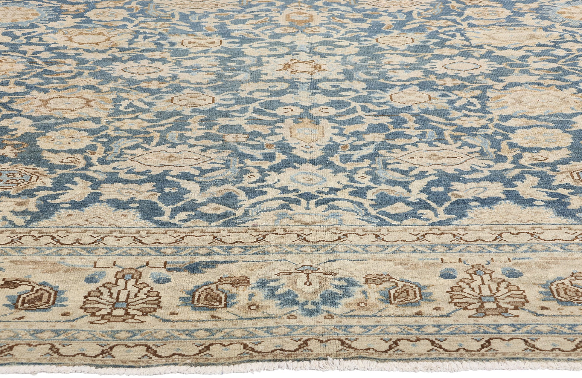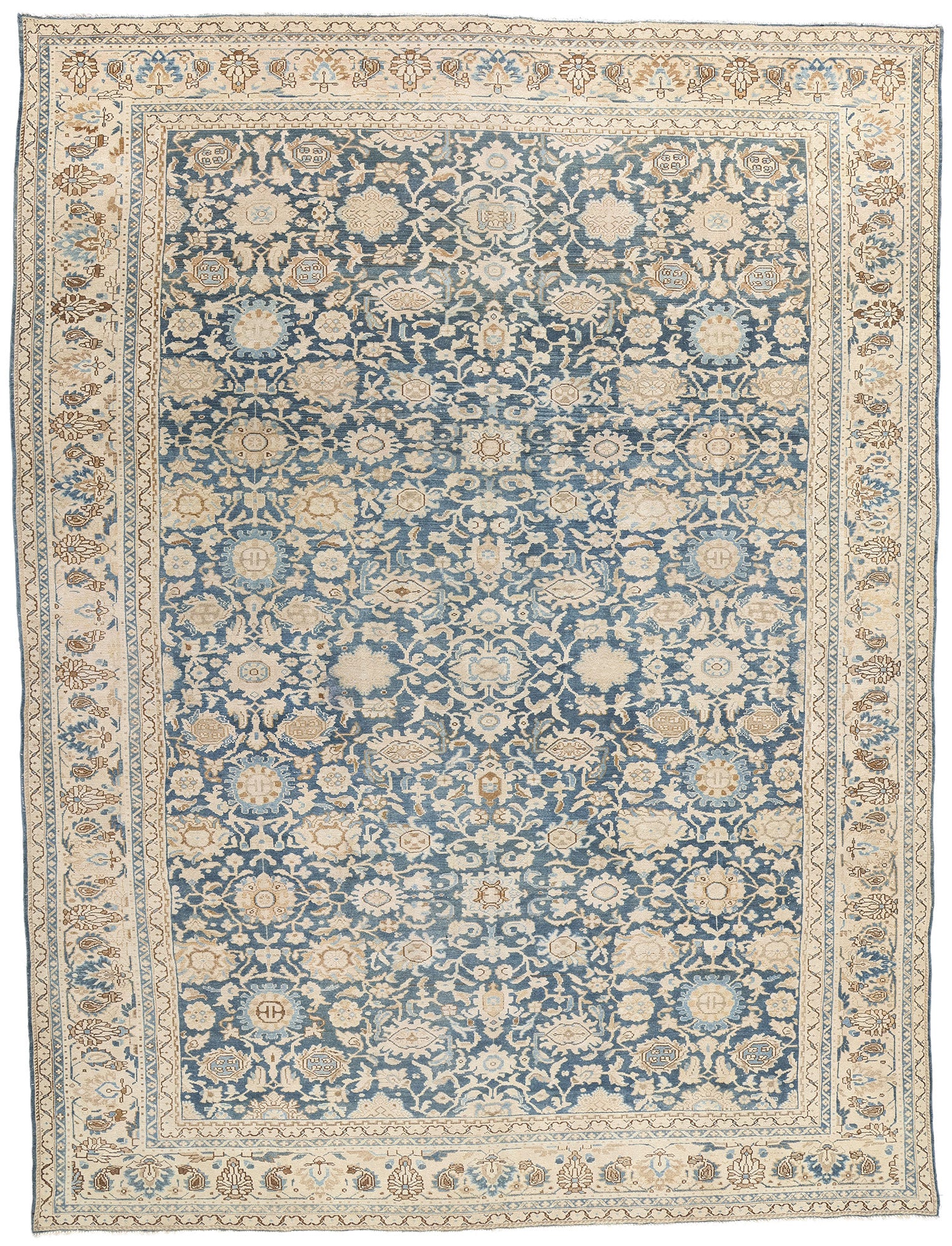 The framing of the Persian rug further enhances its refined appeal. A Shah Abbas palmette border, known for its regal floral motifs, encloses the central field with a sense of grace and structure. Flanked by a series of inner and outer floral meander guard borders, the delicate borders subtly dissolve into the overall design, achieving a "barely there" effect that amplifies the rug’s ethereal quality. These design elements work in harmony, emphasizing the Malayer rug’s cohesive and tranquil aesthetic.