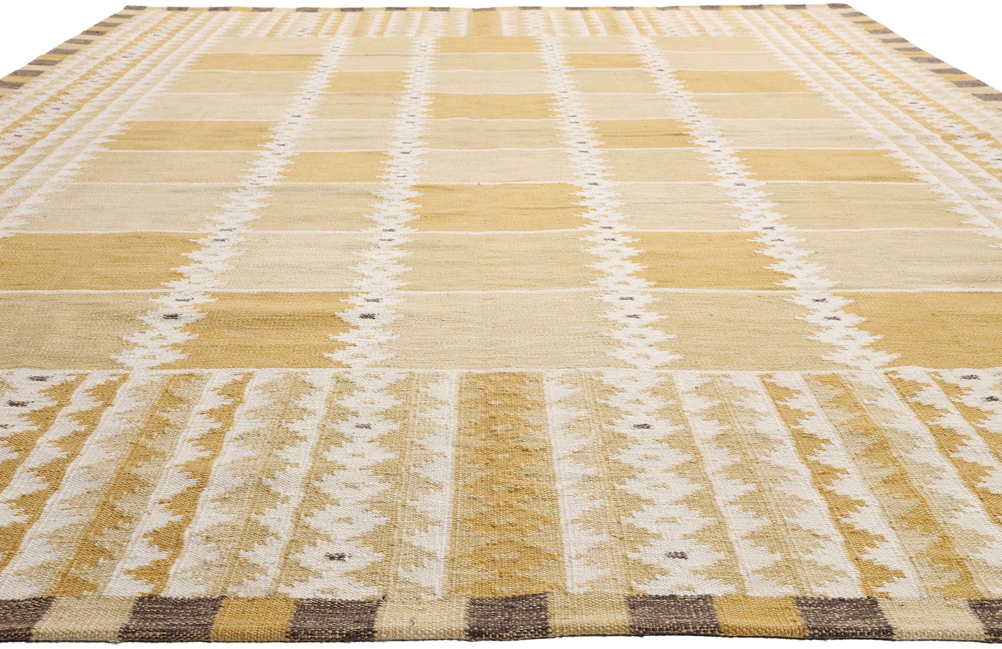 This handwoven wool Swedish-inspired Indian kilim rug captures the essence of Scandinavian Modern design while introducing a fresh and innovative interpretation. Its clean lines and geometric motifs blend simplicity with visual sophistication, creating a harmonious balance of form and function. The rug’s golden striated field features an engaging checkerboard pattern of alternating squares, accented with vertical bands of small geometric shapes. The design is enclosed by a bold geometric border and a checkered outer guard band, adding structure and a sense of order.