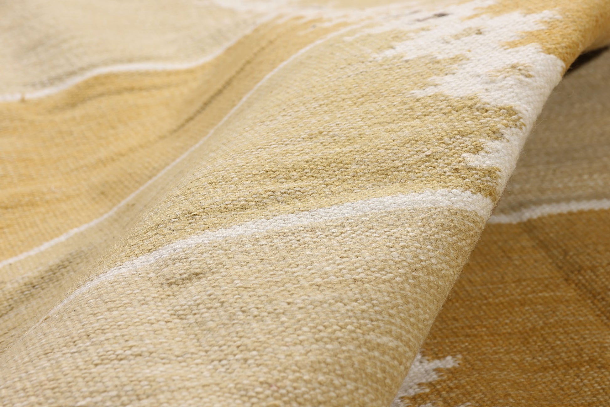 The palette of warm earth tones and golden hues enhances the flatweave rug’s inviting aesthetic. Rich abrashed striations, reminiscent of soft brushstrokes, flow seamlessly across the surface, lending depth and texture to the design. These gradations harmonize the colors, creating a unified composition that blends seamlessly with a variety of interior styles. Rather than imitating traditional Scandinavian patterns, this kilim rug’s motifs and shapes offer a creative reinterpretation that stands apart from any specific historic design.