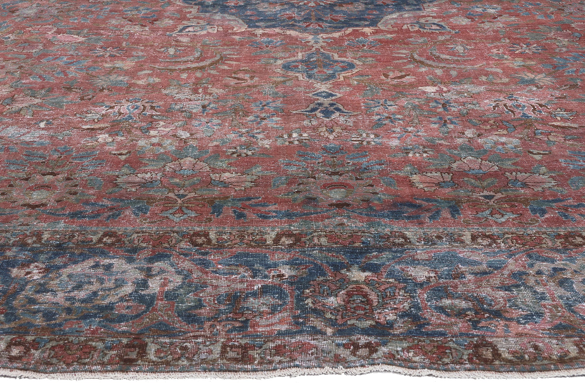 Rustic elegance meets traditional sensibility in this hand knotted wool antique worn Persian Tabriz rug. The bucolic design and traditional color palette woven into this piece work together creating a relaxed organic vibe. An allover botanical pattern covers the field and encloses the central medallion. It is framed with a classic palmette border. The subdued hues and no-fuss design aesthetic of this antique Persian rug work well with the rustic and refined look. Iconic in its styling, this distressed Tabriz rug is the perfect complement to interiors with similar richness and rustic vibes including natural wood furnished chalets, estates, cottages, and mountainside abodes as found in Colorado, Lake Tahoe, Wyoming or the Adirondacks.