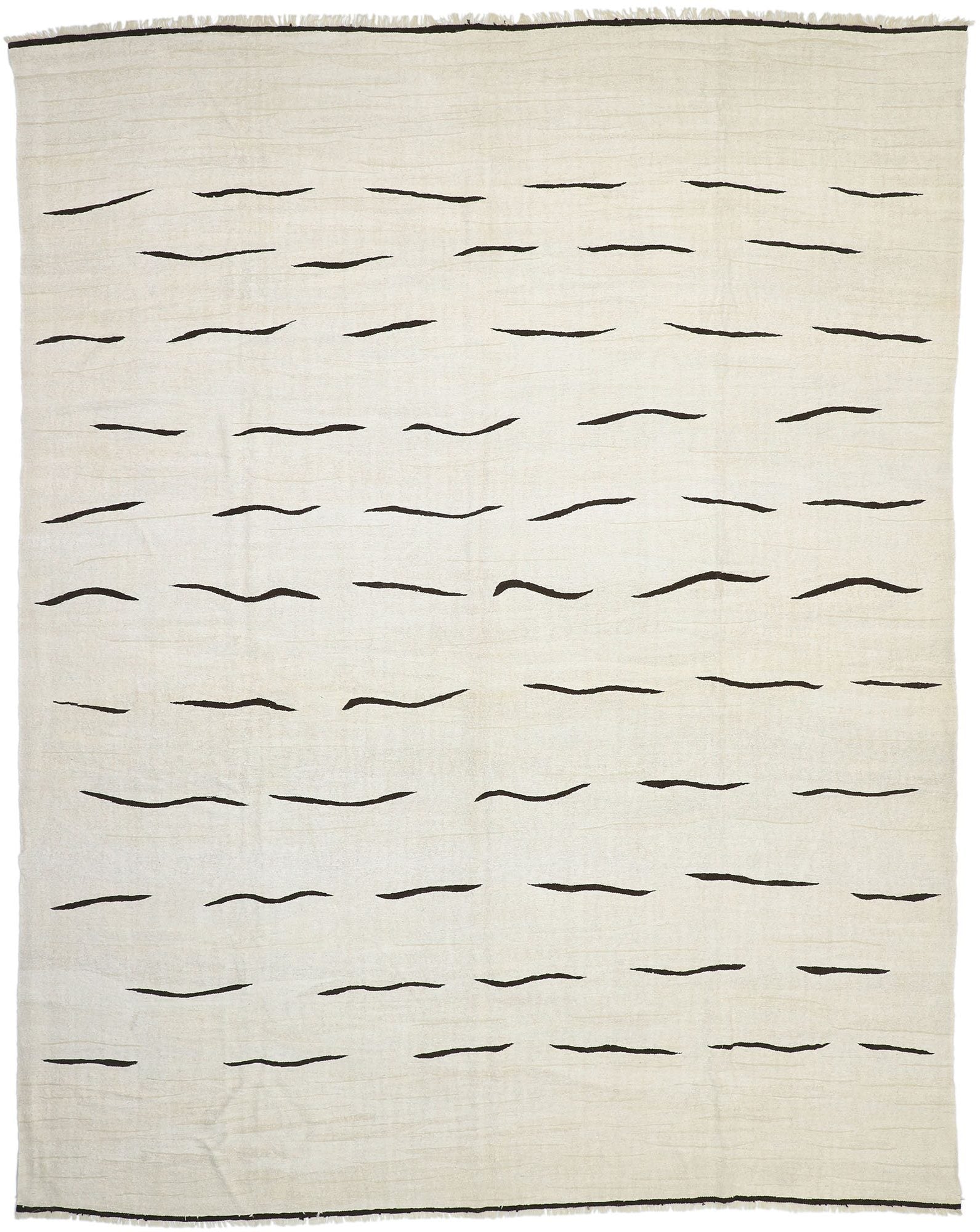 52625 Vintage Turkish Kilim Rug with International Minimalist Style, Oversized Kilim Area Rug. The expressive design and clean sophistication in this handwoven wool vintage Turkish Kilim rug beautifully embodies Minimalist style. It features a series of horizontal dark colored lines on a creamy beige backdrop. The highly effective use of negative space and the linear forms running across the composition combined with a sense of balanced asymmetry create movement within the piece. With its functional versatility, subtle yet bold art form, this large kilim rug would be particularly at home in an interior inspired by Victor Pasmore or Cy Twombly. Evoke a modern luxe experience by adding organic tactile sensations to a great room, living room, front room, bedroom, family room, home office, game room, studio, study, urban loft, man cave, or large lounge area. Well-suited for a wide range of interior styles: International, Minimalism, Orphism, Biomorphism, Bauhaus, Art Deco, Cubism, Contemporary, Abstract, Modernist, Art Moderne, Eclectic, Organic Modern, Industrial, Hygge, Surrealism, Mid-Century Modern, Urban, and Loft interiors. Rendered in variegated shades of beige, espresso, and coffee with neutral striations. Abrash. Hand knotted wool. Made in Turkey. Measures: 11'02 x 14'01.