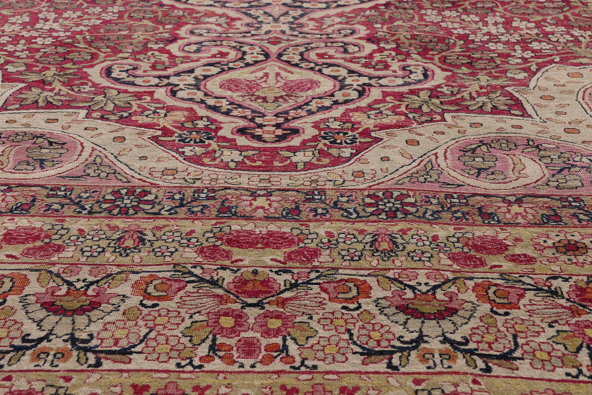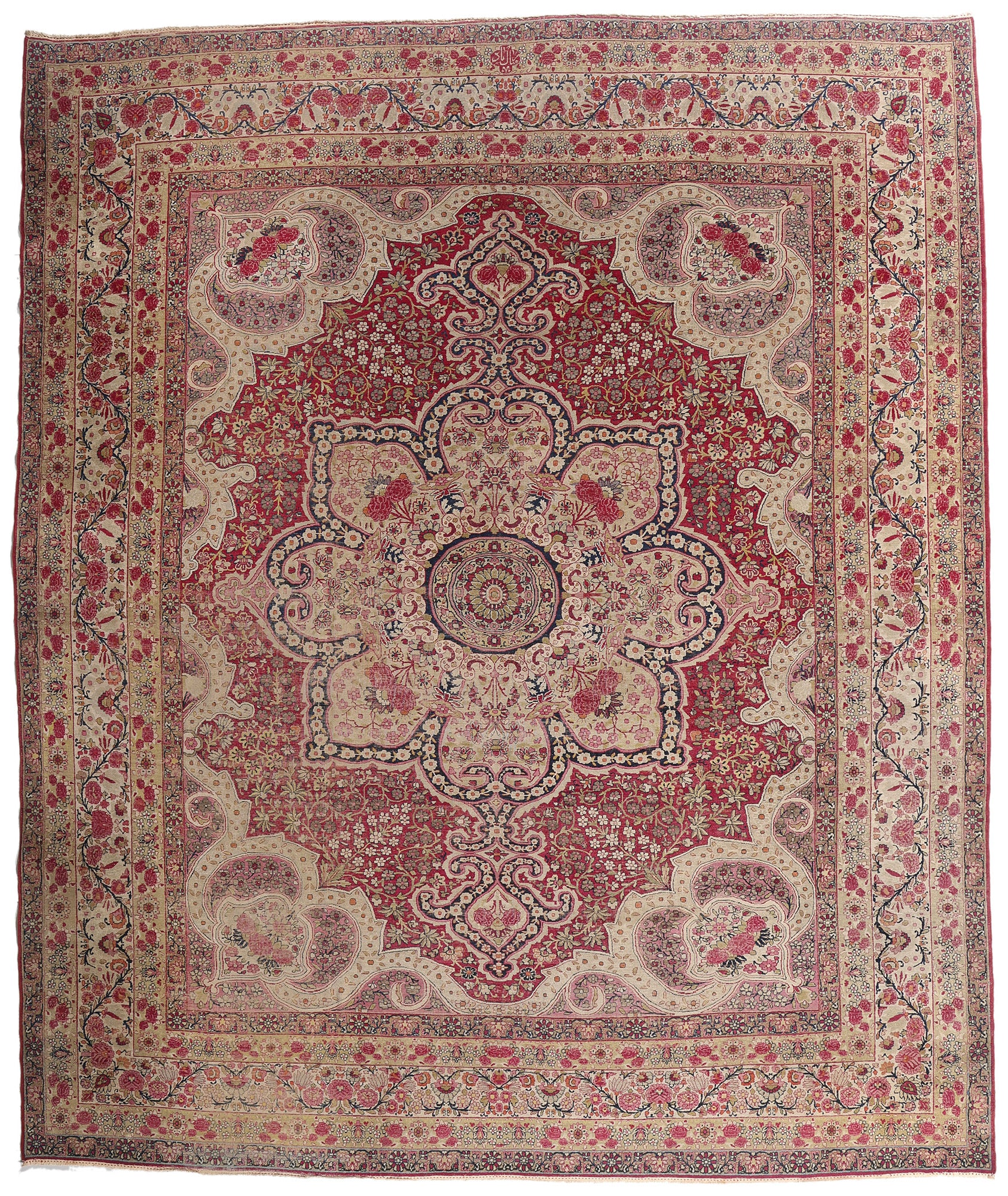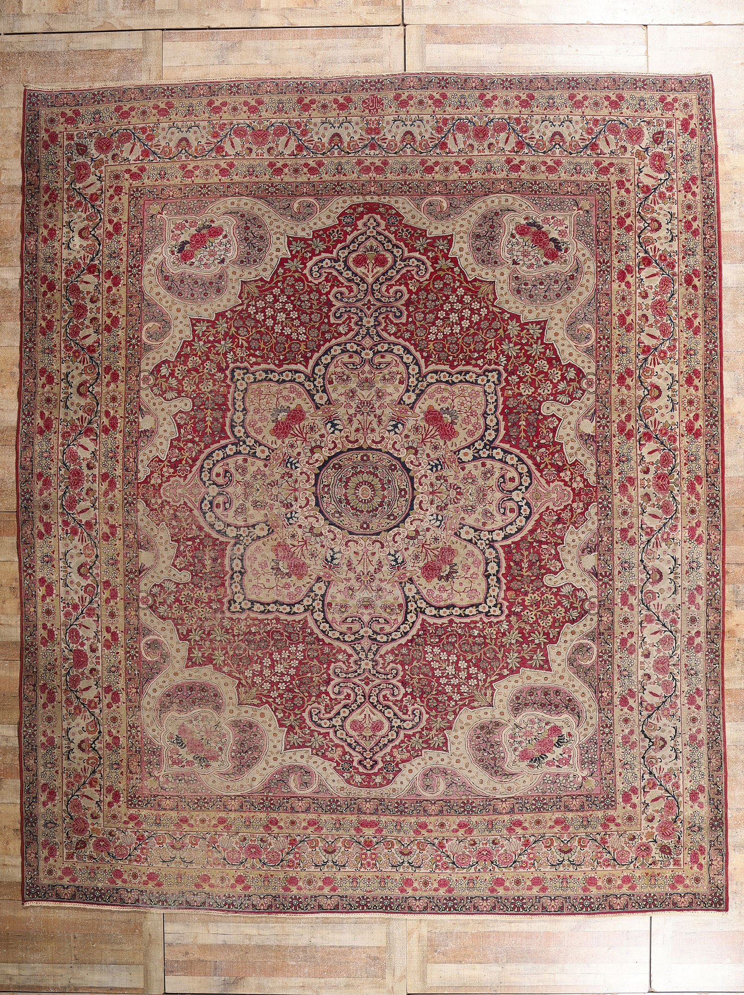 Surrounding the medallion, a rich red field unfolds in a dense millefleur arrangement, alive with countless blossoms and leafy tendrils that seem to bloom endlessly across the surface. Elaborate pink corner spandrels mirror the medallion’s arabesque contours, filled with cartouches and floral bouquets that echo Safavid court manuscripts and palace textiles. The visual rhythm is immersive and deliberate, rewarding close study while maintaining a powerful sense of harmony from a distance.