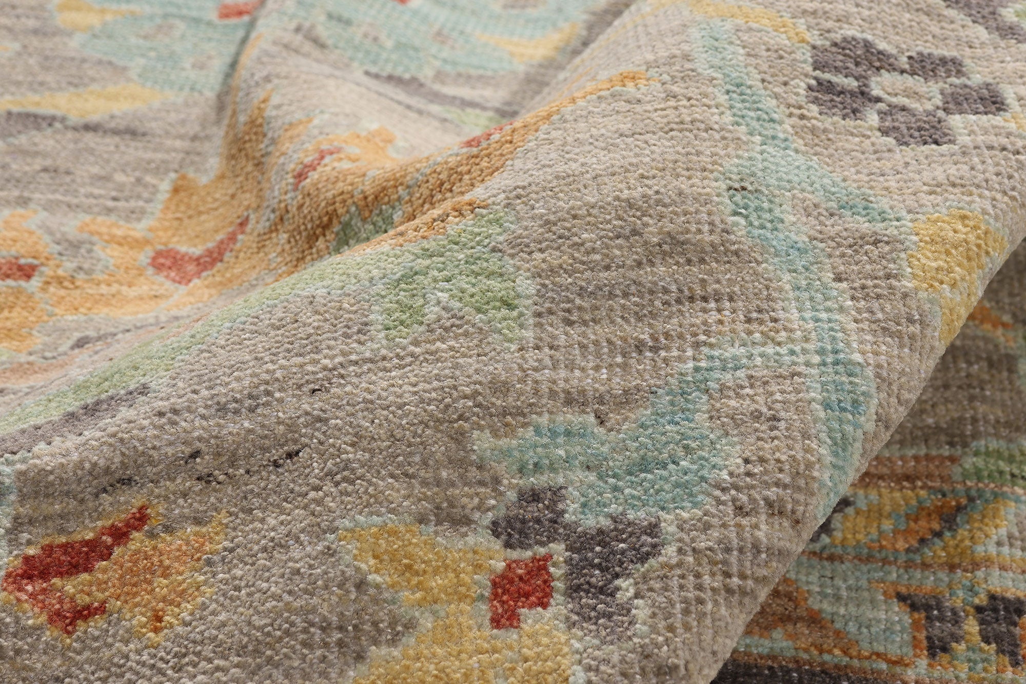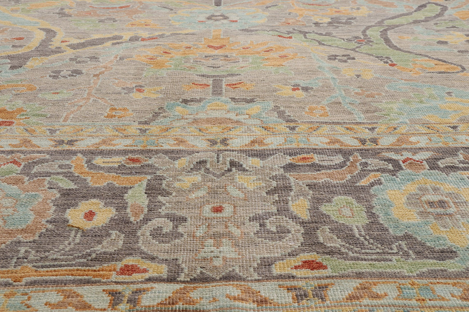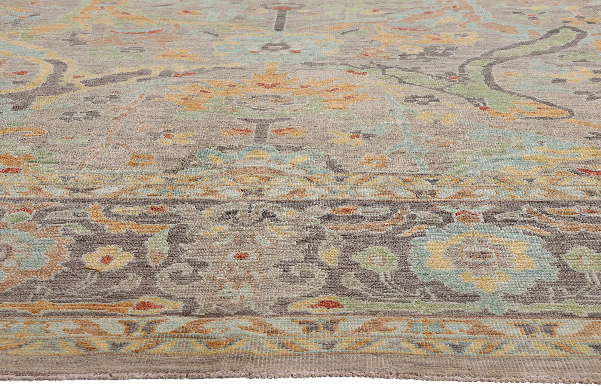 This hand-knotted wool modern Sultanabad rug is a study in restrained grandeur, where heritage scale meets contemporary calm. Woven in Pakistan in the spirit of classical Persian Sultanabad carpets, the exceptional composition unfolds across a softly abrashed gray field whose natural striations read like drifting mist or weathered stone. The surface carries an unmistakable sense of age and authority, yet feels quietly modern—an object that commands a room without ever raising its voice.