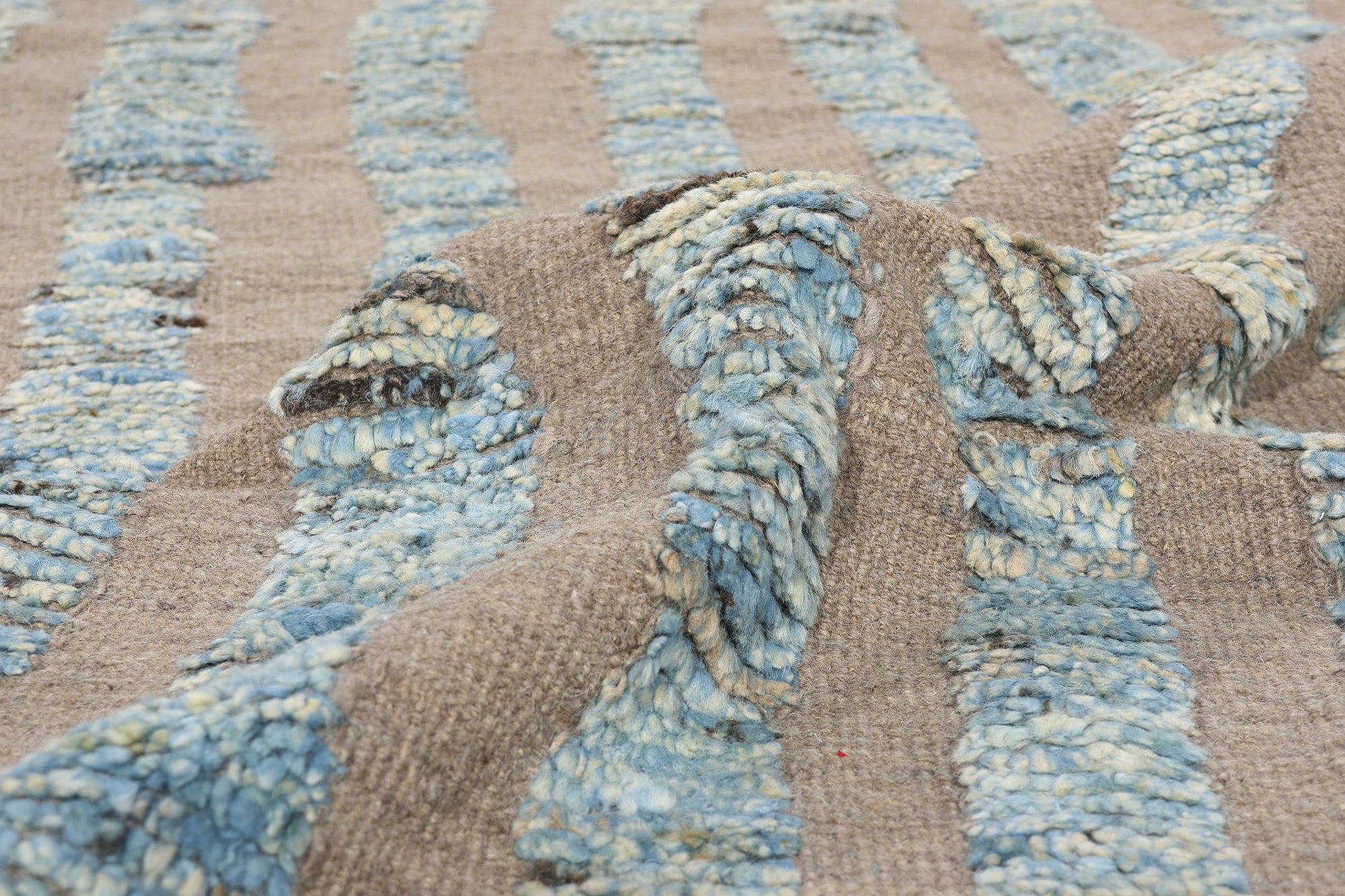 This hand-knotted wool modern sculpted waves Moroccan rug exudes an irresistible allure, drawing the viewer into its captivating texture and gentle movement. The piece is a harmonious interplay of fluid lines, where the gray backdrop is enlivened by alternating waves of soft blue, creating an impression of the sea's undulating embrace. Each curve is carefully woven to evoke the natural rhythm of water, creating a serene yet dynamic composition that offers both visual tranquility and a sense of energy.