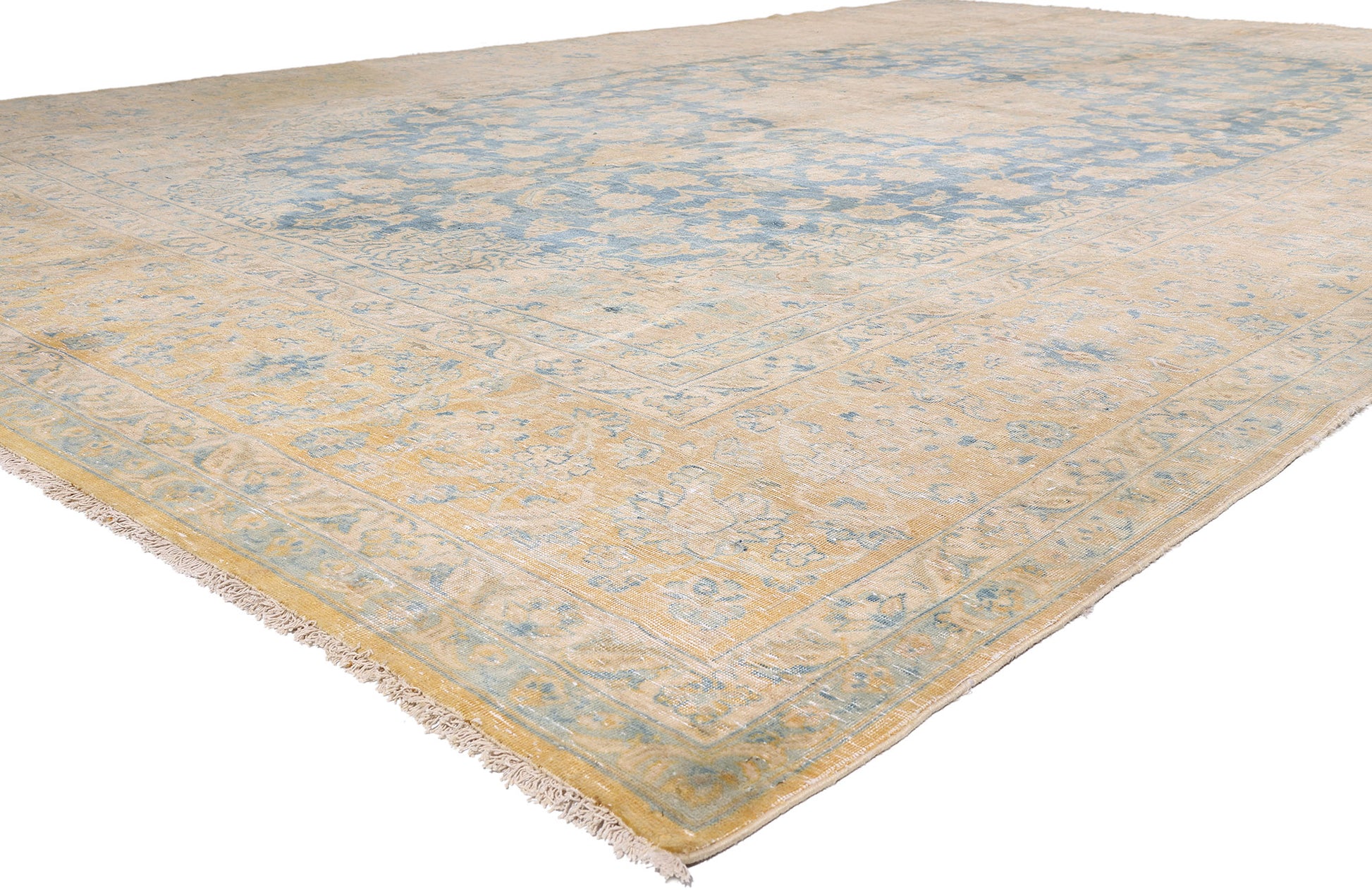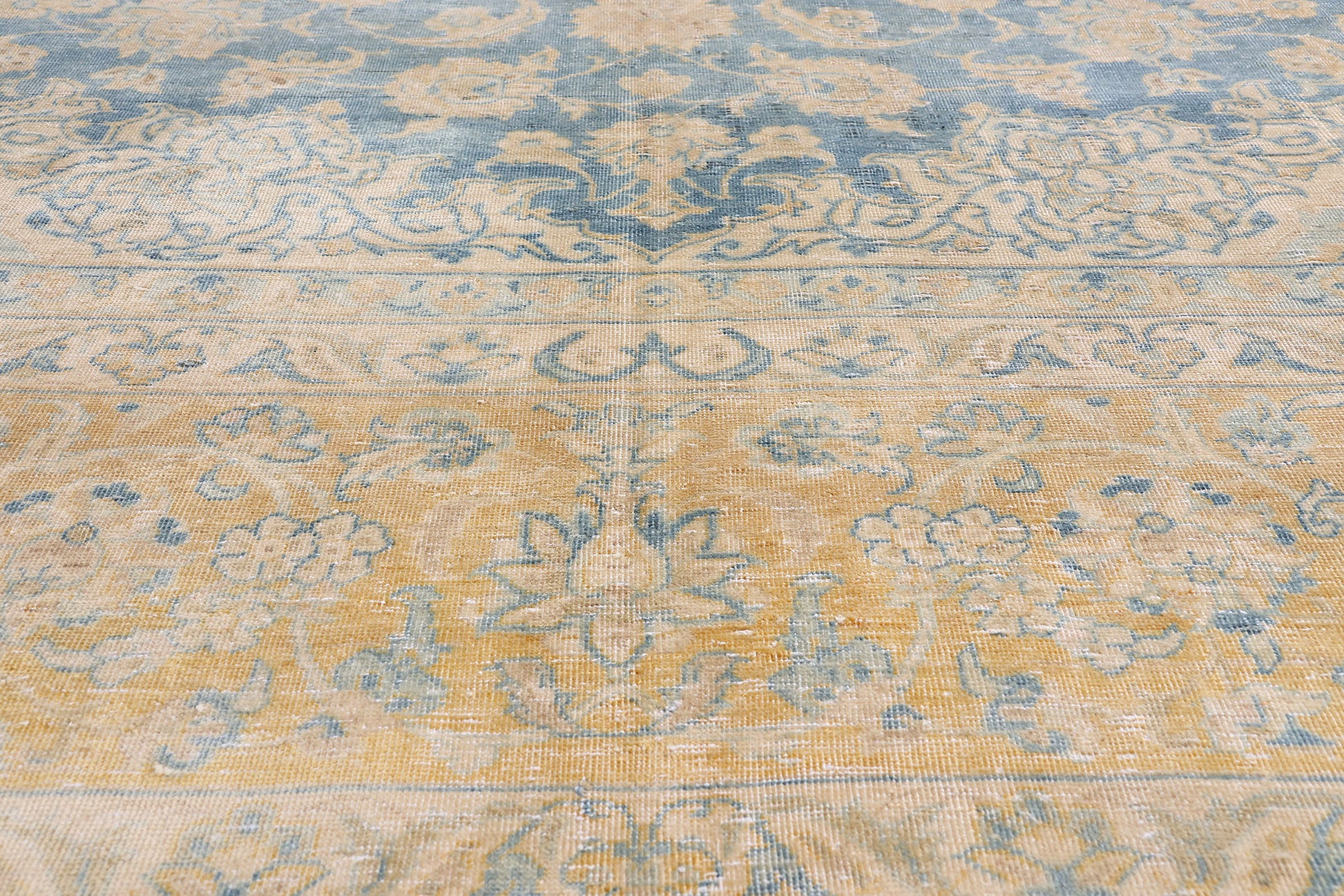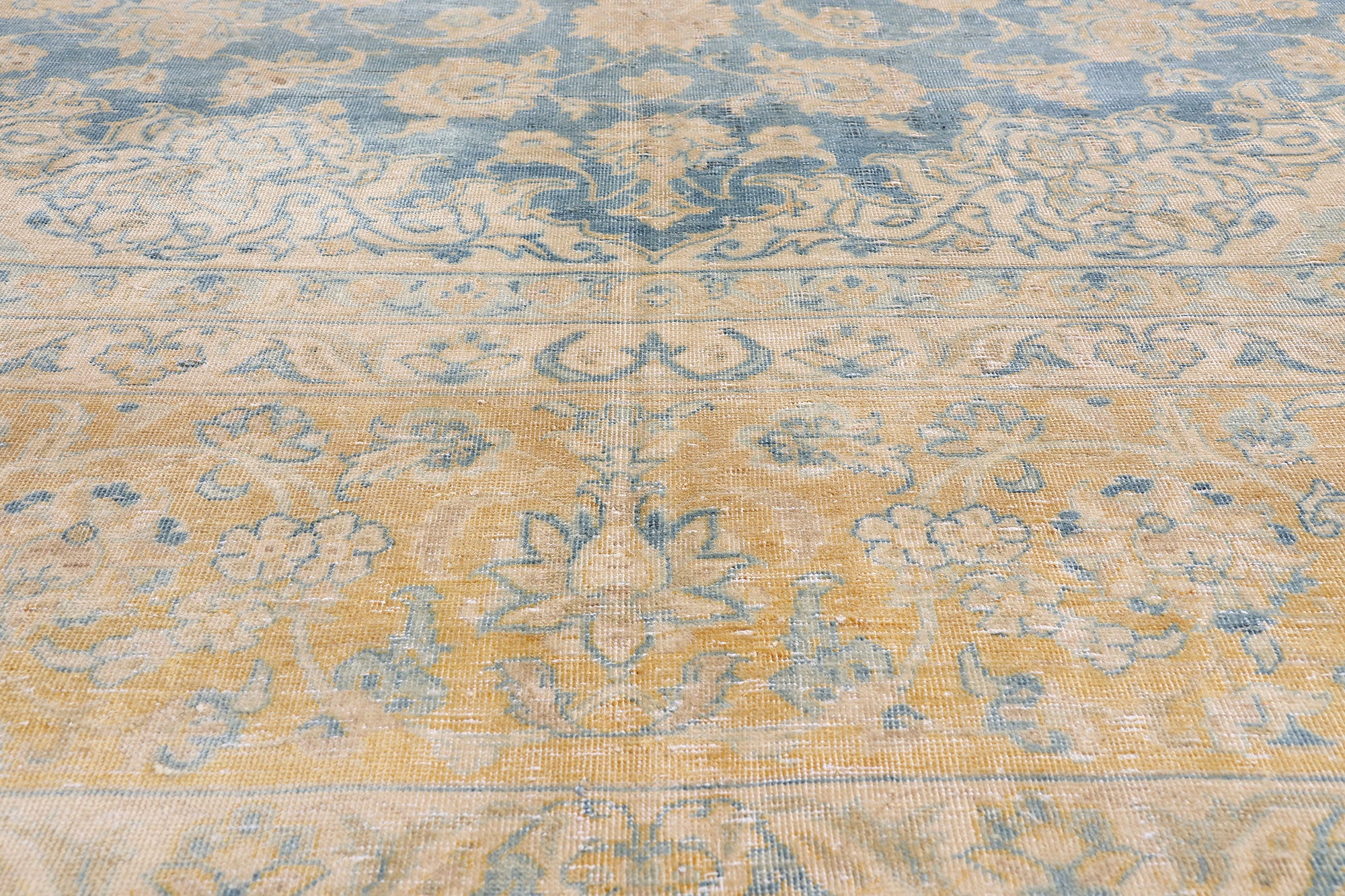 Its border is a triumph in itself: a grand floral frieze embraced by dual meandering guard bands, a structure that reinforces the regal discipline of classical Persian design. As the tones fade from sky blues to parchment creams and whispery golds, the border seems to illuminate the entire composition, offering the visual equivalent of candlelight shimmering across aged plaster walls—a luminous, atmospheric quality only the finest antique carpets achieve.