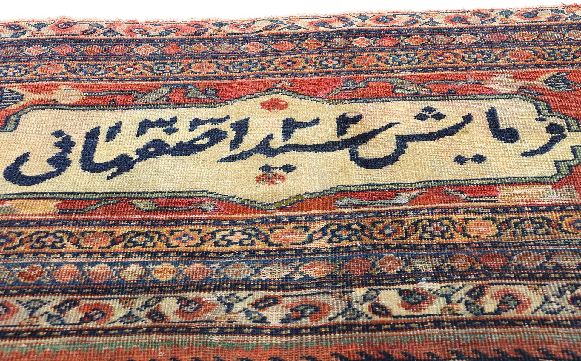 A particularly unique feature of this rug is the cartouche inscription in the main border, which reads, "یا شاه عبدالعظیمی" (Ya Shah Abd al-Azim), meaning "Oh Shah Abd al-Azim." This phrase pays homage to Shah Abd al-Azim, a revered spiritual figure associated with the historic shrine in Rey, Iran. The inclusion of this inscription not only adds a layer of historical and spiritual significance but also serves as a testament to the commemorative and devotional purposes of Persian rugs. Such inscriptions are rare and highly prized, making this antique Persian rug an extraordinary piece for collectors and connoisseurs alike.
