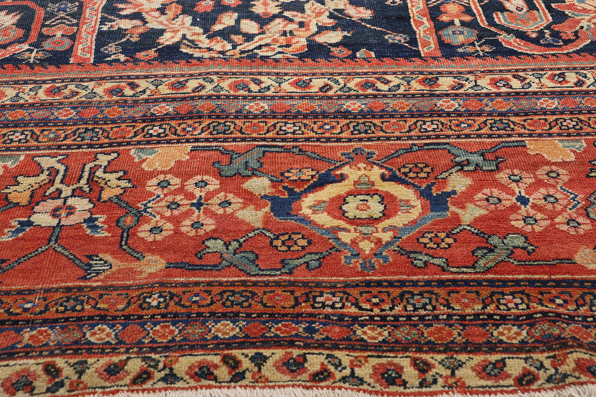 This exceptional hand-knotted wool antique Persian Sultanabad Mahal rug showcases the renowned Mustafavi pattern, a design steeped in Islamic tradition and cultural significance. Named after Mustafa, an epithet of the Prophet Muhammad meaning "the chosen one," the Mustafavi pattern embodies the spiritual essence and artistic grandeur of Persian and Islamic art. The navy blue field of this Persian masterpiece is resplendent with intricate floral and arabesque motifs, meticulously arranged to create a sense of harmony and balance that reflects the ethos of infinite beauty and divine perfection in Islamic art.