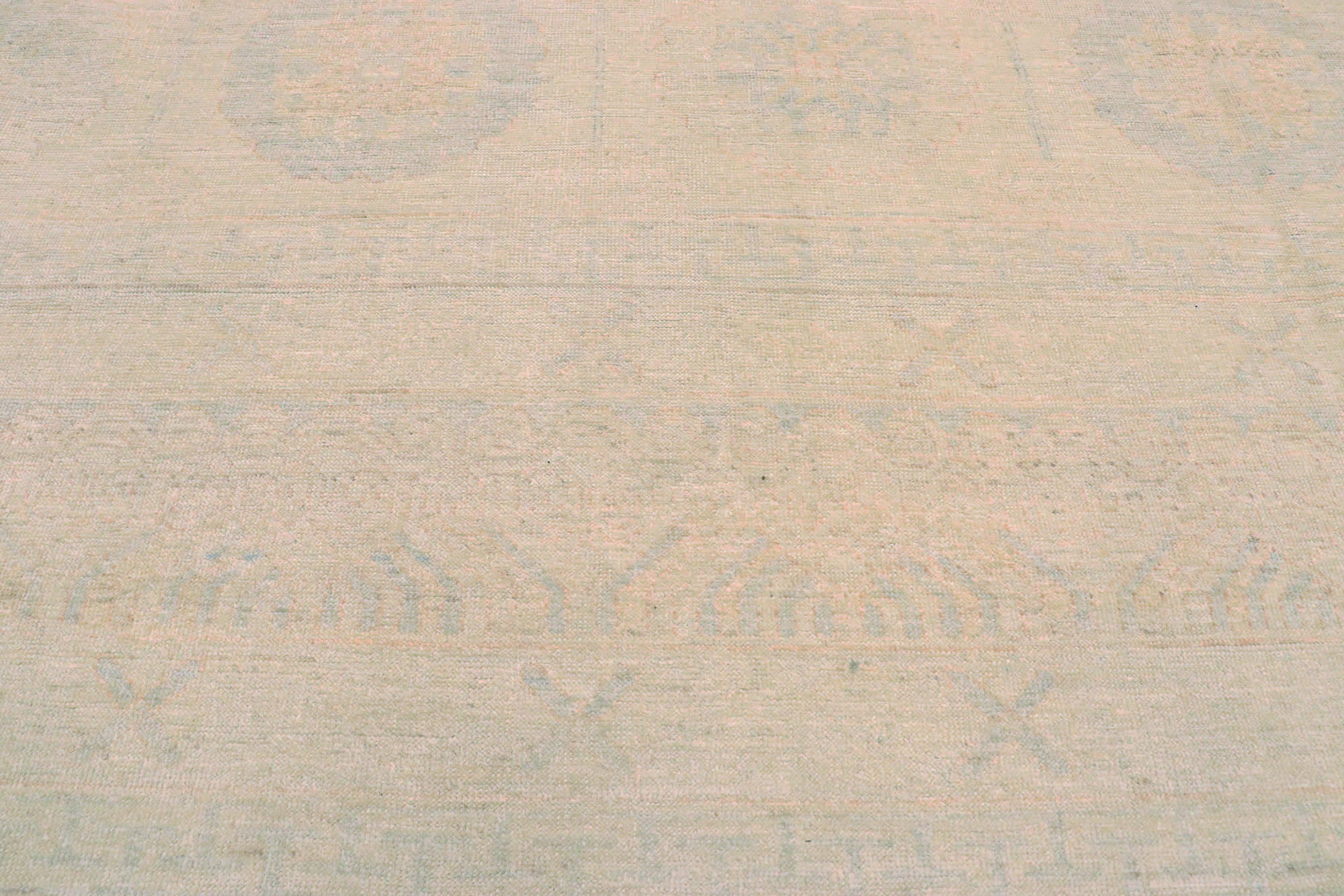 Rooted in tradition yet expressed with modern restraint, this hand-knotted wool Khotan-style rug from Pakistan embodies the serene balance between heritage and contemporary refinement. Its neutral beige field, softly layered with tonal variations of warm sand and whispering blue, radiates an aura of tranquility and sophistication. Evoking the timeless principles of Shibui design, the rug’s understated beauty reveals itself gradually—never ostentatious, always profound. It is a piece designed for connoisseurs who seek quiet luxury, where texture, tone, and craftsmanship merge into pure harmony.