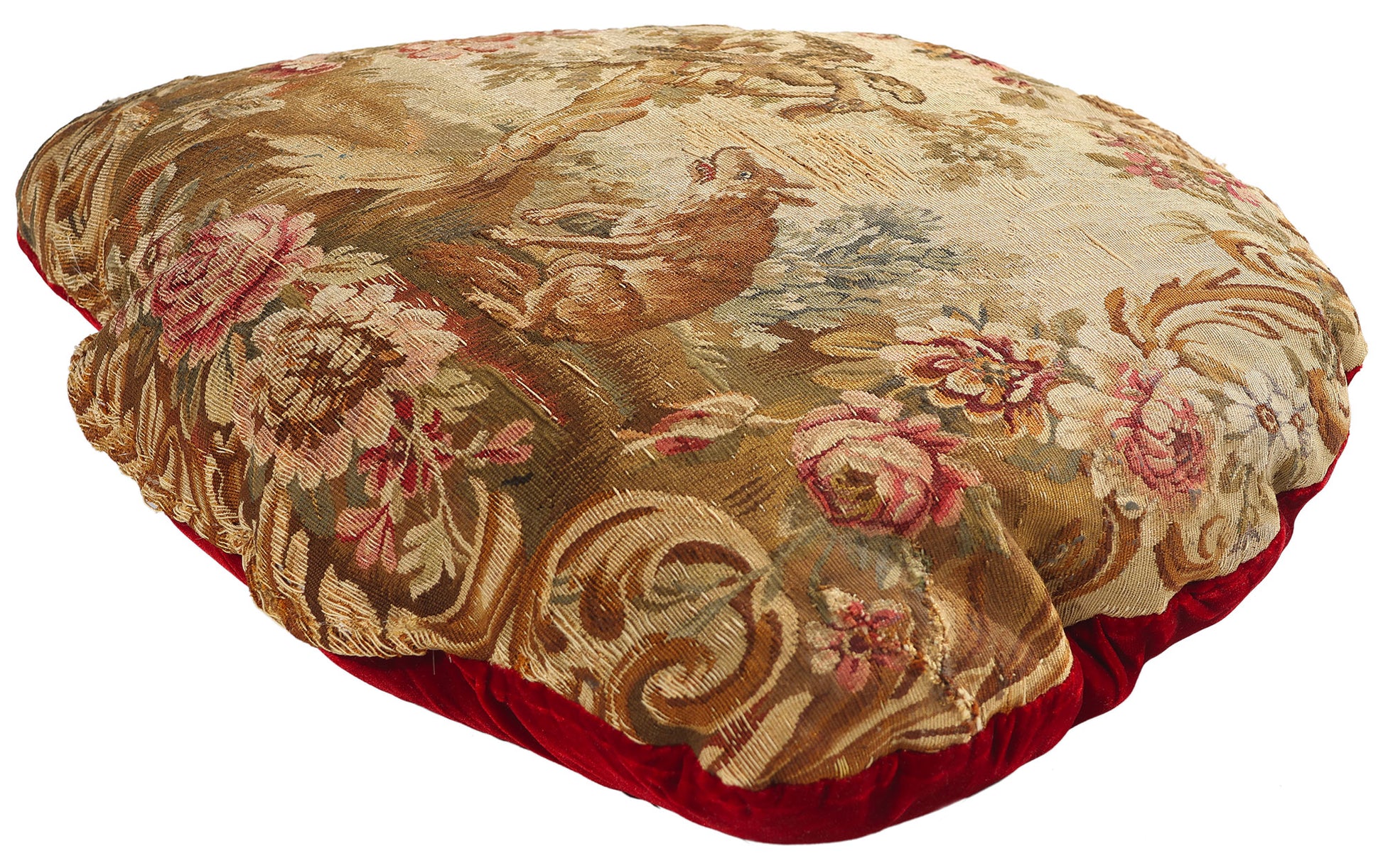 Beneath the pastoral charm lies the hallmark of the Aubusson tradition: a low-warp tapestry technique prized for its fine execution and seamless color transitions. This cushion, originally born of a larger wall tapestry fragment, has been lovingly preserved and reimagined with a sumptuous velvet backing—ensuring the legacy of the weaver’s hand continues to offer comfort and delight. The delicately frayed edges and mellowed palette speak not of wear, but of history—an aged beauty that softens with time, like a well-loved verse recited over generations.