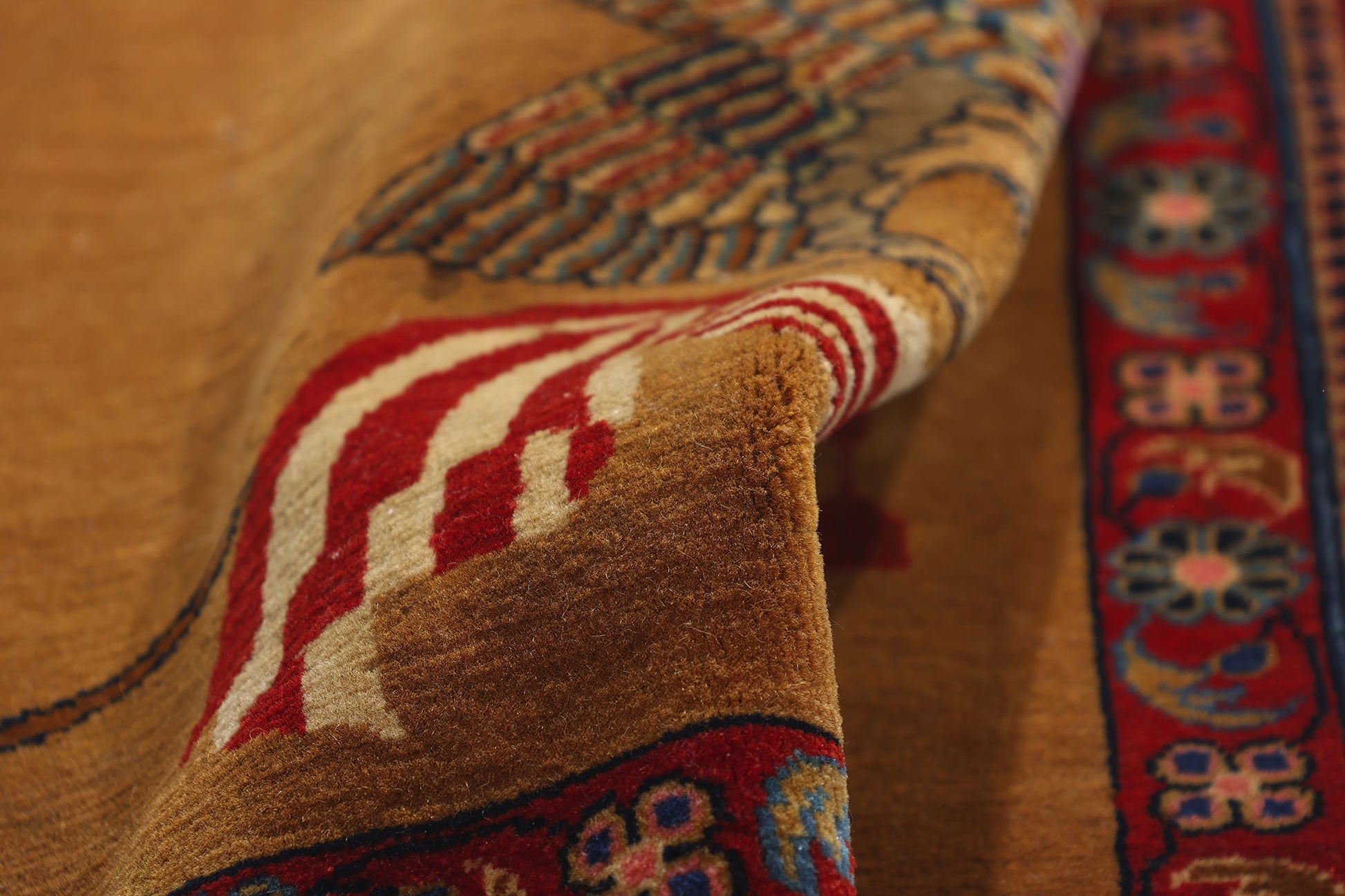Soaring with symbolic majesty and woven with the threads of cultural diplomacy, this antique Persian Kashan pictorial rug unfurls a rare and powerful tableau. Hand-knotted in lustrous wool during a moment of East-meets-West reverence, the composition is dominated by a noble eagle, wings arched in proud ascent as it clutches the American flag in its talons. Set against a warm, golden-brown field, this extraordinary motif reflects a confluence of traditions—where Persian artistry meets American iconography in a gesture of mutual admiration.