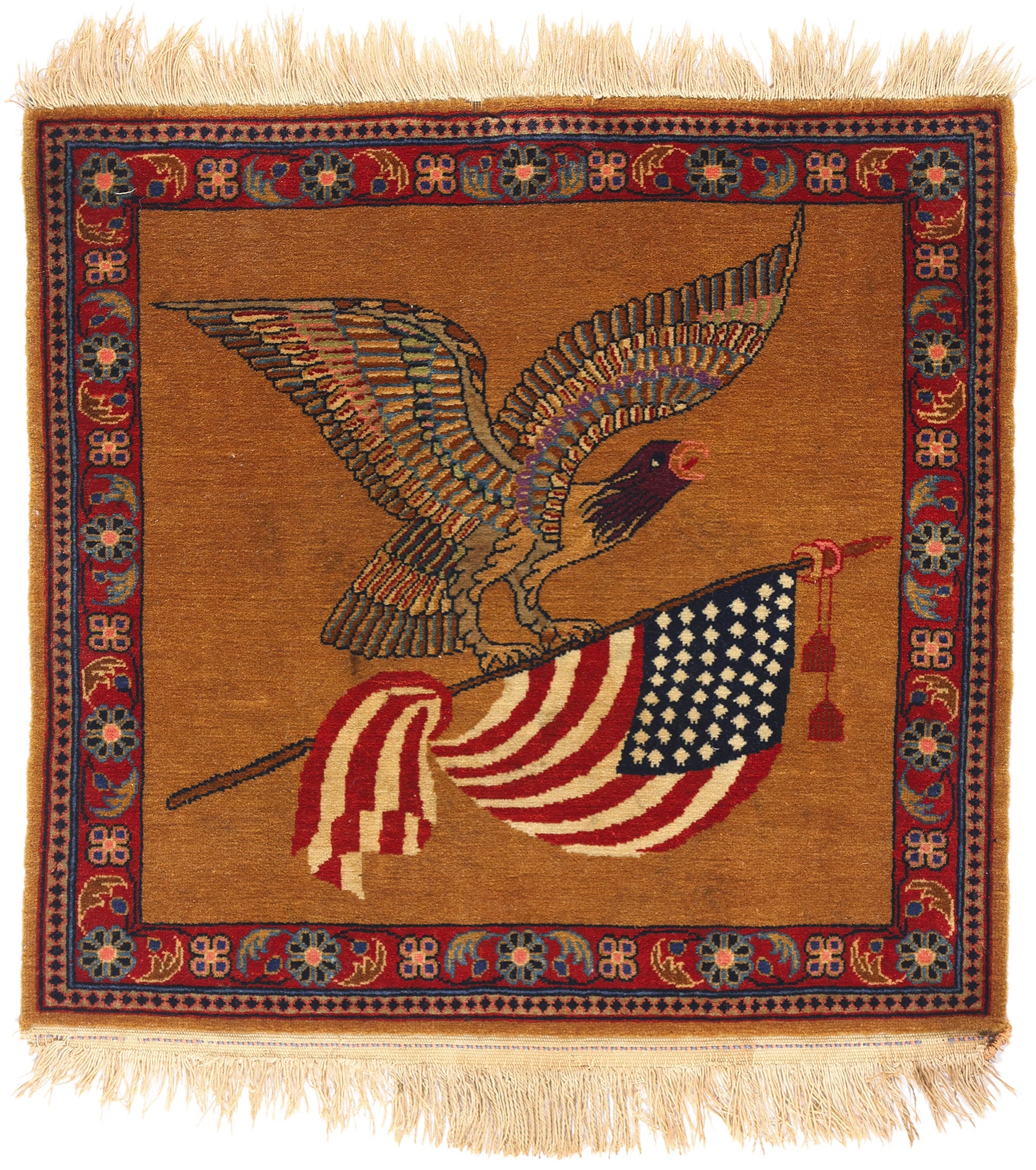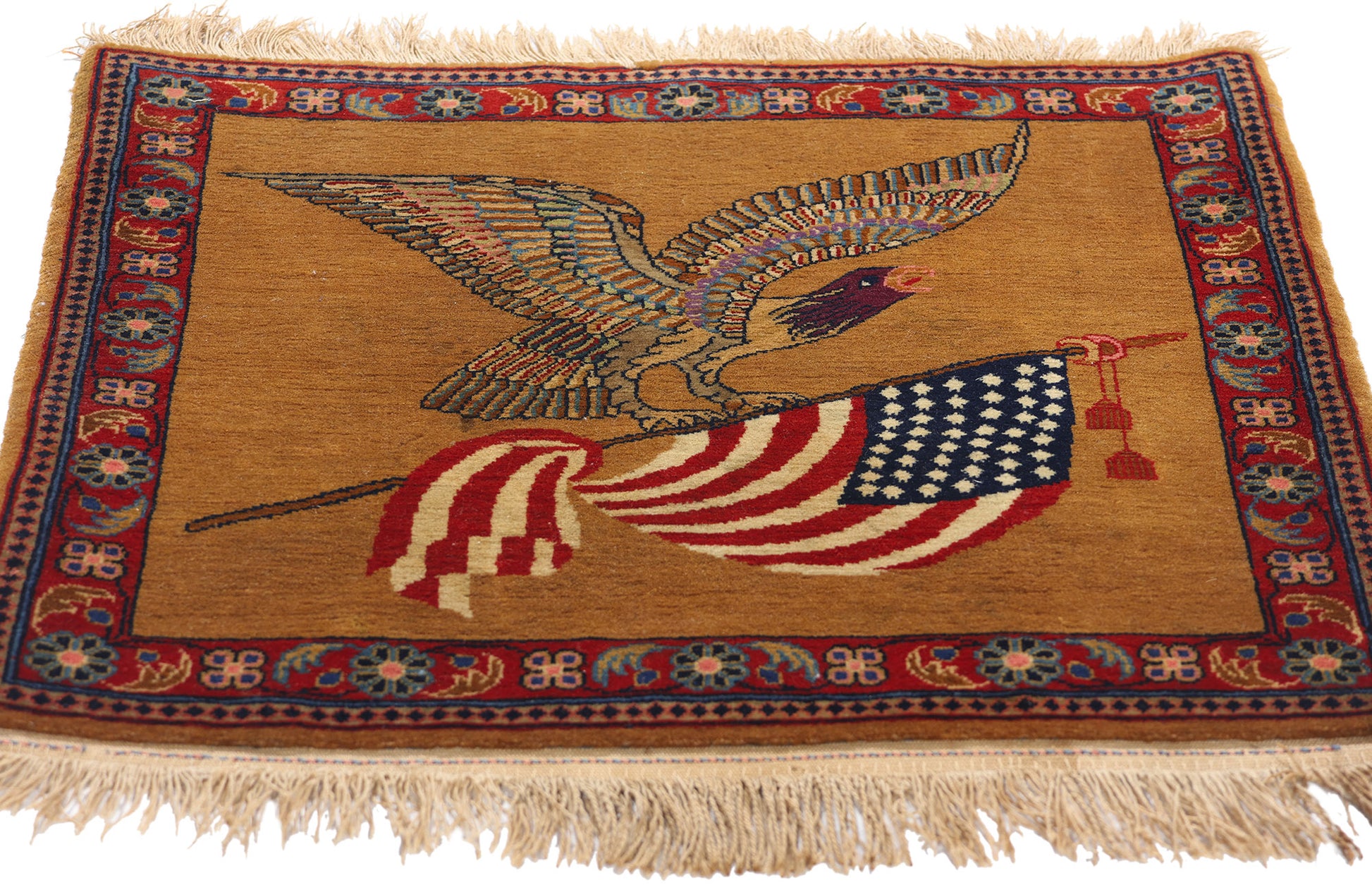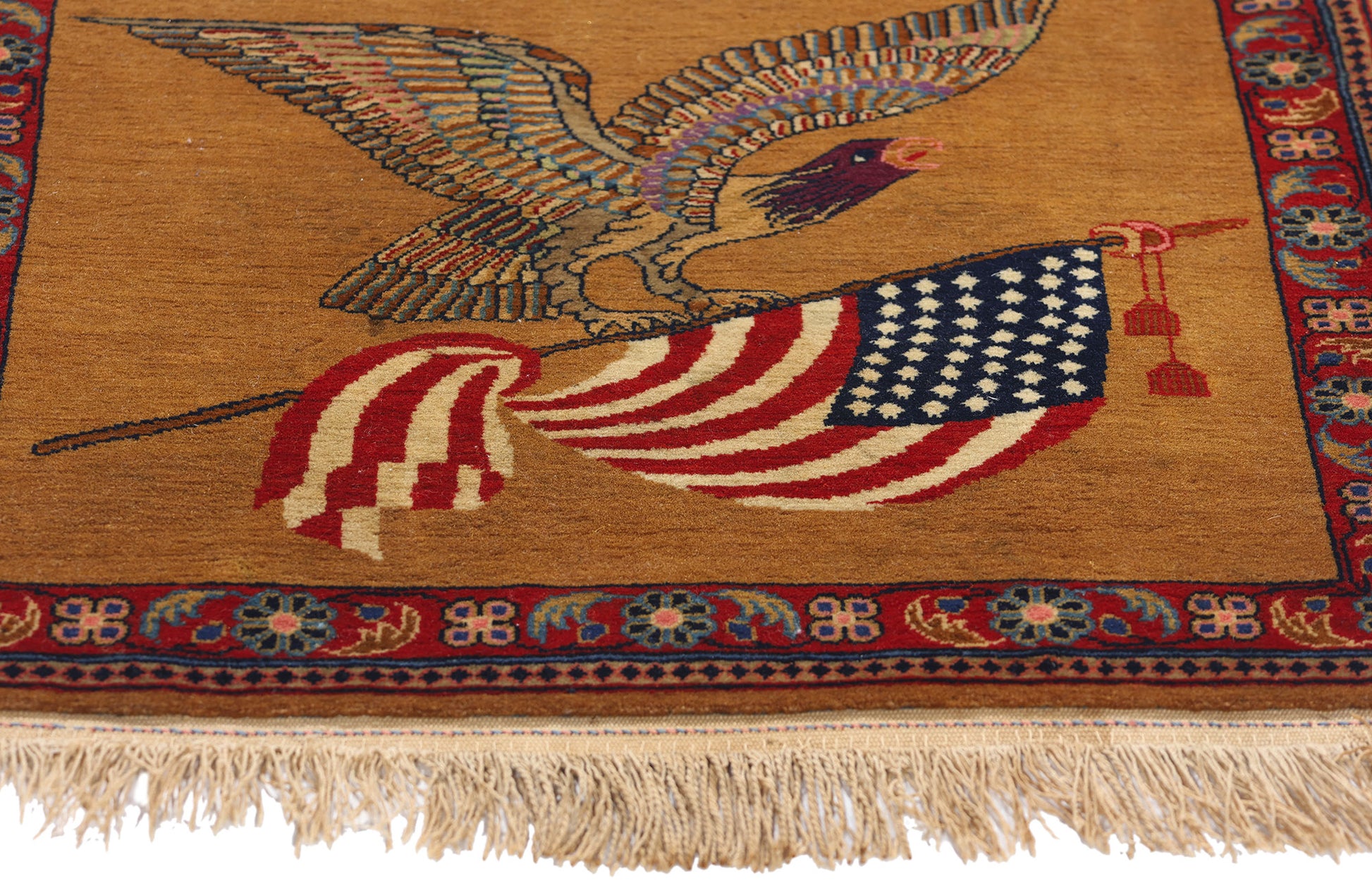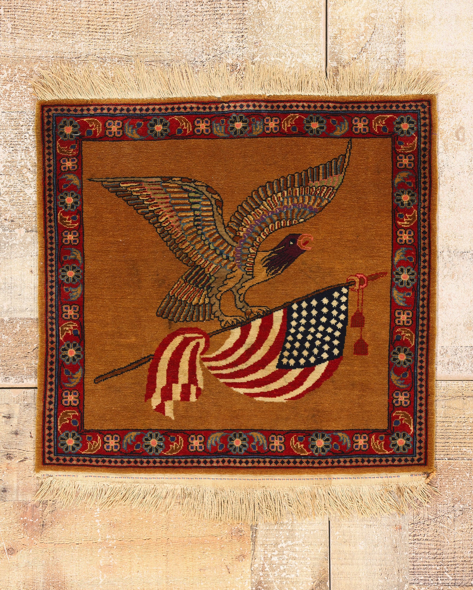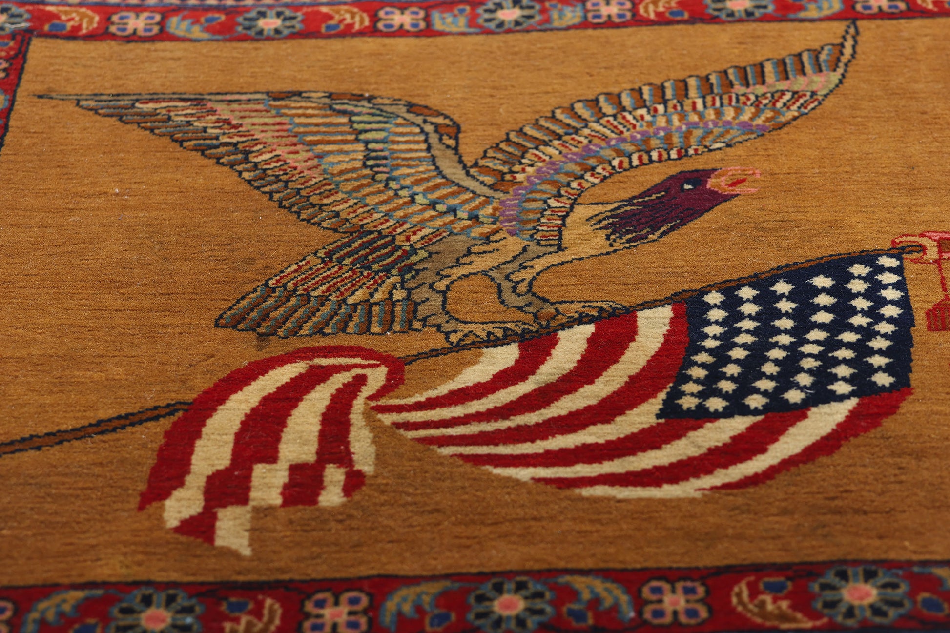 The eagle, a timeless symbol of strength and liberty, is rendered with stunning attention to detail. Each feather is carefully articulated in hues of umber, indigo, and earthen green, echoing the iridescent plumage found in Persian avian art. Beneath it, the American flag billows in red and ivory stripes, its navy blue canton dotted with forty-eight stars—a faithful depiction softened only by the gentle wavering of the wool. This juxtaposition of national emblems with Persian weaving tradition offers a visual testament to the spirit of international goodwill, produced during the early 20th century when Western motifs found favor among Iranian weavers.