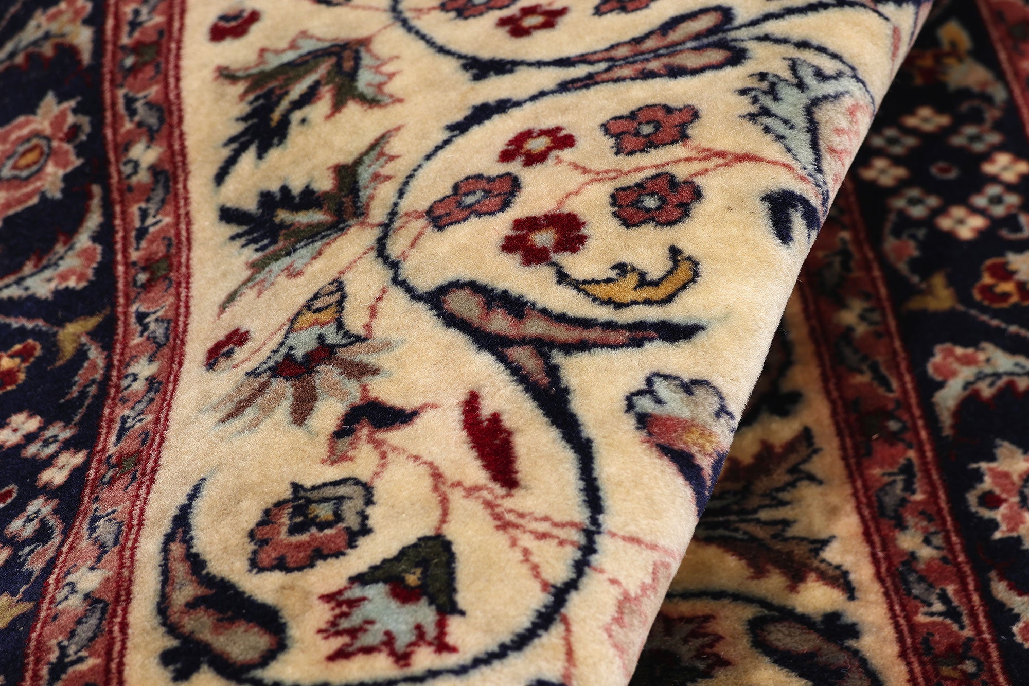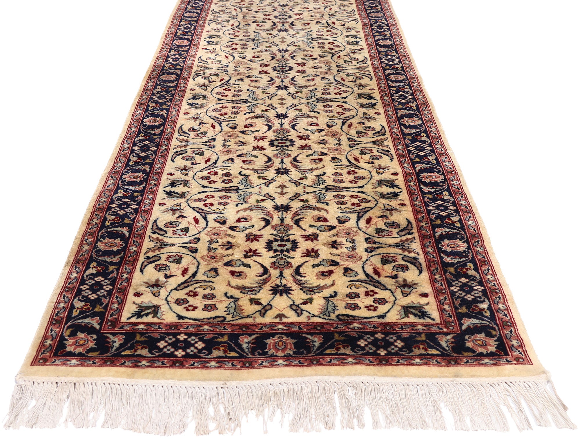 The ivory field unfolds like a formal Persian garden seen from above, anchored by a rhythmic procession of scrolling vinery and palmettes. Each botanical flourish is rendered with clarity and restraint, allowing negative space to breathe between blossoms, serrated leaves, and stylized rosettes. The exceptional design is neither hurried nor ornamental excess—it is measured, deliberate, and composed. The repeating floral medallions along the heart of this extraordinary masterpiece creates a visual axis, guiding the eye forward in a procession reminiscent of palace walkways and ceremonial halls. This sense of movement transforms a simple passage into a journey.
