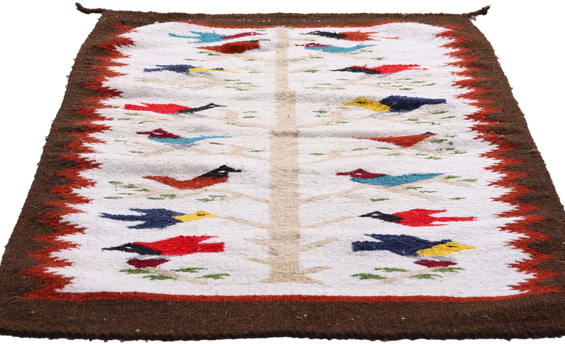 Woven in the mid-20th century by a skilled Dine weaver whose hands moved with generational memory and reverence, this handwoven wool Tree of Life Navajo rug is a luminous expression of spiritual narrative and textile mastery. Set against a snowy ivory field, the central trunk rises like a sacred axis mundi, the conduit between earth and sky, life and spirit. From its limbs spring pairs of vibrantly colored birds—cardinal red, indigo blue, golden yellow, and turquoise—each perched in poised serenity. These birds are not mere decoration; they are sacred messengers, embodiments of prayer, and symbols of transformation and cosmic harmony.
