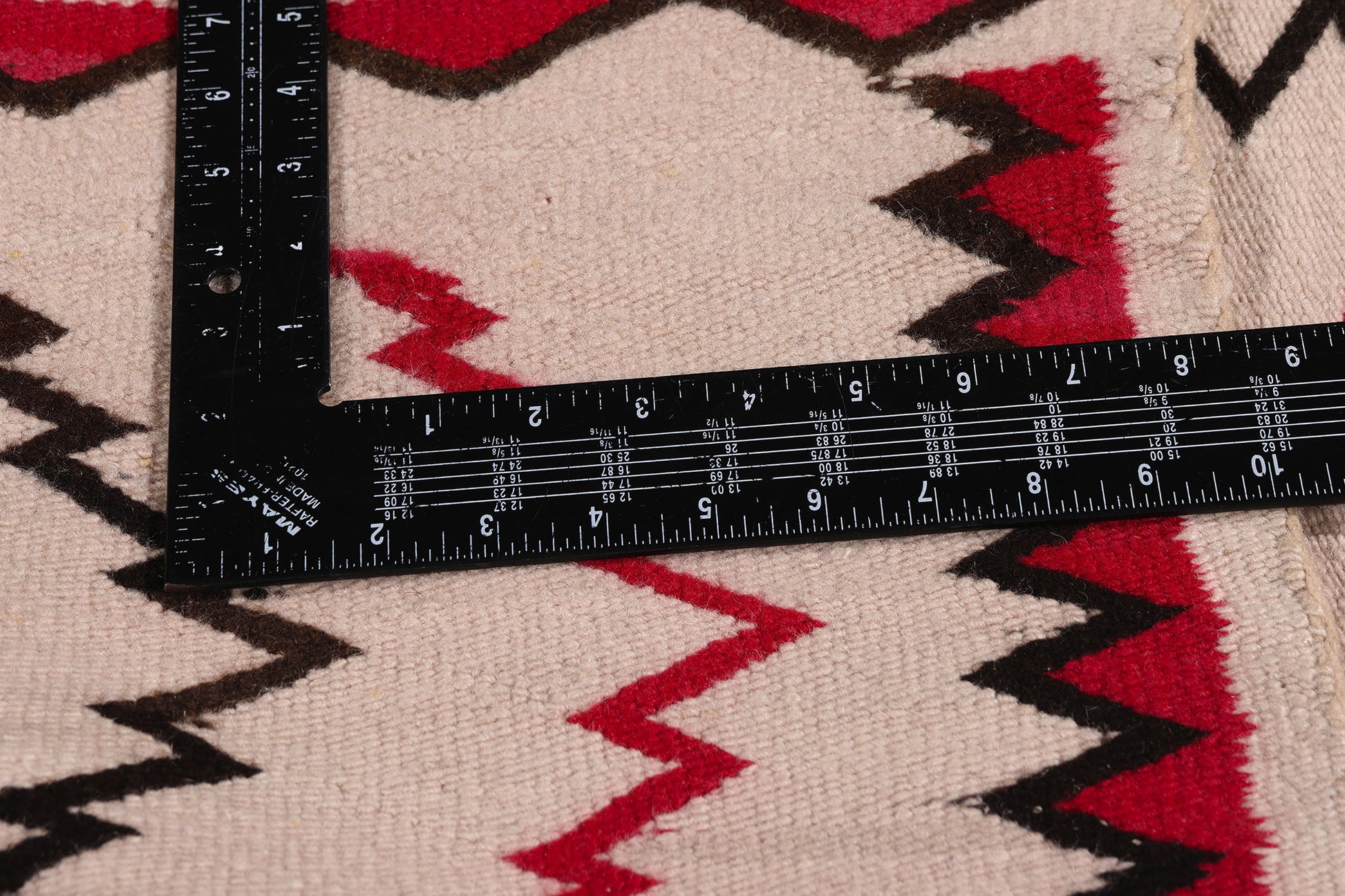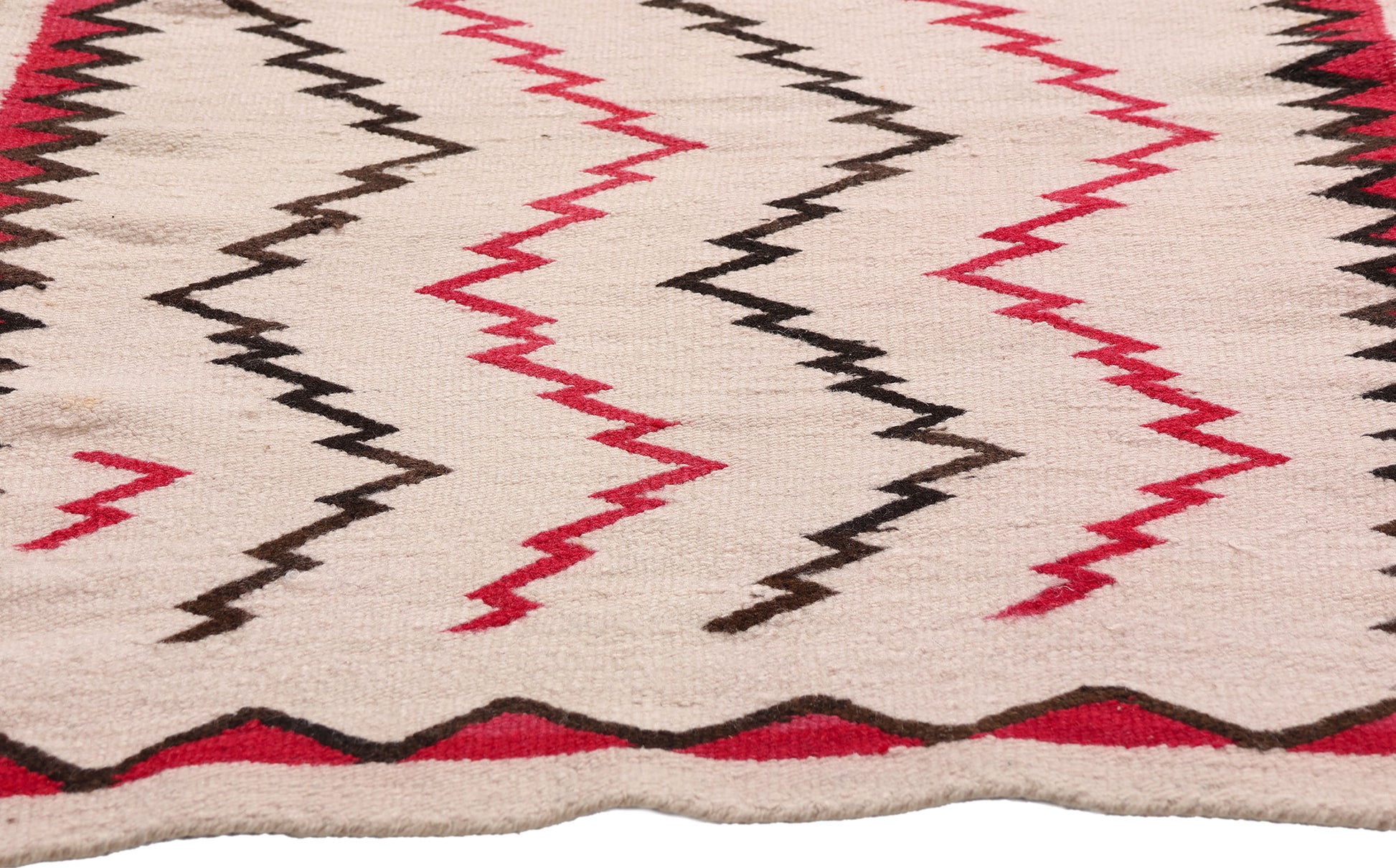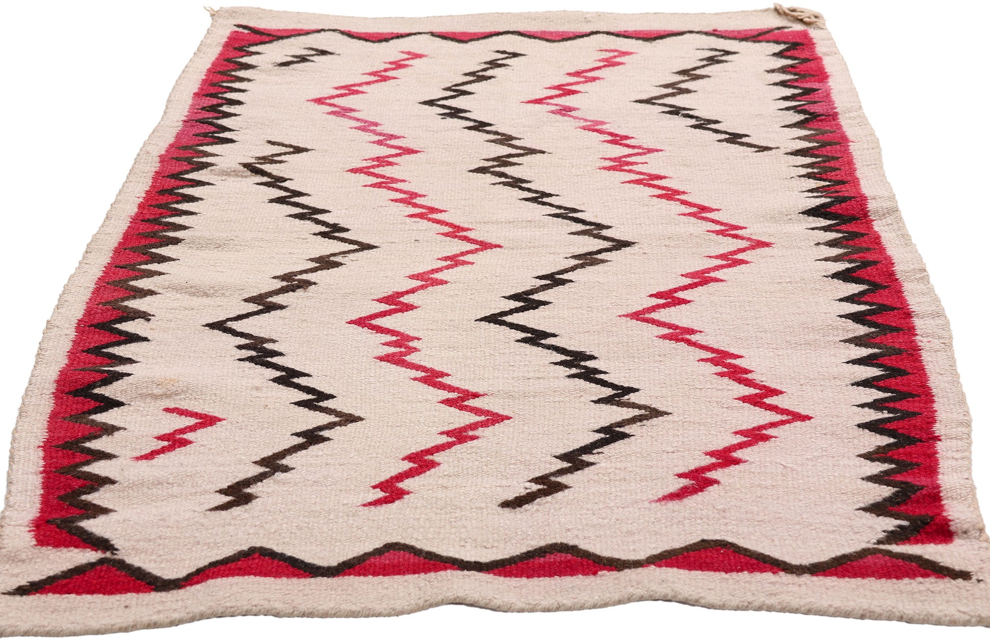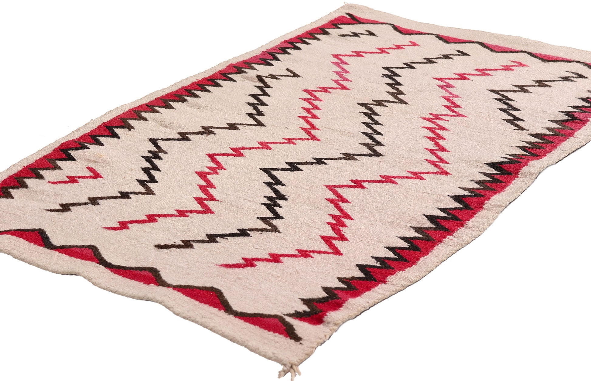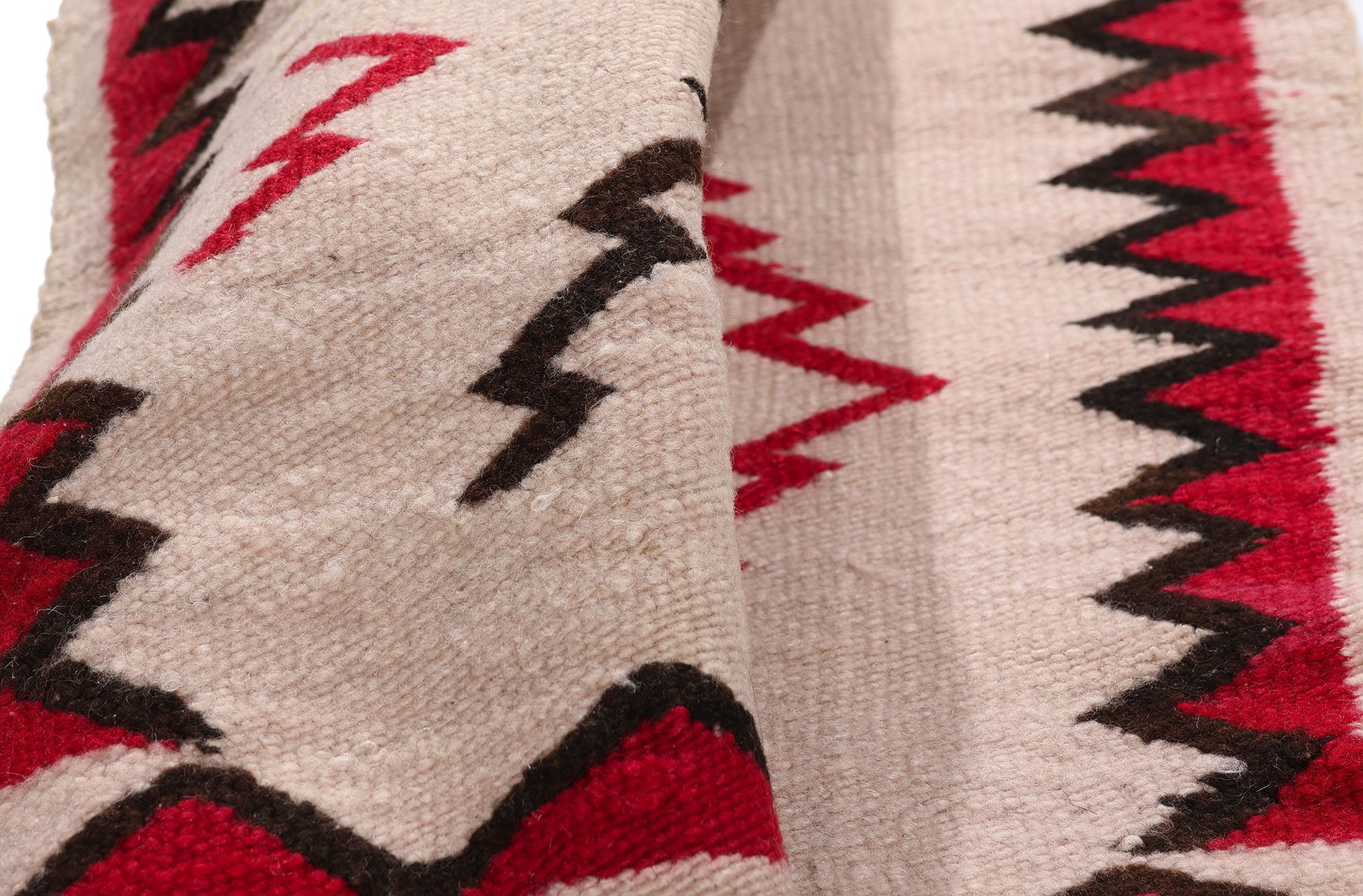 Woven with soul-stirring dynamism and historic intention, this handwoven wool antique Eye Dazzler Navajo rug is a visual symphony of lightning and rhythm, conceived at the crossroads of heritage and cosmic abstraction. Crafted in the Southwest with the spirited hands of a master Dine weaver, the textile dances with jagged zigzag forms in bold black and crimson, striking like thunderbolts across a field of handspun ivory wool. The jagged lines pulse with vitality, recalling sacred chants and lightning spirits, manifesting an ancestral force that transcends ornamentation to become pure energy woven in wool.