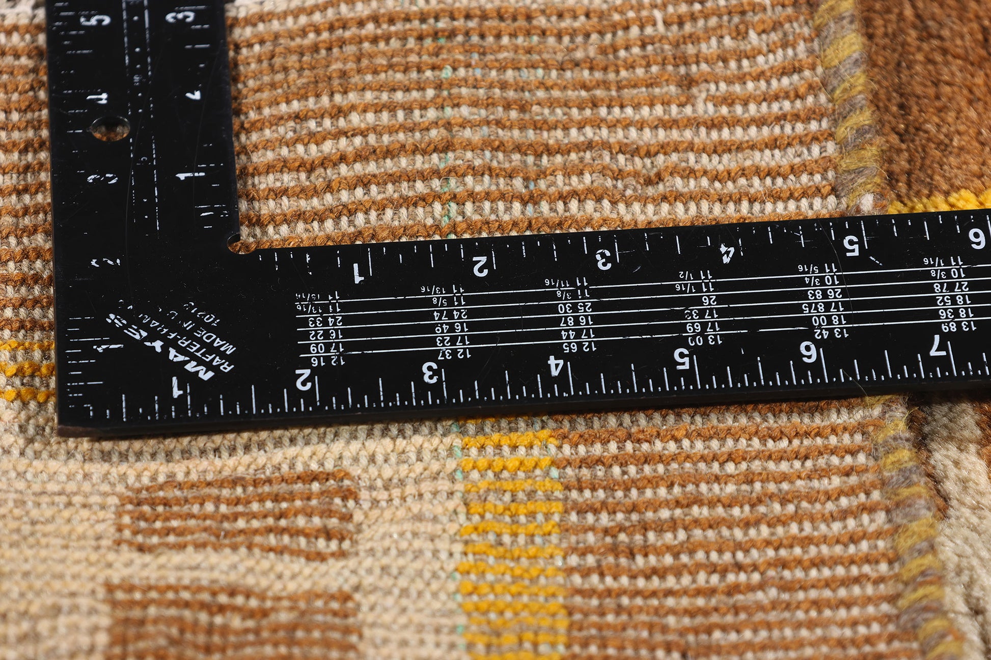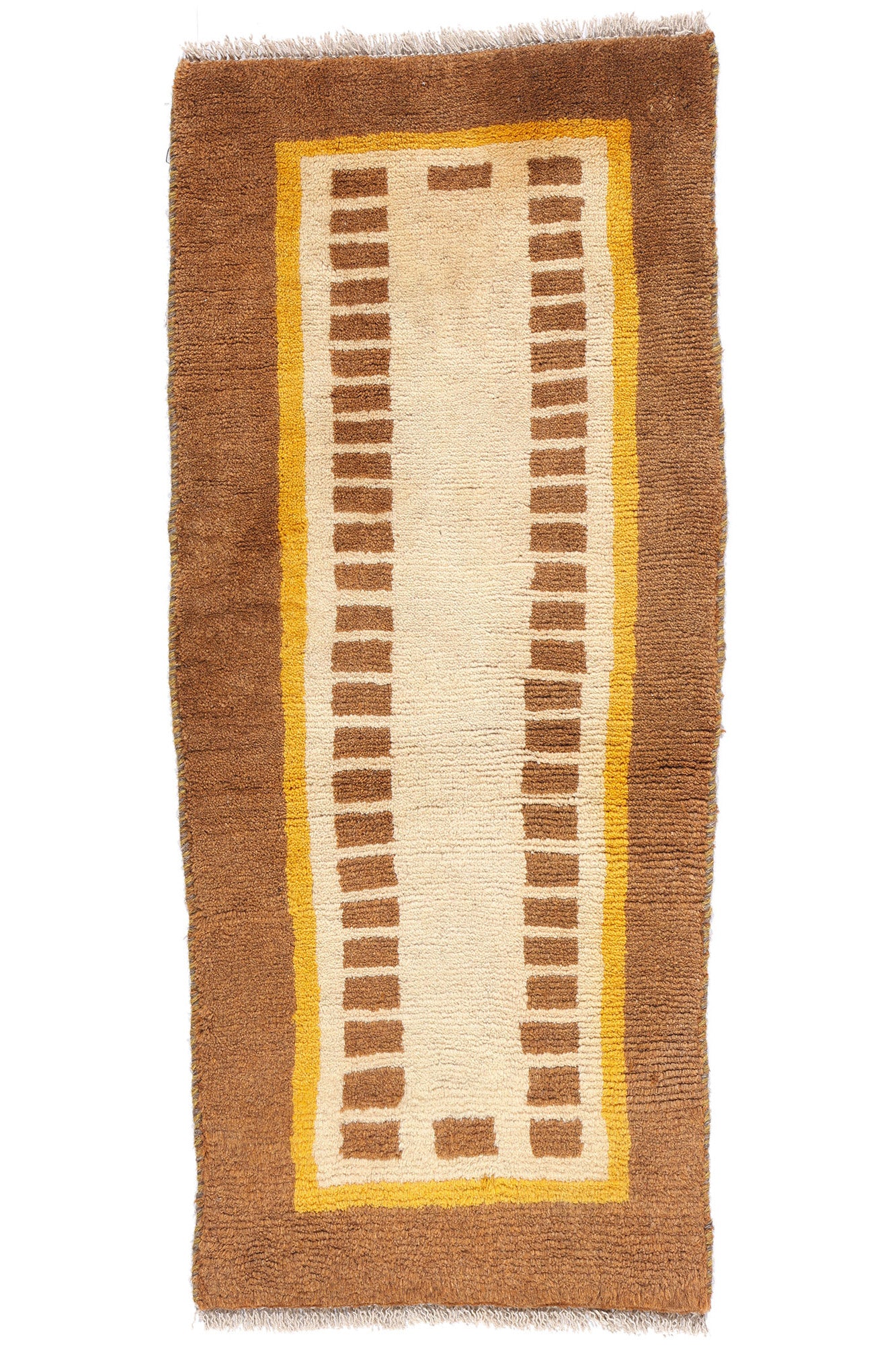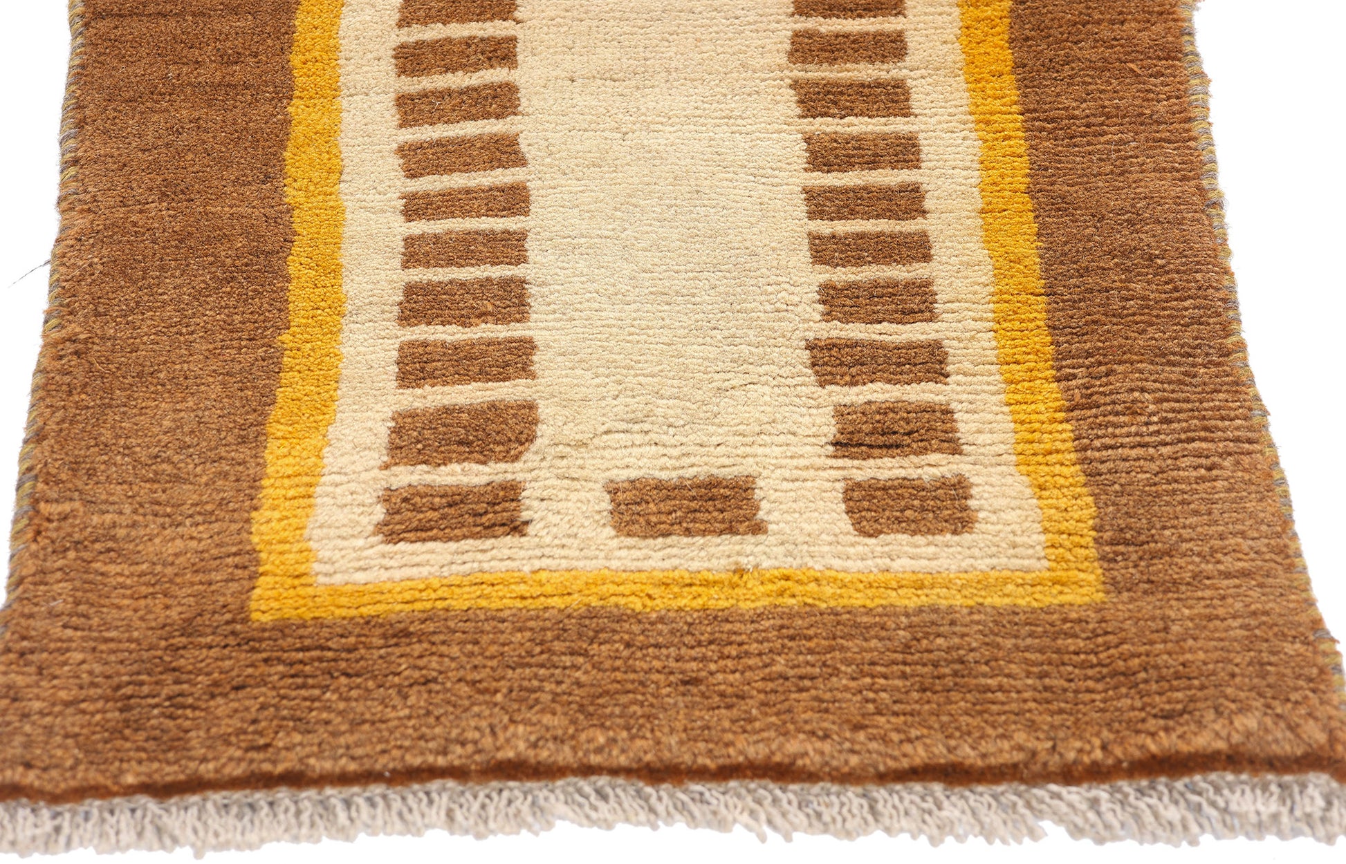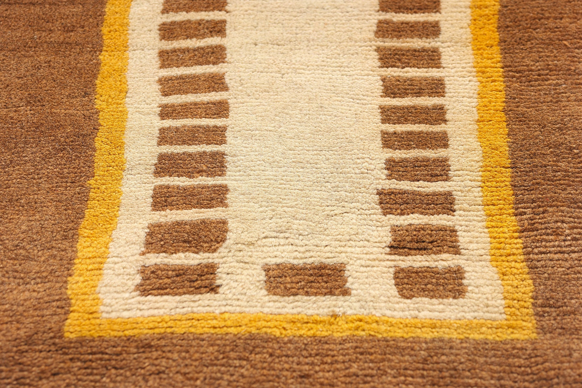 This charming vintage Swedish rya rug runner is a testament to the Scandinavian design ethos of marrying functionality with understated beauty. Hand-knotted from fine wool, the rya rug exemplifies mid-century modern aesthetics with its earthy tones of beige, brown, and gold. Its linear, geometric design is both minimalist and rhythmic, creating a balance between simplicity and structure. The runner’s elongated form makes it a perfect addition to narrow spaces, where it can effortlessly enhance the visual flow.