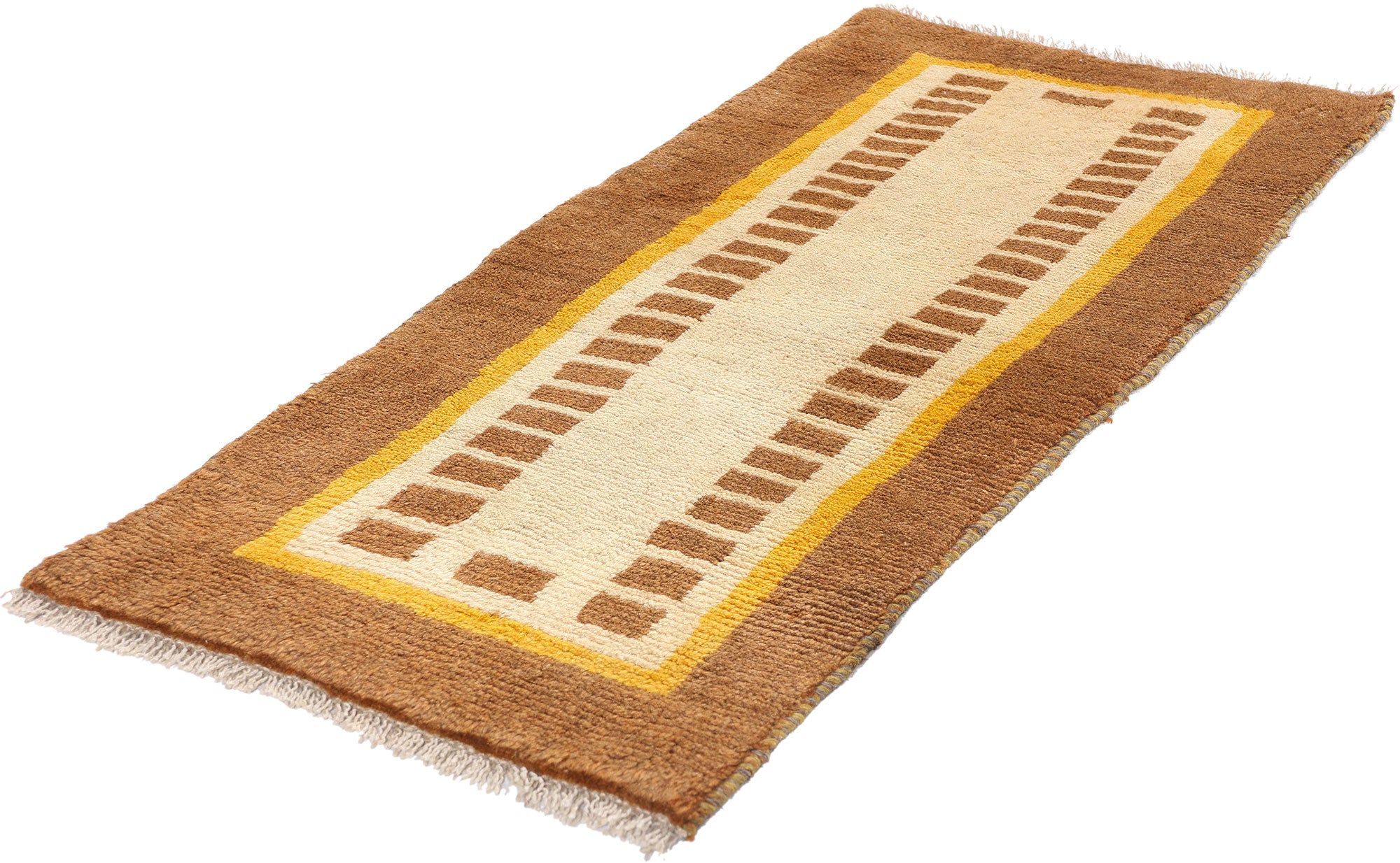 The central field features a soft beige backdrop adorned with rows of simple brown rectangular motifs, evoking the appearance of stepping stones or a pathway. This repetitive pattern creates a sense of continuity and movement, guiding the eye along the runner's length. Framing this design is a thin border of golden yellow, adding a touch of warmth and brightness to the neutral palette. The outermost frame, in a rich, earthy brown, grounds the composition, providing a harmonious contrast that enhances the visual depth of the piece.