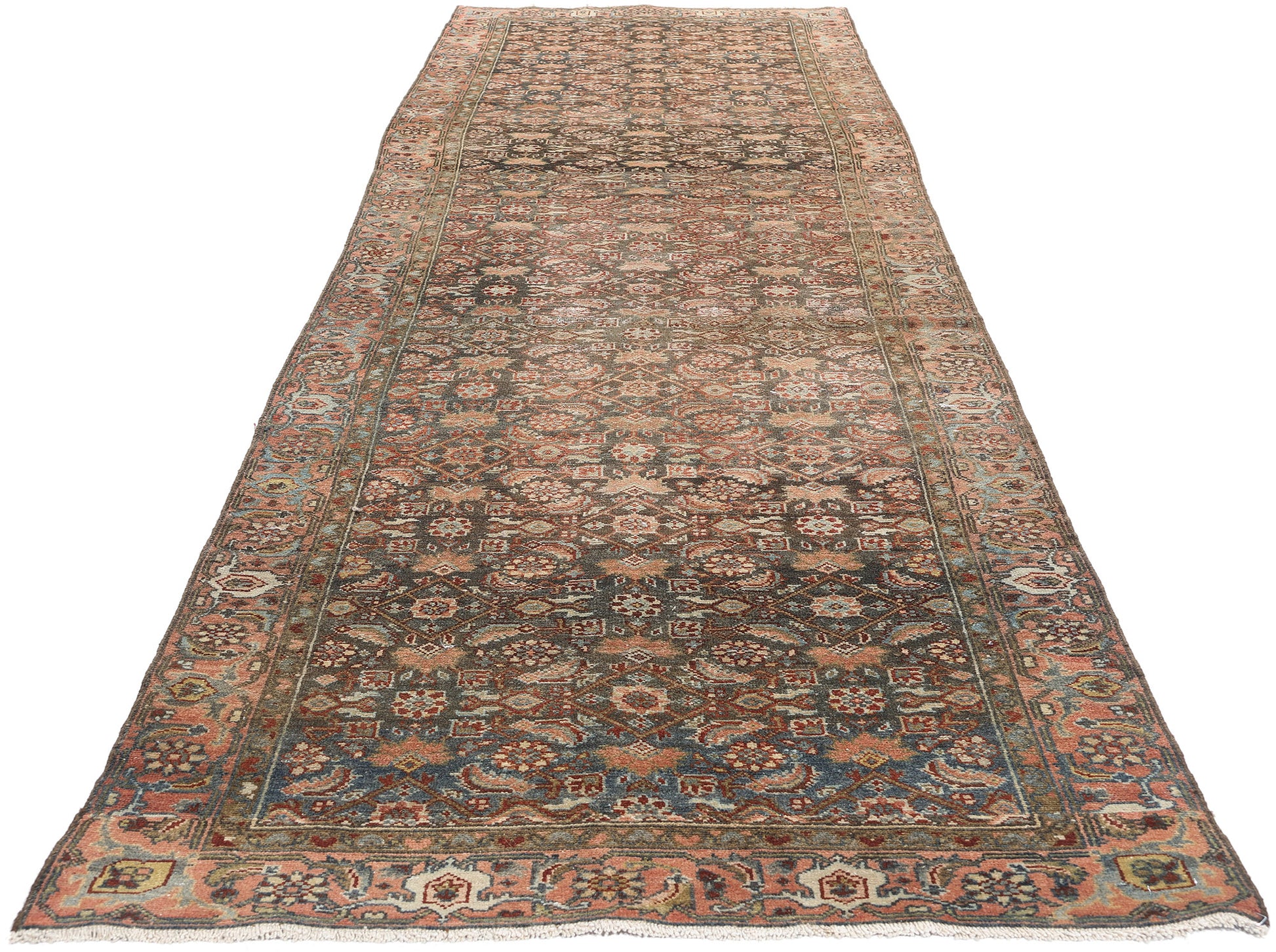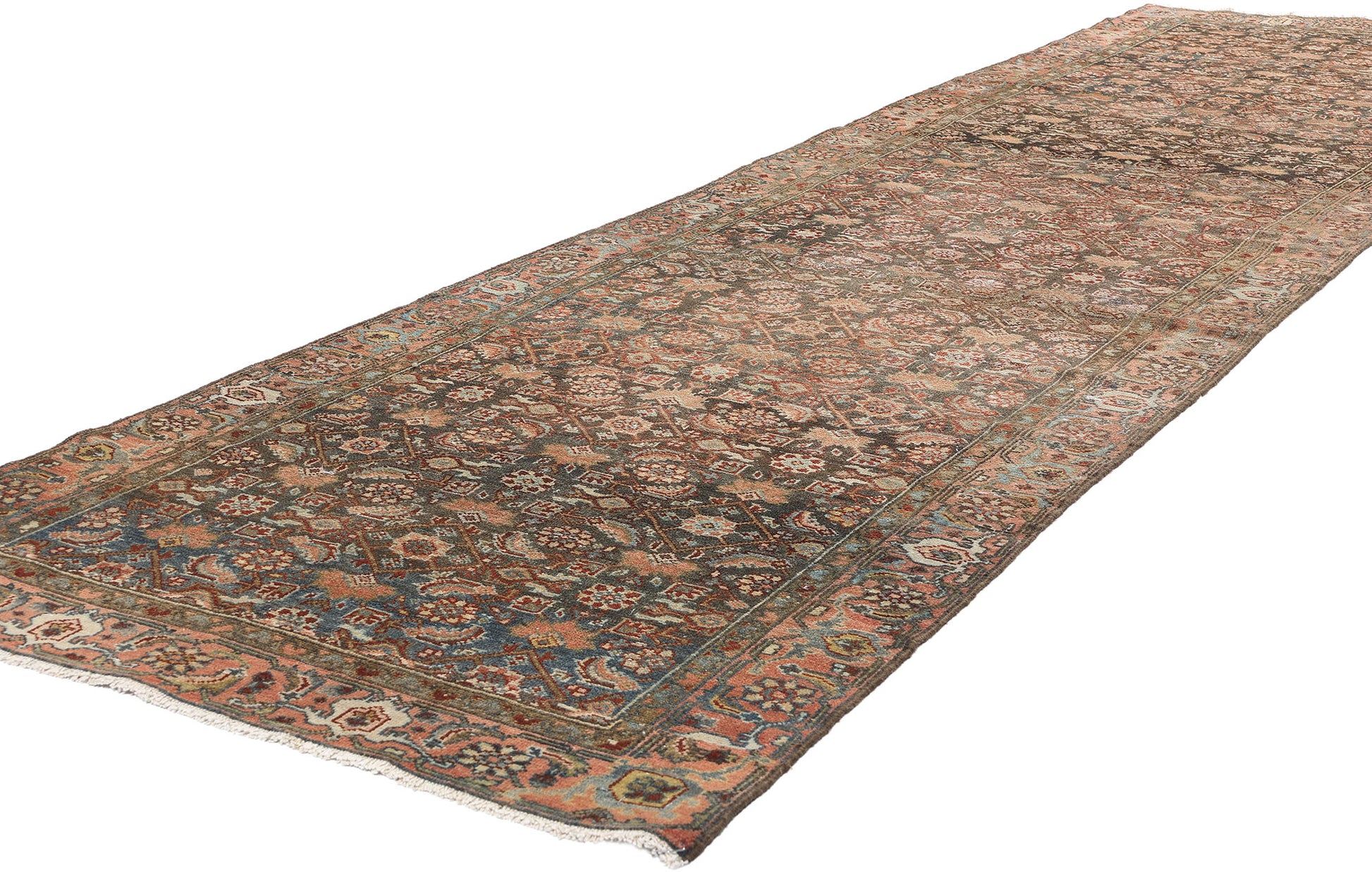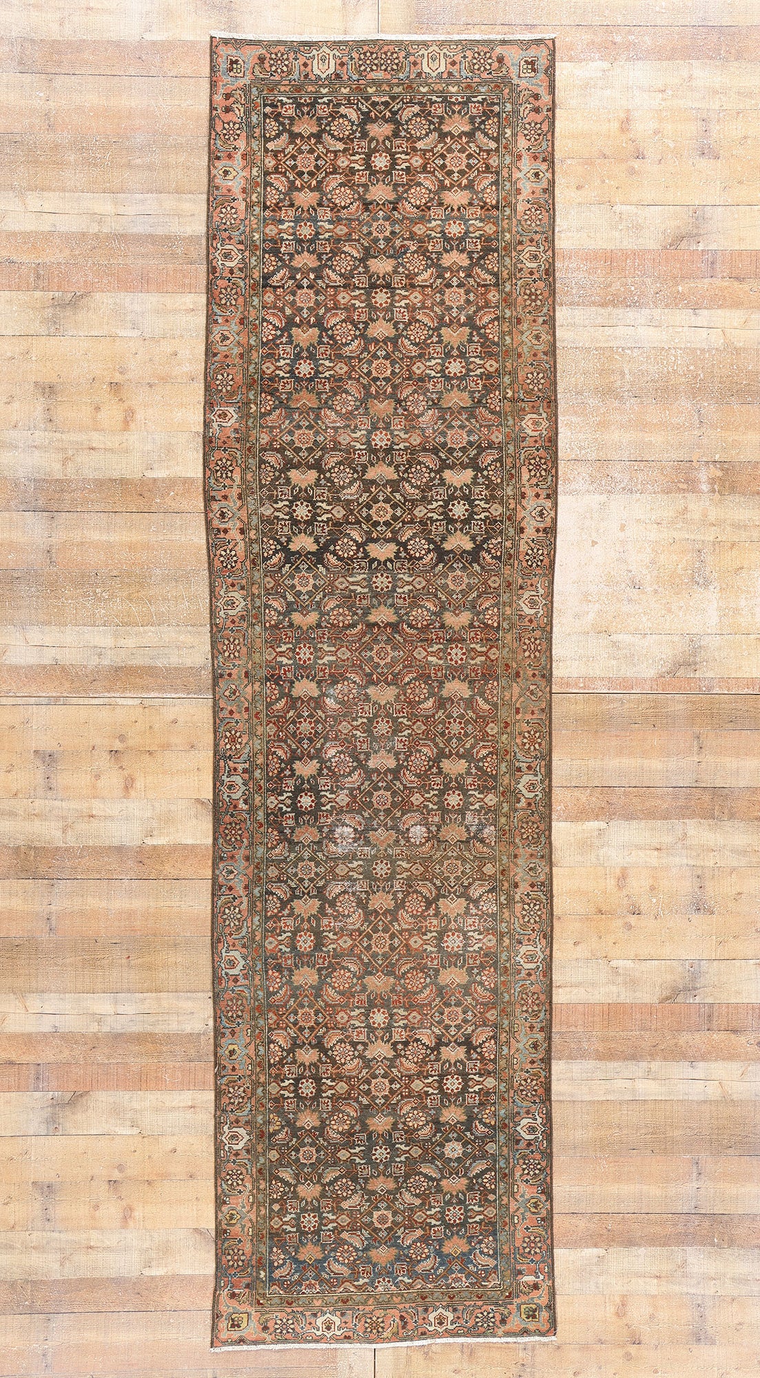 This hand-knotted wool antique Persian Malayer rug runner is a masterful expression of timeless artistry and cultural heritage. Its distressed composition, paired with an antique wash, evokes a sense of history and character, while the richly striated brown and blue field offers depth and texture. The allover geometric pattern of Herati motifs, characterized by stylized blossoms encased in diamonds and flanked by elegant leaf-like elements, creates a mesmerizing interplay of symmetry and quiet sophistication, reminiscent of the intricate patterns found in Persian gardens.
