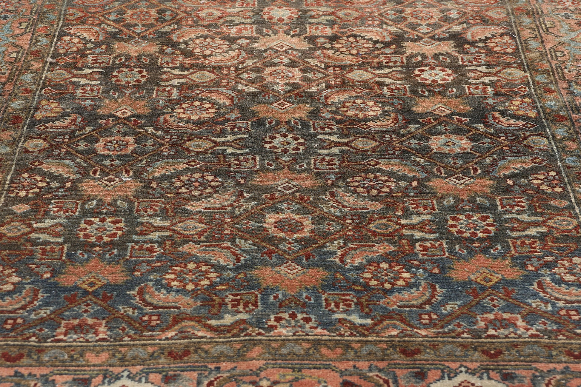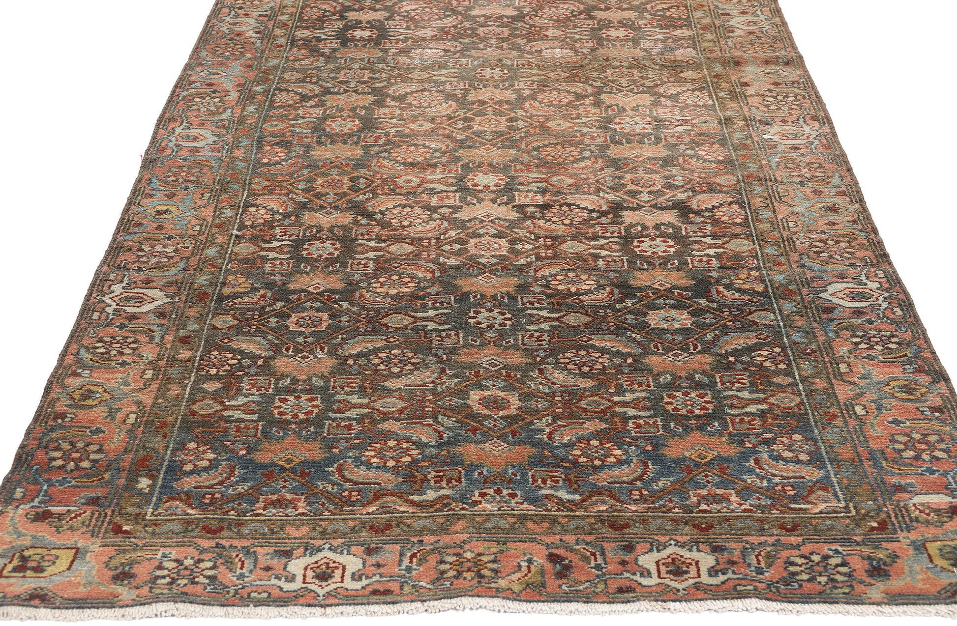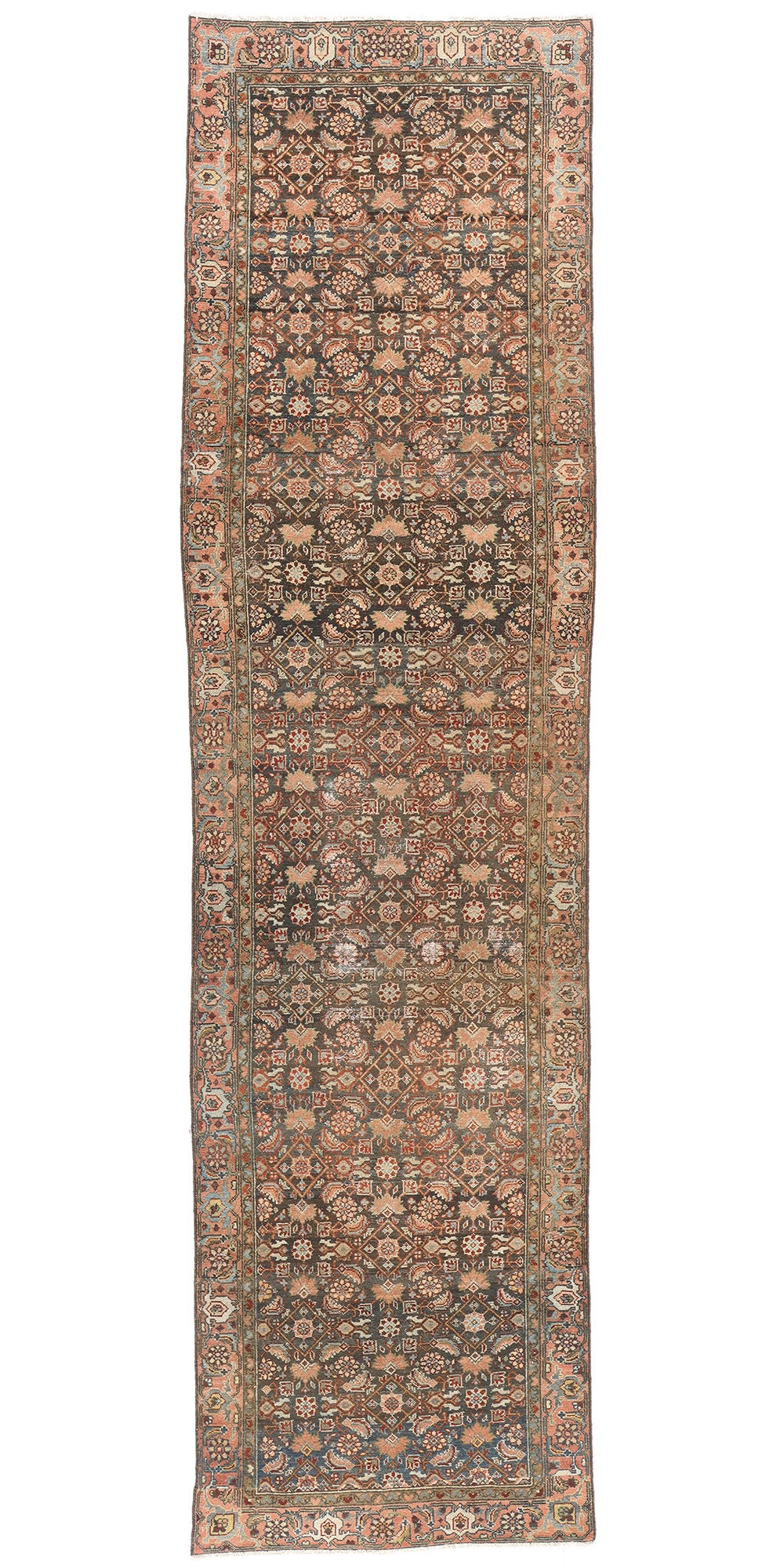 This hand-knotted wool antique Persian Malayer rug runner is a masterful expression of timeless artistry and cultural heritage. Its distressed composition, paired with an antique wash, evokes a sense of history and character, while the richly striated brown and blue field offers depth and texture. The allover geometric pattern of Herati motifs, characterized by stylized blossoms encased in diamonds and flanked by elegant leaf-like elements, creates a mesmerizing interplay of symmetry and quiet sophistication, reminiscent of the intricate patterns found in Persian gardens.