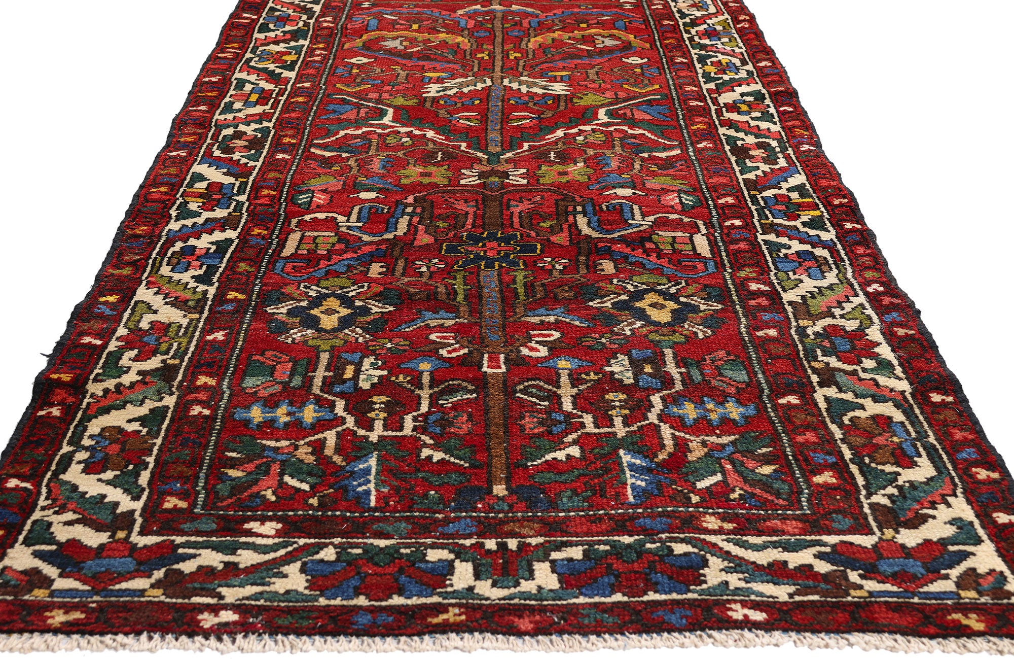 At the heart of this exquisite runner is a sumptuous crimson field—deep, romantic, and undeniably commanding. Across its length unfolds a spirited allover pattern, an intricate choreography of stylized blossoms, serrated leaves, angular vinery, and symbolic botanical forms that pay homage to the Bakhtiari tribe’s love for abundant gardens. The motifs have a sense of movement and vitality, as if the rug itself is breathing with the seasons. Their abstract geometry and joyful color palette—ink blue, emerald, saffron, ivory, and rose—create a bold visual rhythm that feels both timeless and artistically daring.