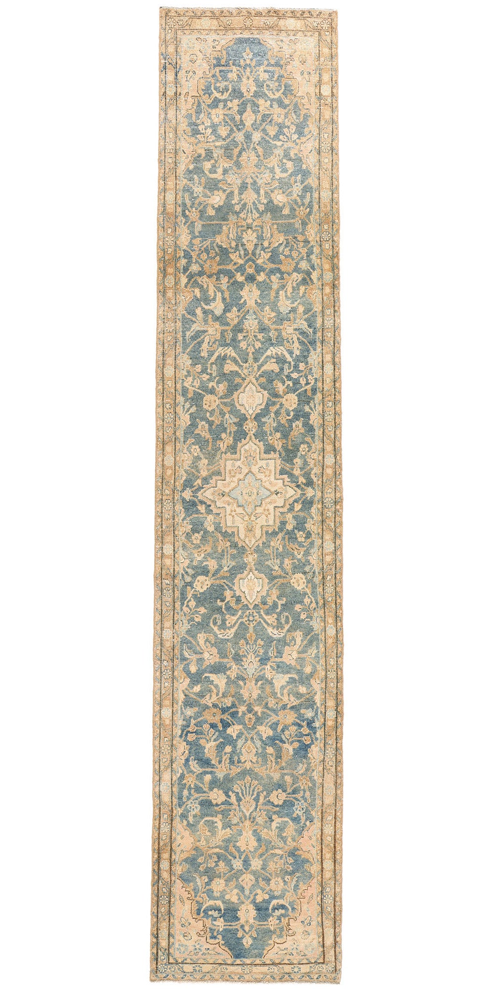 This hand-knotted wool distressed antique Persian Malayer runner embodies the essence of quiet elegance and timeworn beauty. The soft blue field, delicately distressed through an antique wash, exudes an ethereal quality that blends effortlessly with the runner’s rustic yet refined appeal. Its elongated form makes it a perfect statement piece for hallways or narrow spaces, offering a sense of history and nostalgic charm in its every thread.