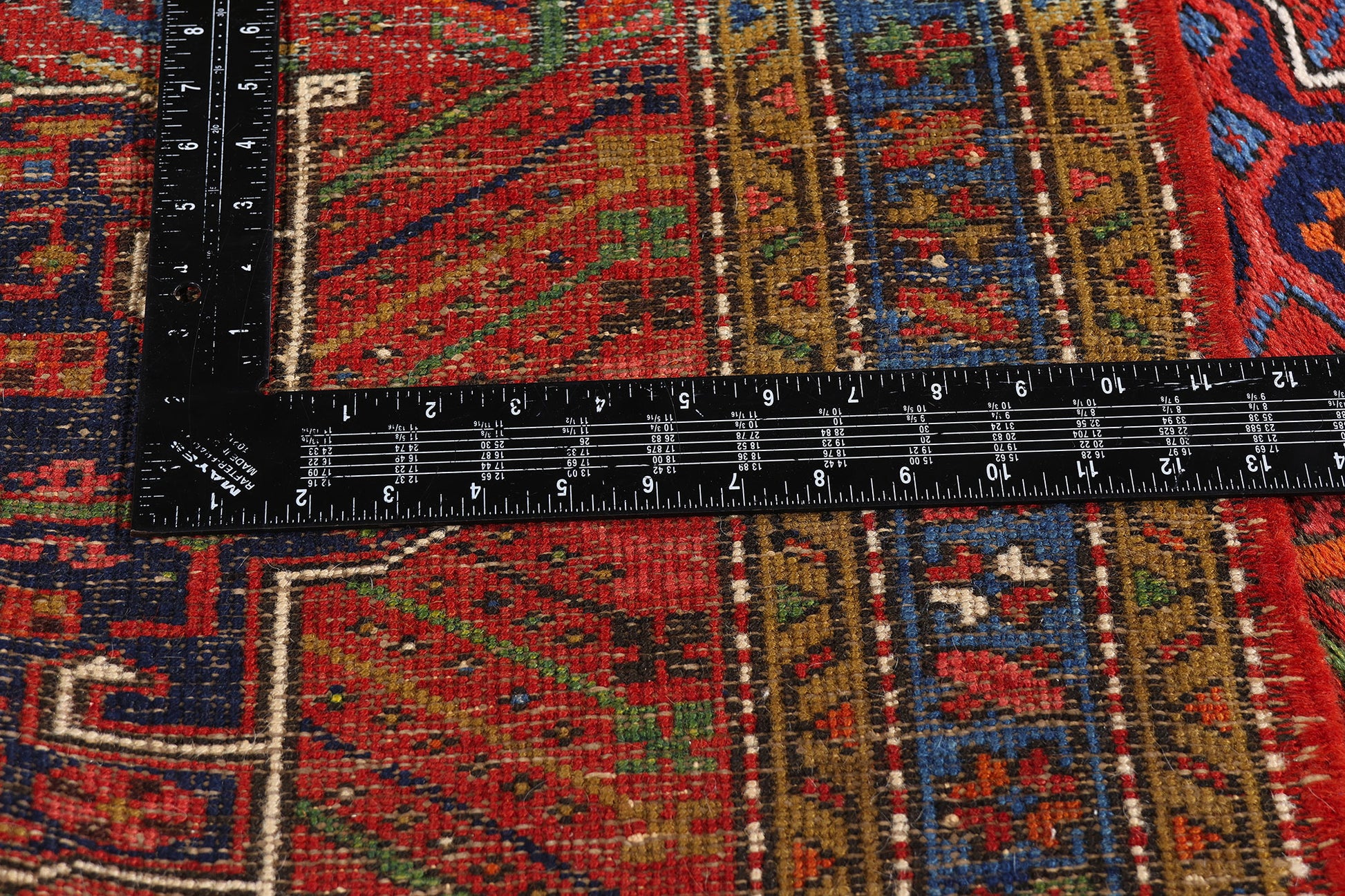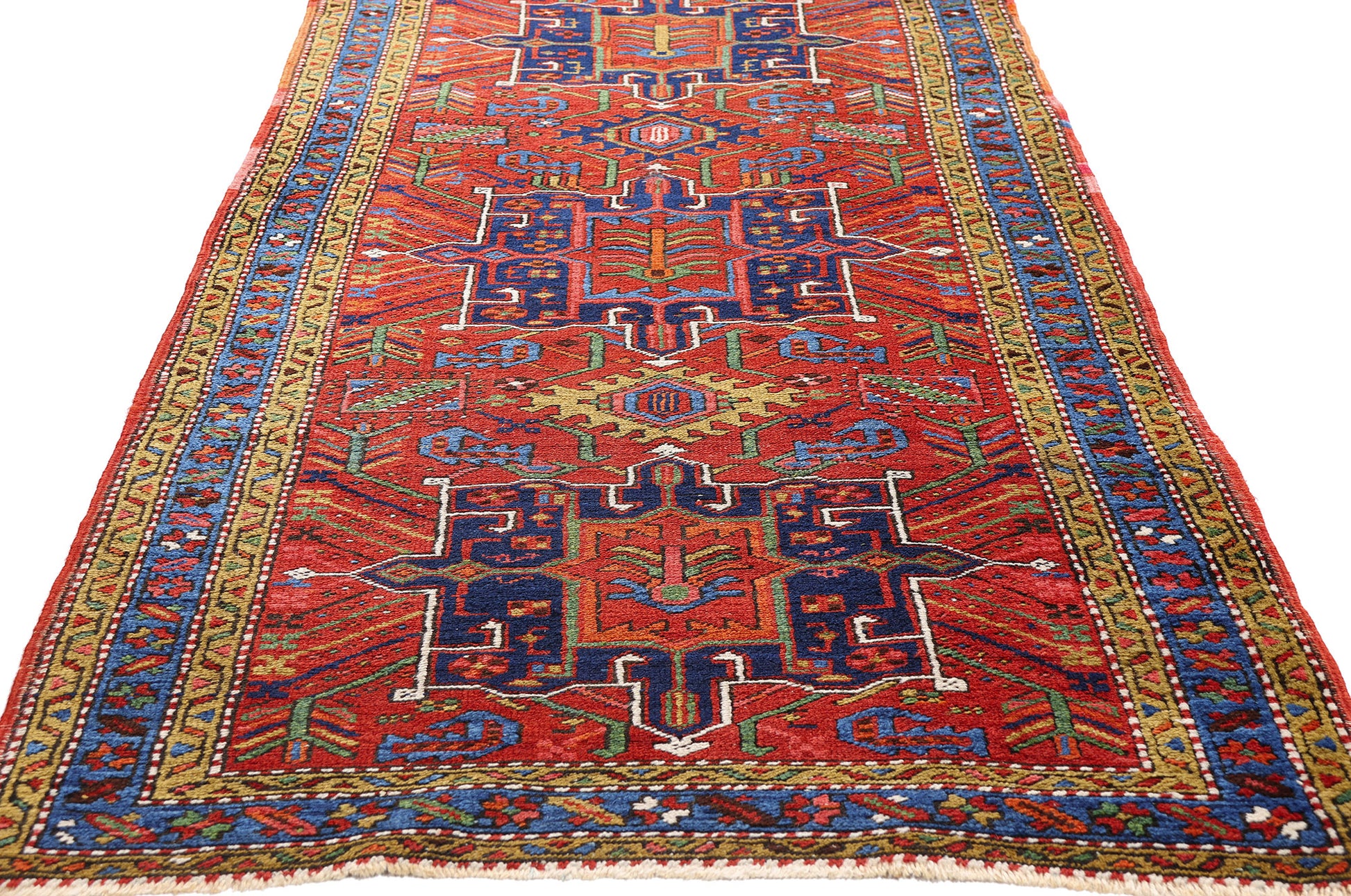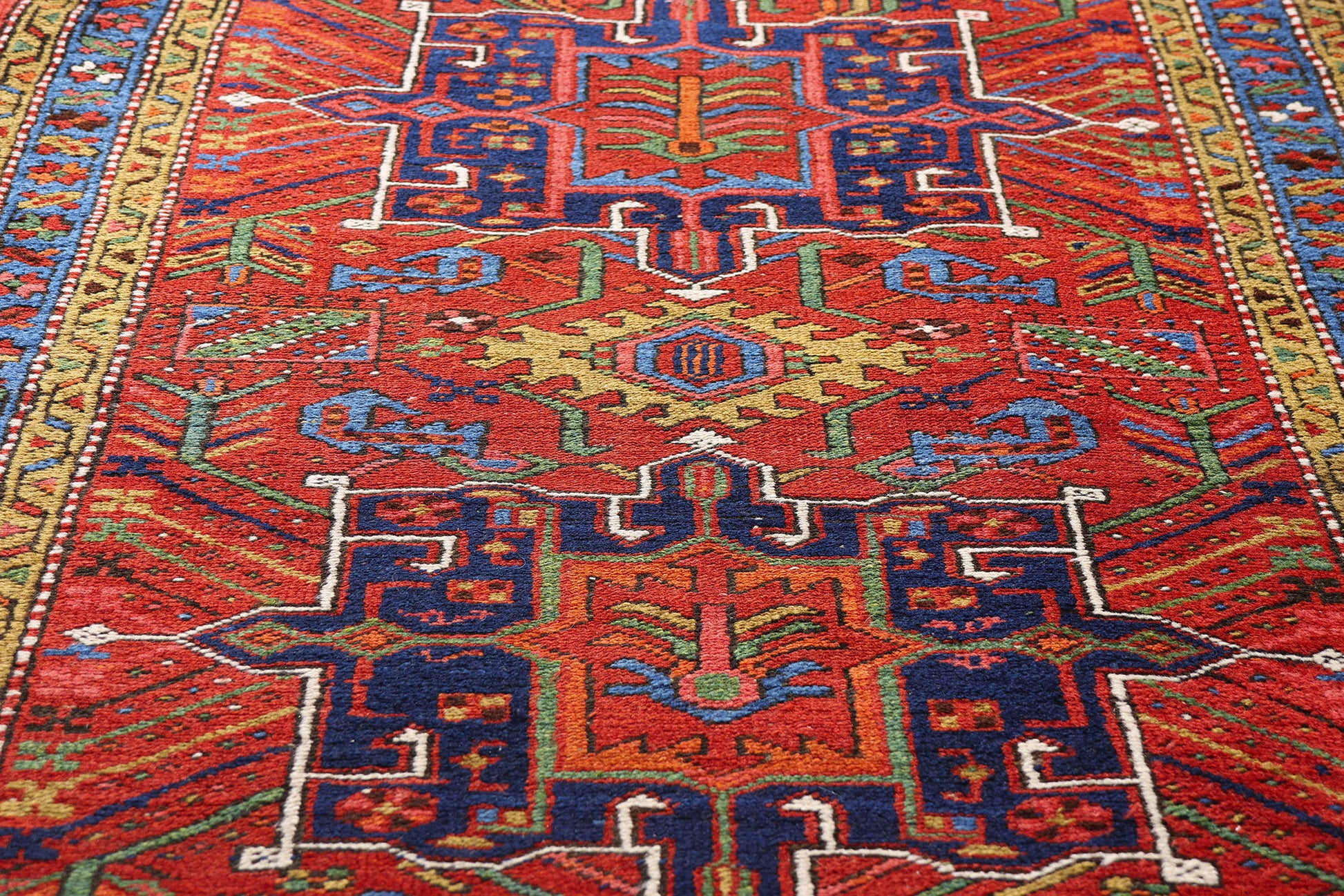 Dancing across the scarlet backdrop is a rich tableau of tribal iconography: serrated leaves, pinwheels, and rosettes bloom in animated harmony, while rectangles filled with Gendje-style diagonal stripes offer a rhythmic contrast. Cross motifs speak to unity and balance, while quincunx arrangements echo cosmological balance, rooting this textile in both spiritual and natural realms. The rectilinear vines and angular lines thread throughout like whispered incantations—drawing the eye along a path of visual poetry. The interplay of symbolic abstraction and geometric clarity reflects the enduring genius of Heriz village weavers who transformed daily life, memory, and myth into monumental design.