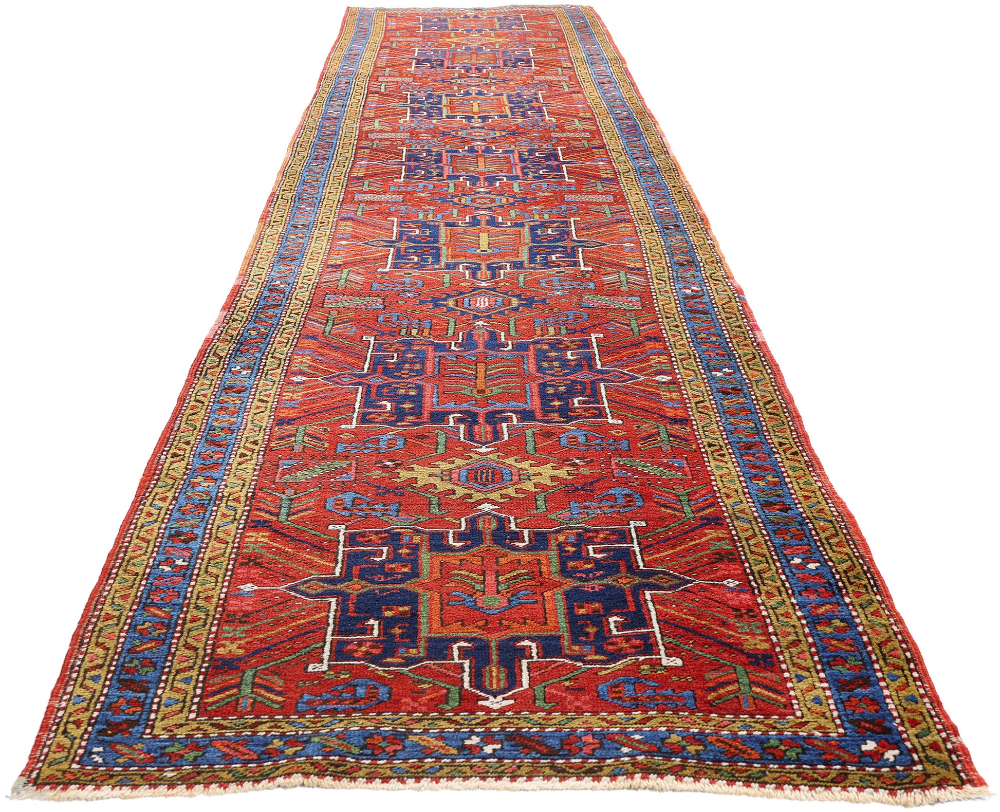 This one-of-a-kind antique Persian Heriz runner is more than a corridor adornment—it is a rare woven manuscript of cultural identity, artistry, and spirit. Its luxurious wool texture, sculpted by hand and softened by time, carries within it a history of devotion to craft and expression. Ideal for refined interiors that favor bold storytelling and heritage luxury, this precious woven wonder brings grounding warmth, architectural structure, and ornamental soul. A testament to the beauty born of function and faith, it transforms any space into a gallery of meaning and majestic tradition.