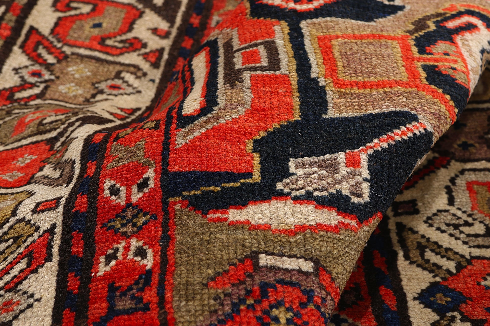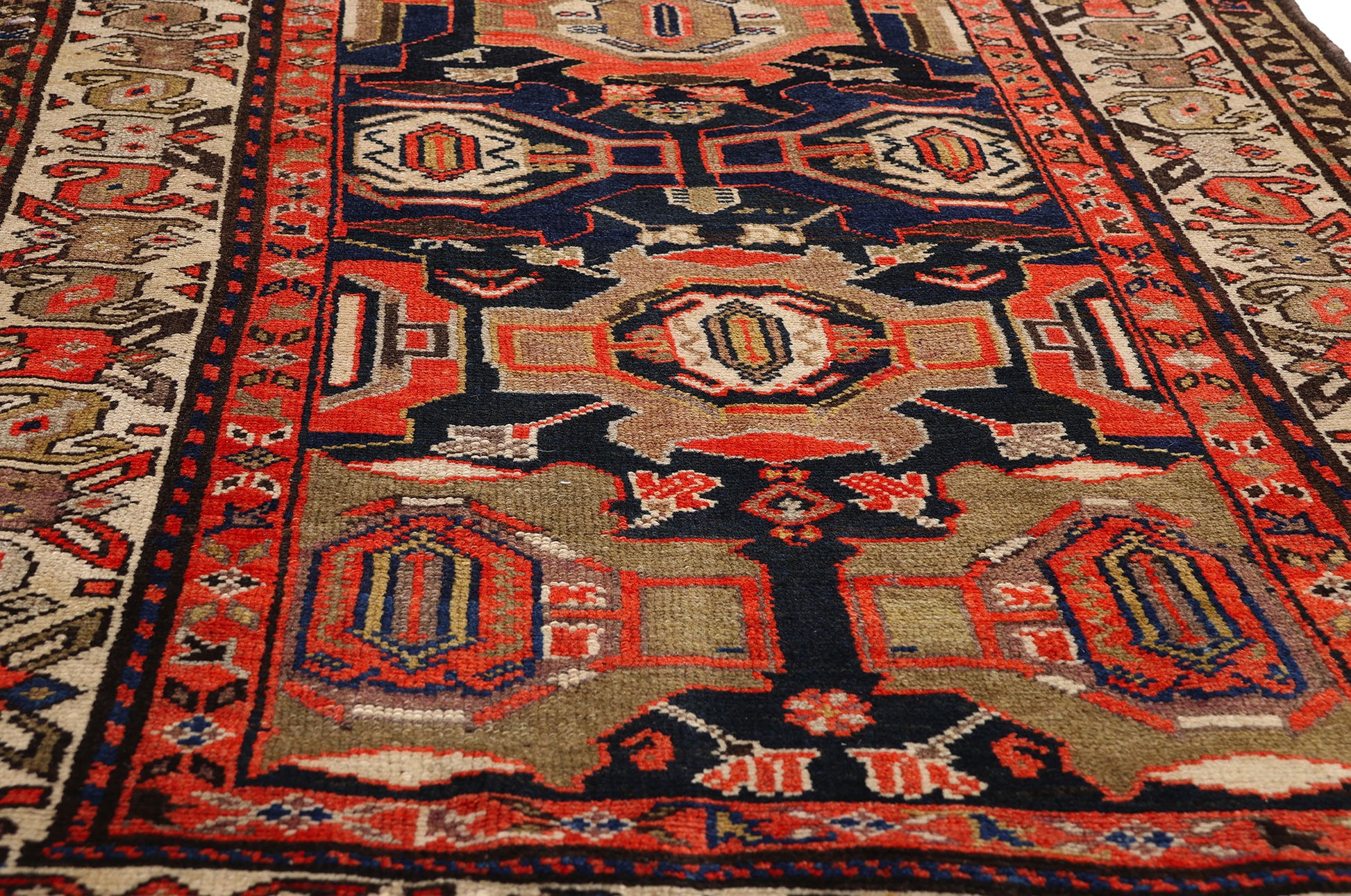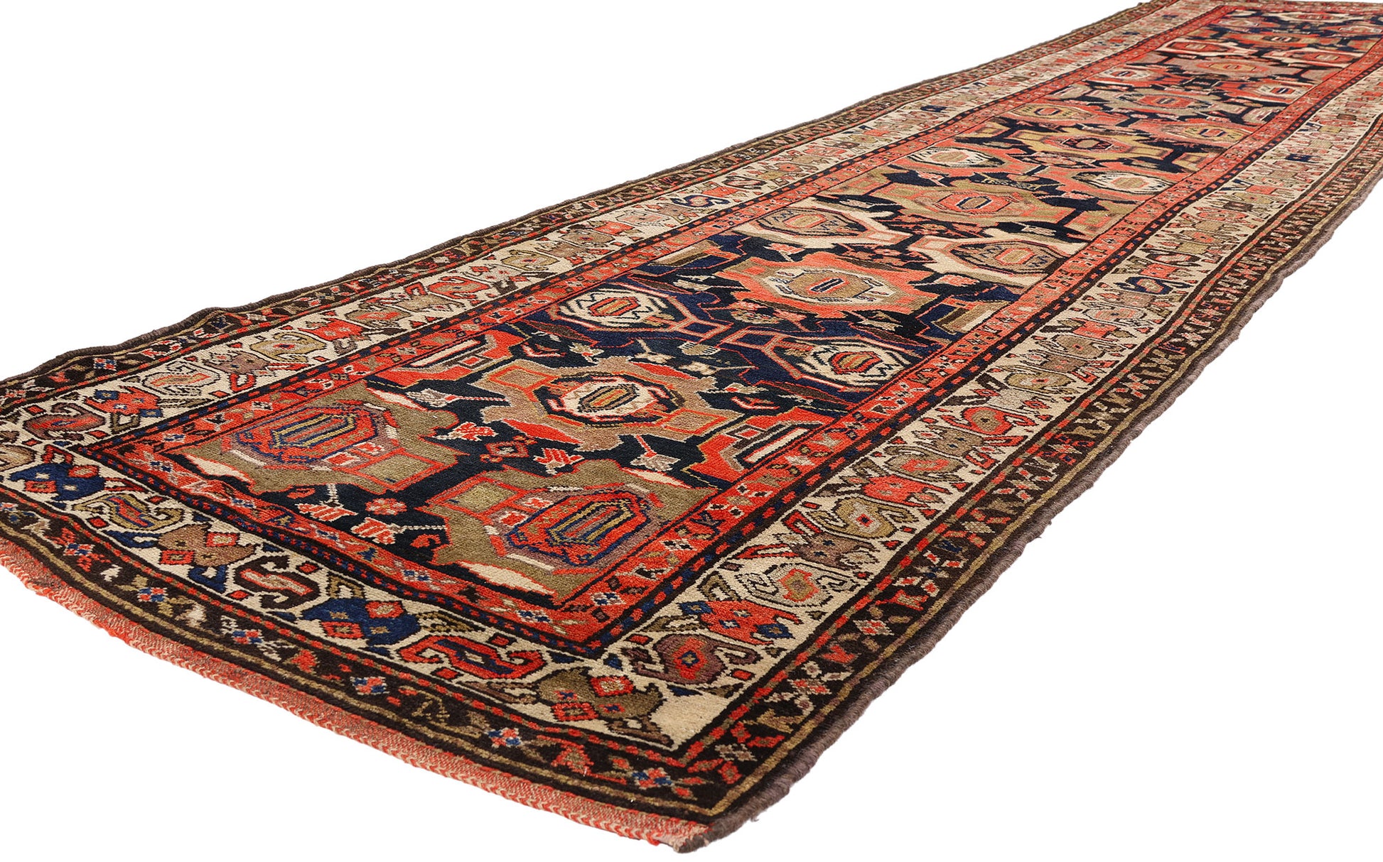 Encasing the composition is an enigmatic tribal border, flanked by inner and outer geometric guard bands that frame the runner with disciplined precision. The border’s angular motifs echo ancient pathways and protective forms, reinforcing the rug’s role as both adornment and guardian. Placed in a curated hallway, beneath a console of sculpted wood, or layered into a tailored study, this exquisite work of art offers more than visual impact—it offers lineage, symbolism, and the rare privilege of living with a piece shaped by Persian hands more than a century ago.