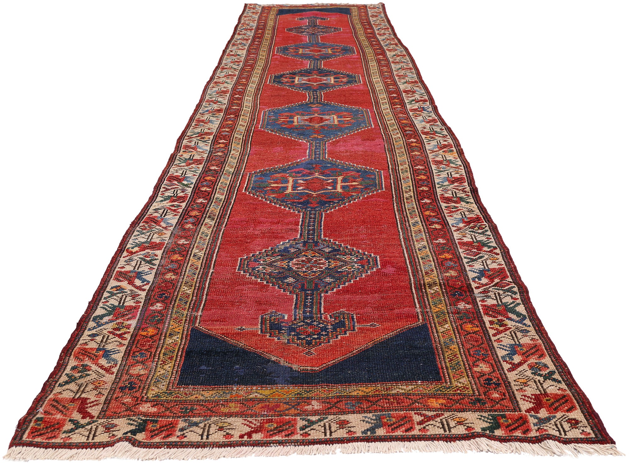 The ivory tribal border frames the exceptional composition with luminous contrast, its field animated by rhythmic geometric florals and protective emblems. Double inner guard bands tighten the architecture, acting as visual thresholds between the central axis and the outer world. This layered framing enhances the runner’s presence, creating a stately procession of pattern that feels ceremonial underfoot. The interplay of red, navy, and ivory is both bold and cultivated—an unmistakable signature of Malayer weaving at its most confident.