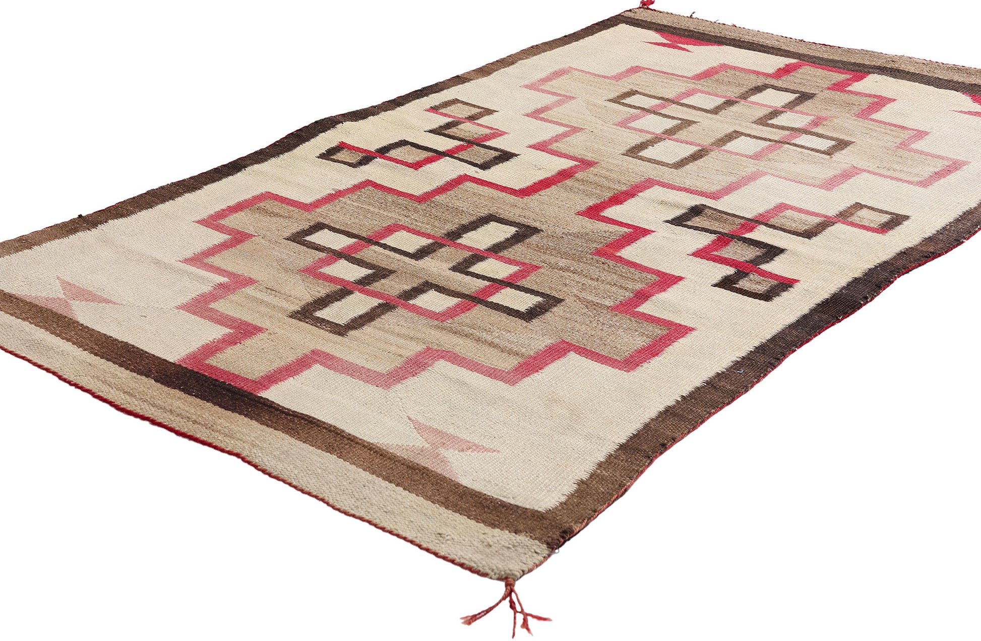 Woven in the high desert light of the early 20th century, this handwoven wool Klagetoh Navajo rug is a sacred heirloom of geometric elegance and indigenous mastery. The stepped cruciform medallions—rendered in harmonious hues of earthy browns, ivory stone, and ceremonial reds—speak to a cosmology balanced between earth and sky, a spiritual geography encoded in fiber. Each motif reverberates with symbolic meaning: protection, harmony, and ancestral lineage. This textile does not merely decorate—it resonates, invoking the silent rhythm of mesa winds and the sacred geometry of Diné worldview.