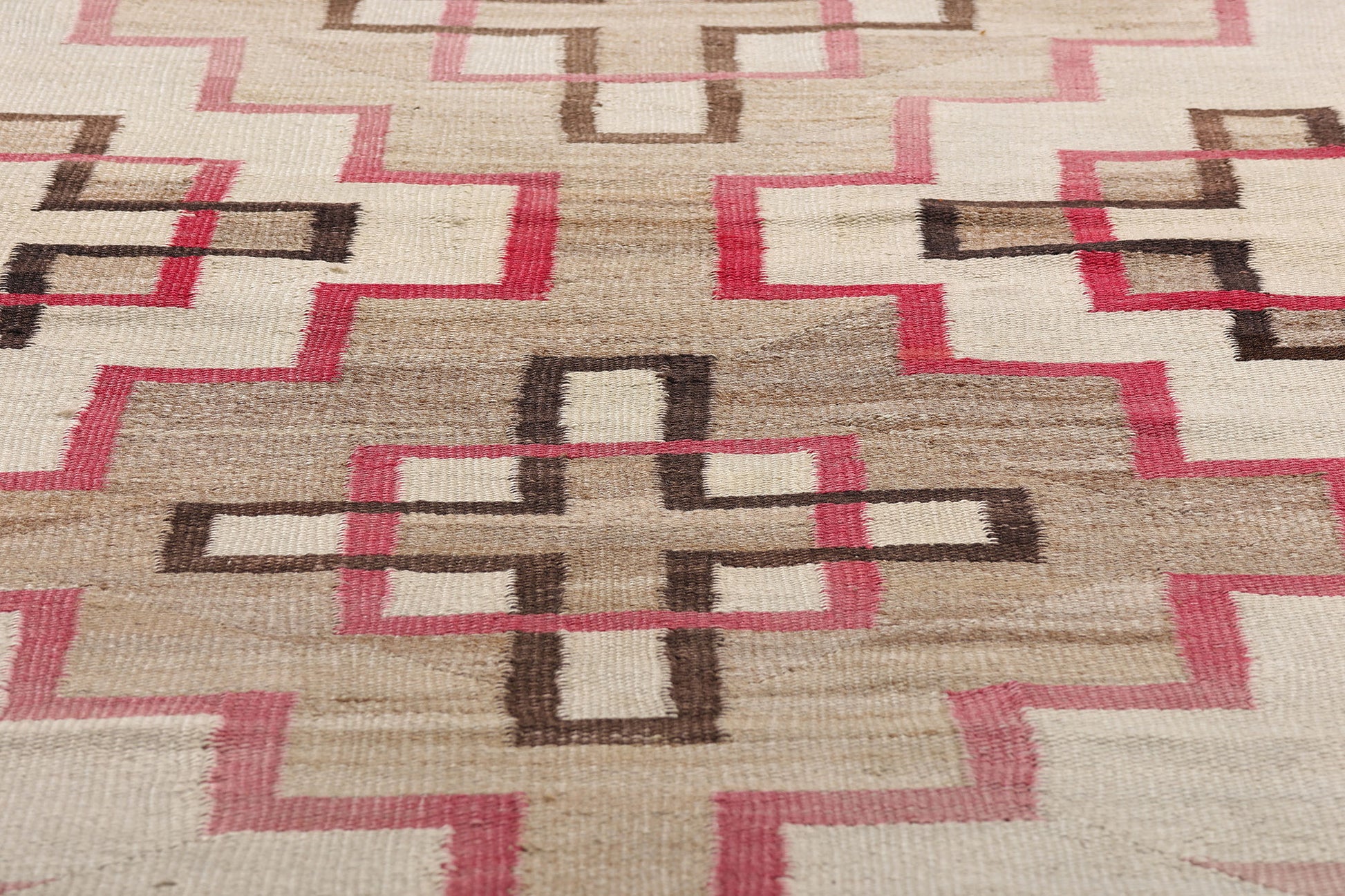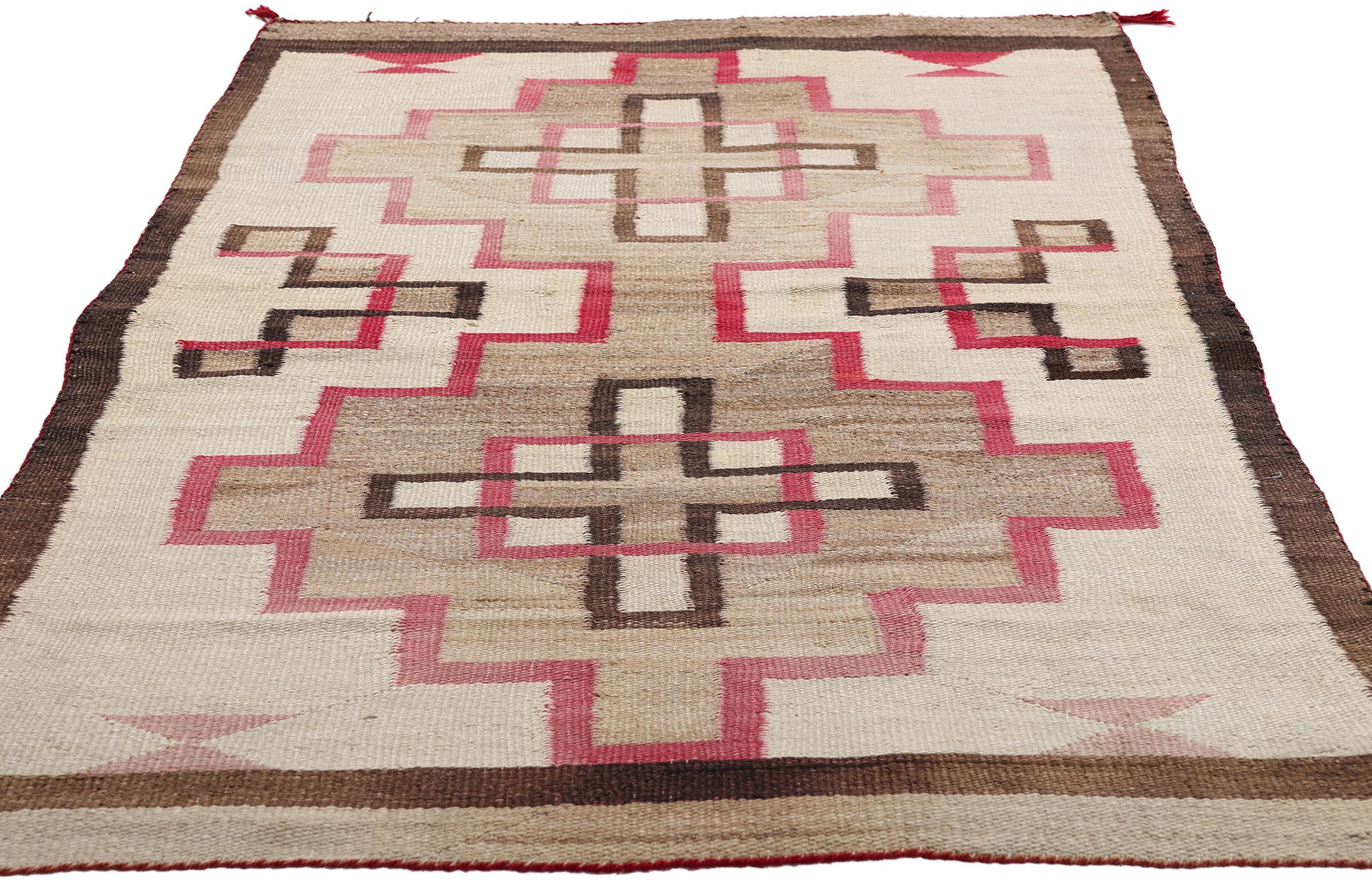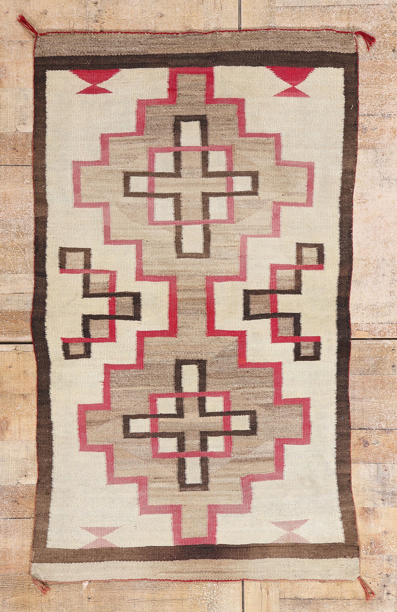 The rare palette is drawn from both vegetal dyes and early aniline pigments, resulting in a subtle interplay between warm tonalities and precise form. The precision of the wool’s handspun texture reflects a weaver deeply rooted in tradition yet unafraid of bold, architectural composition. The cruciforms are flanked by stair-step motifs—echoes of kiva walls, ceremonial ascent, and spiritual journey—while the mirrored layout lends this piece a sense of timeless equilibrium, suggesting both sanctuary and cosmological order.