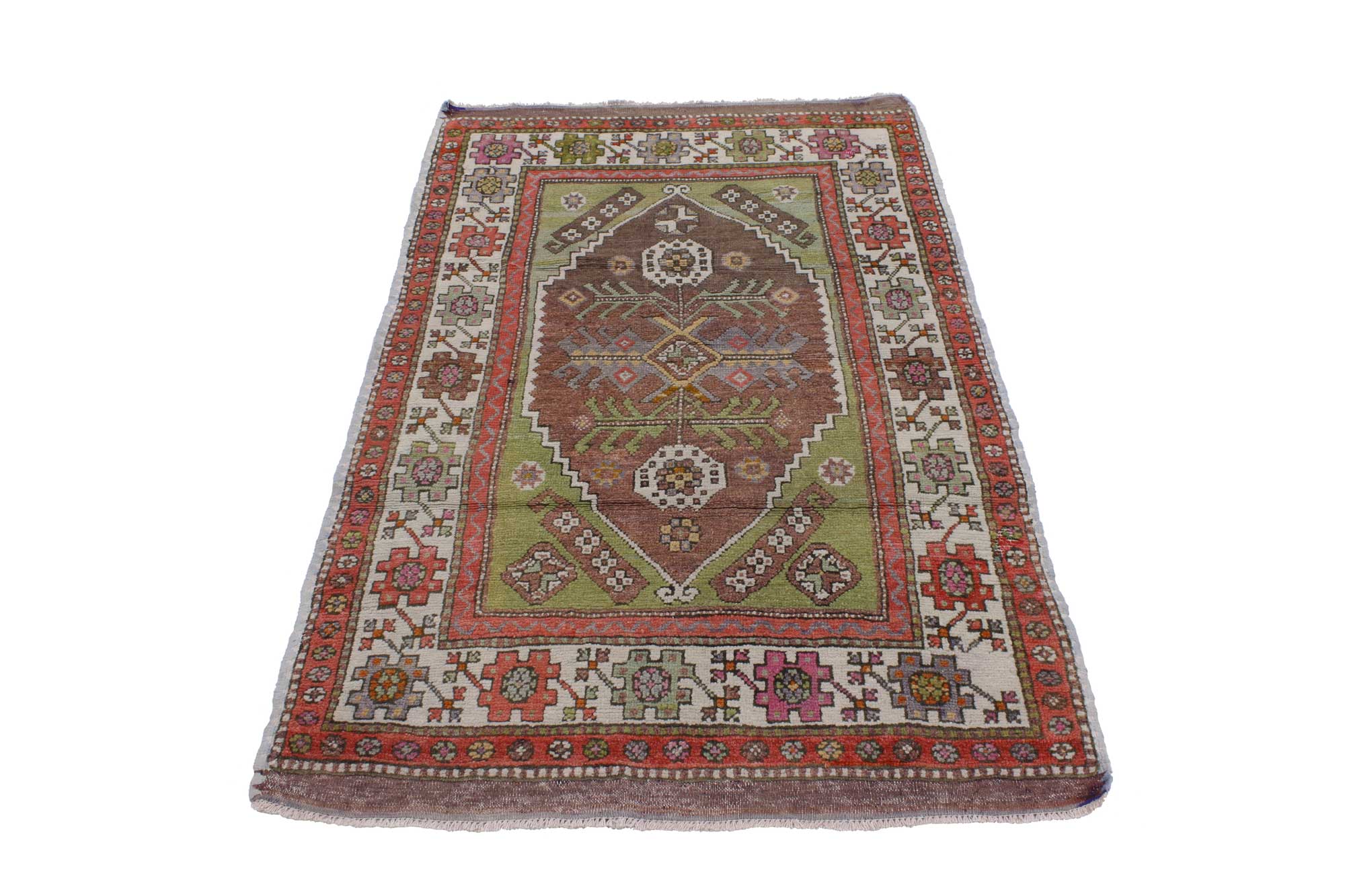 Rendered in variegated shades of pistachio, avocado, brown, sienna, ivory, lavender, plum, persimmon, dark pink, celadon and beige. From casual contemporary to elegant traditional, this small Oushak rug is well-suited for a range of interiors: Traditional, Modern, Mid-Century Modern, Contemporary, Industrial, Rustic, Lodge, Country, Primitive, Tribal and Bohemian. Perfect for small spaces, living rooms, bedrooms, kitchens, bathrooms, hallways, foyers and entryways. Abrash. Hand-knotted wool. Made in Turkey. Measures: 03'02 x 04'10.