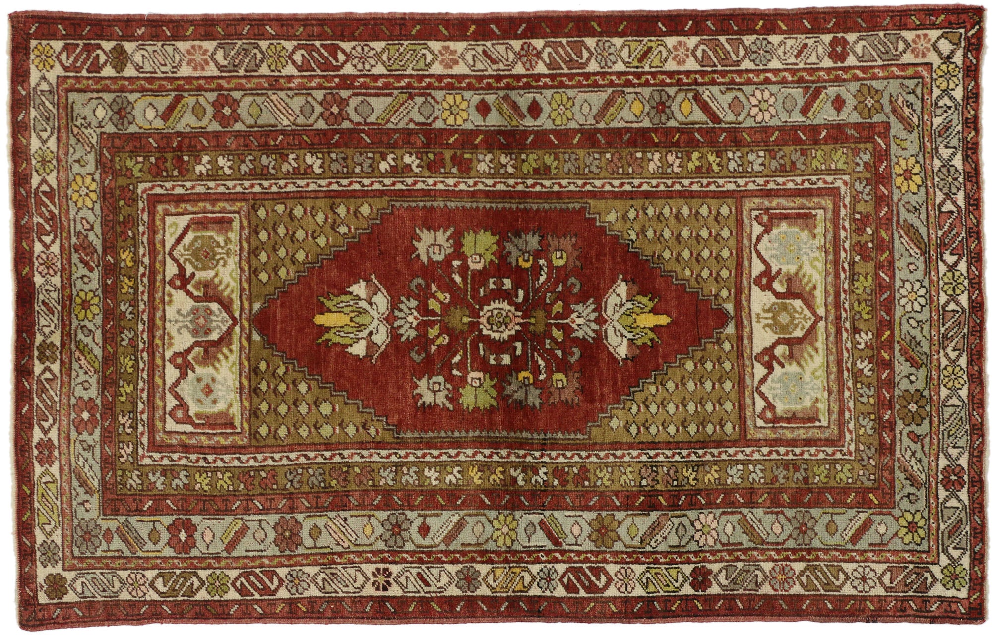 Warm and inviting with traditional style, this hand-knotted wool vintage Turkish Oushak rug features a timeless design surrounded by a classic border. Perfect for a home office, small space, reading nook, foyer, entryway, study, studio, den, bedroom, home library, walk-in closet, stair landing, alcove, mudroom, kitchen, sunroom, owners retreat, or several pieces layered in the living room, front room, game room, home theater, or cozy lounge area.