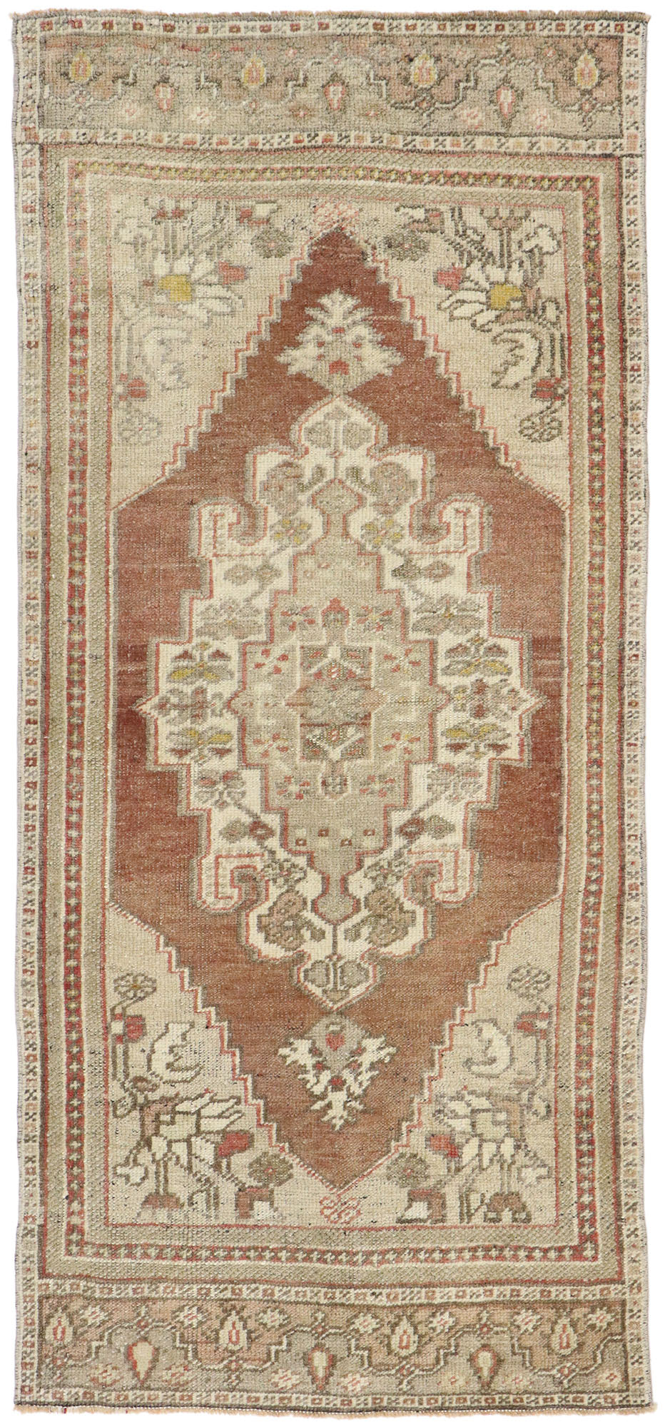 Emanating timeless appeal and neutral hues, this hand knotted wool vintage Turkish Oushak rug exhibits a nostalgic charm with an eclectic vibe that is especially suitable within a shabby chic interior with a Swedish Cottage or Belgian farmhouse theme. It features a central medallion with a botanical pattern in an abrashed stepped cut-out field. Florals and foliage adorn each corner spandrel. Natural abrash gradations authenticate this gorgeous vintage Oushak rug creating inimitable warmth and nostalgic charm. It is enclosed with a series of thin guard bands flanked with rectangular panels at either end.