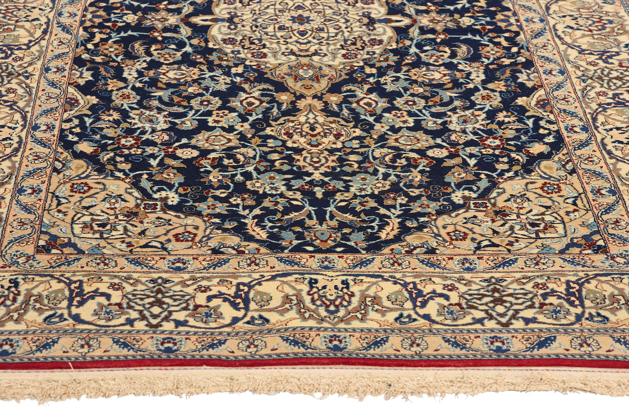 The color palette of this Persian Tudeshk Nain rug is both sophisticated and inviting, highlighting creamy beige tones that accentuate the central medallion and surrounding floral motifs, creating a captivating contrast with the deep navy blue field. Soft accents of sky blue, tan, and warm brown add depth and dimension, enhancing the rug’s overall visual appeal. The undulating palmette border, enriched with interlaced arabesques and scrolling vines, framed in complementary beige, balances the boldness of the central design, giving this vintage Persian rug a refined and harmonious look.
