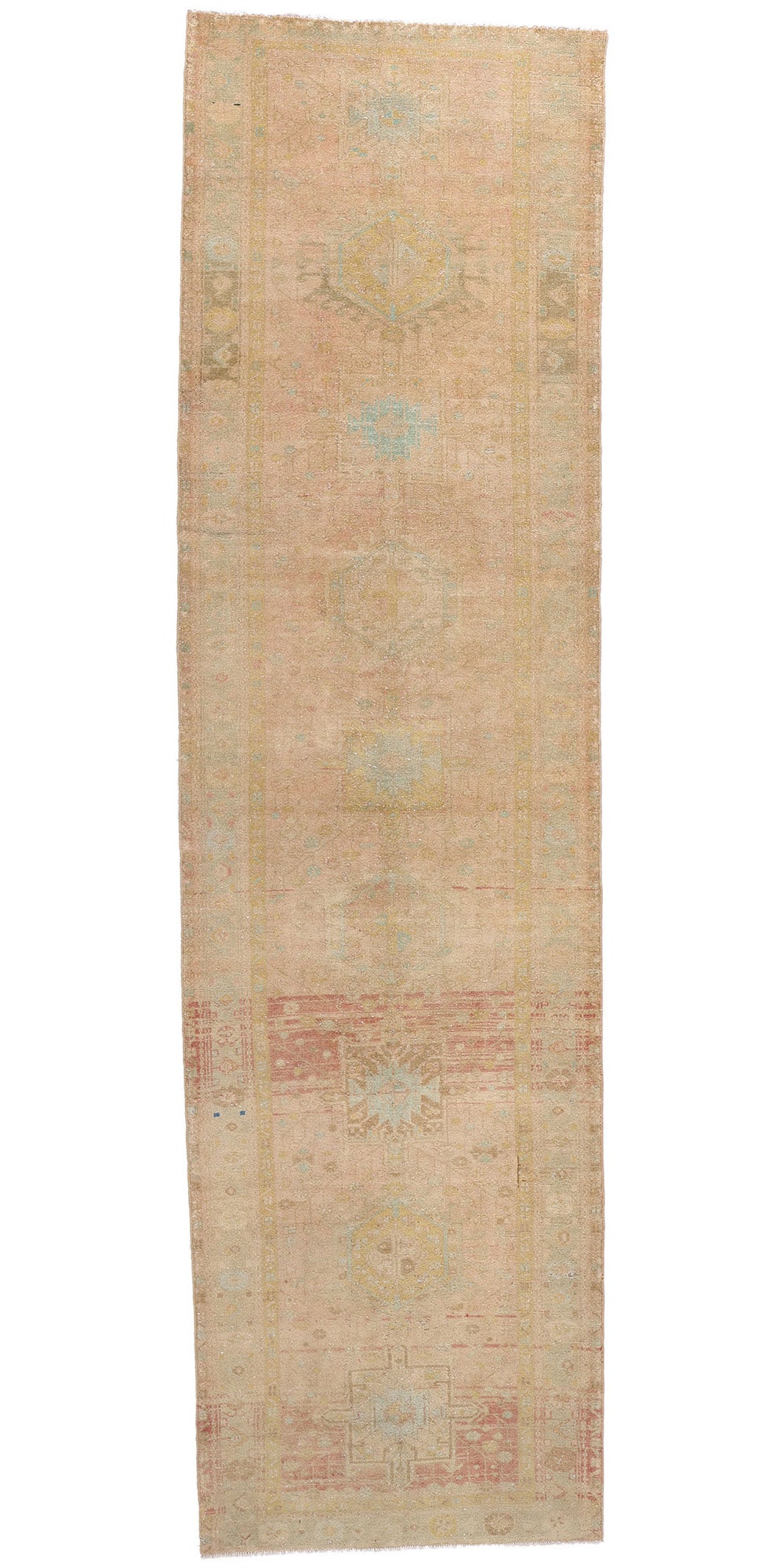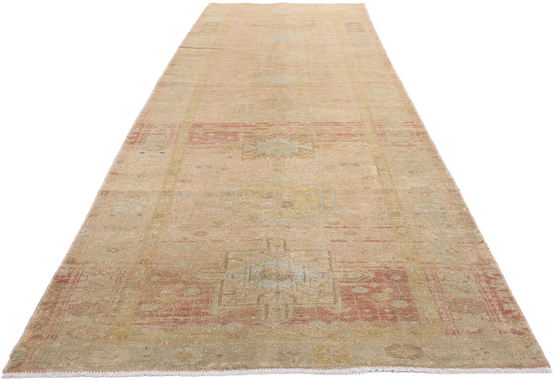 Framing the field is a classic border composed of geometric motifs and serrated leafy forms, an homage to the iconic elements of Heriz designs. These intricate borders not only encapsulate the central design but also add a layer of depth and definition, creating a cohesive and balanced composition. The distressed texture and intimate patina enhance the Persian runner’s nomadic charm, capturing the passage of time and the story of its journey.