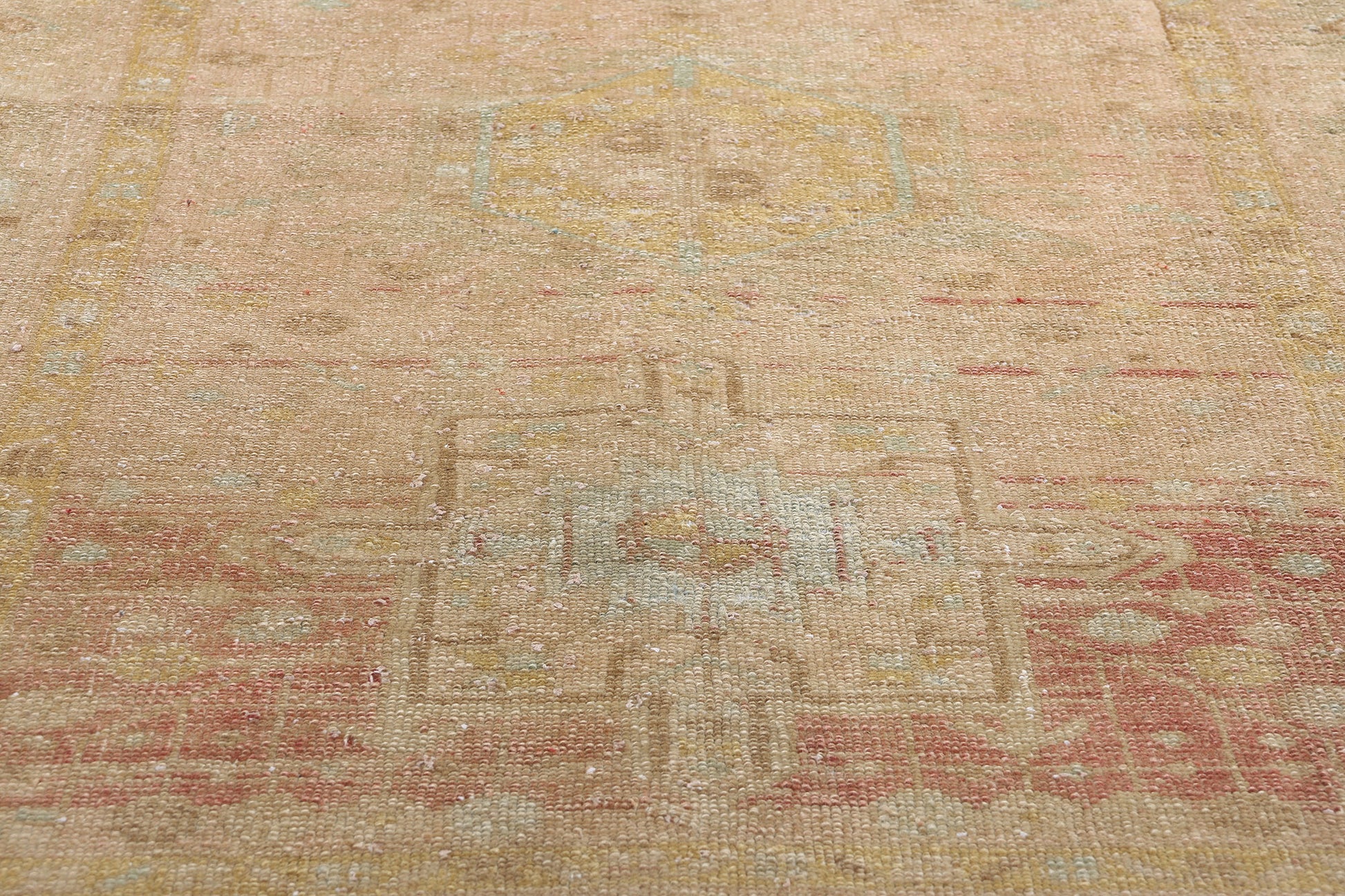 This hand knotted wool distressed antique Persian Northwest rug runner, inspired by the timeless Karaja Heriz design, exudes an ethereal elegance that effortlessly bridges history and artistry. The faded composition, softened by an antique wash, creates a serene interplay of dusty rose hues, pastel blues, and light brown tones. This harmonious palette imparts a sense of relaxed refinement, inviting warmth and character into nearly any space it inhabits.