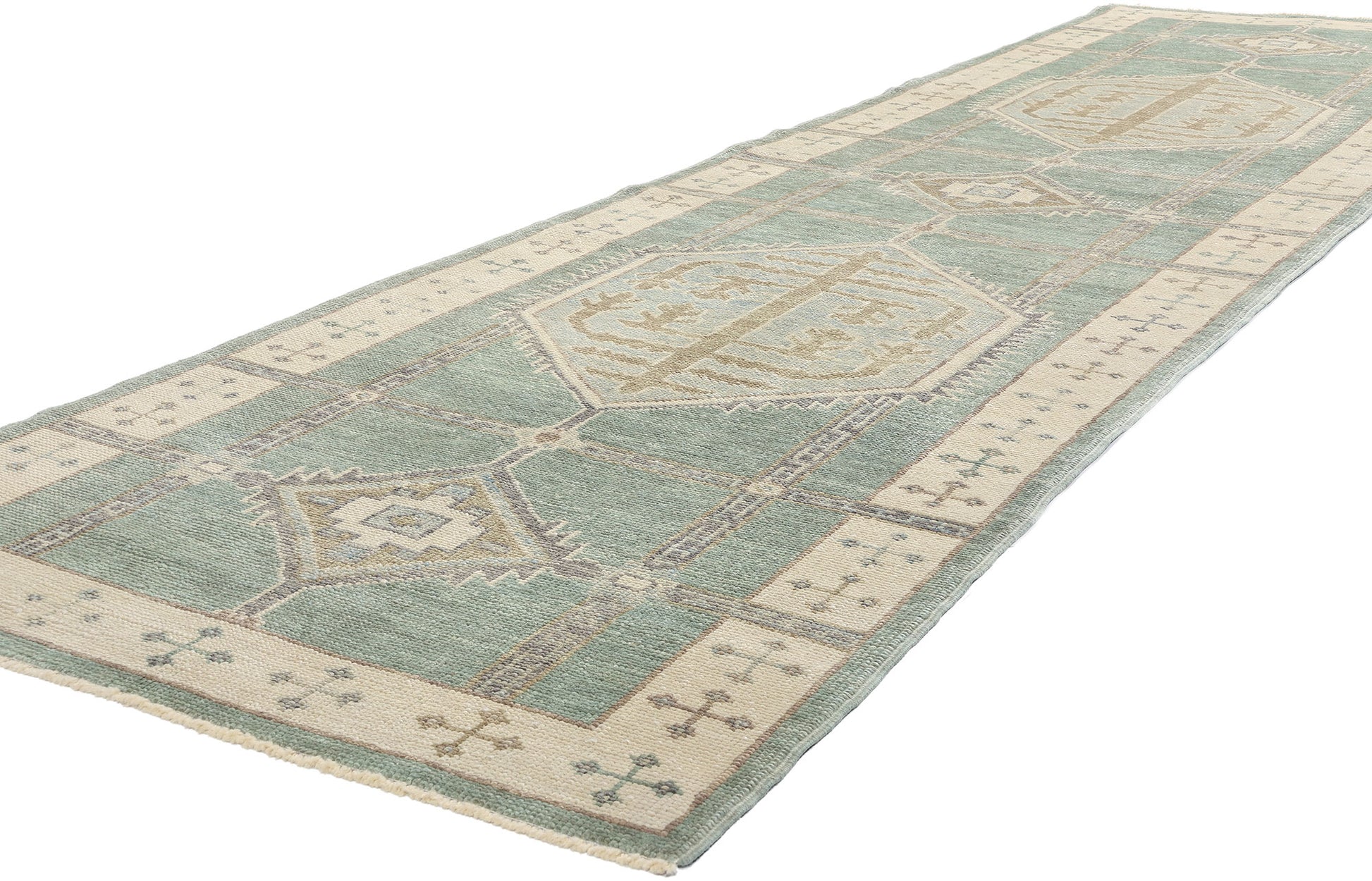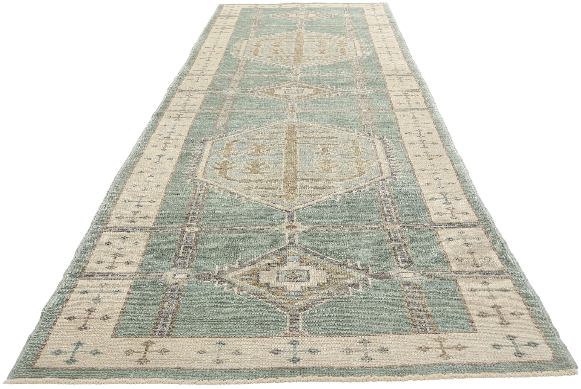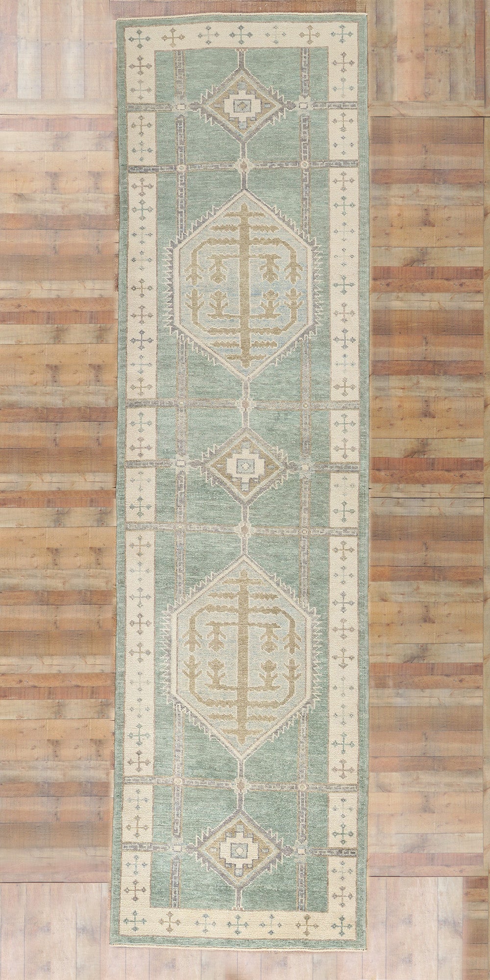 A repeating cross motif border on a beige backdrop frames the composition, flanked by a solid sage green outer border. This layered framing gives the rug a grounded, cohesive appearance while offering a nod to traditional Anatolian weaving. The combination of soft hues and symbolic motifs ensures this Turkish Oushak rug runner bridges the gap between heritage and modernity, making it an ideal addition to both contemporary and rustic interiors. Its design tells a story of history and artistry, bringing warmth and cultural significance to nearly any space it graces.