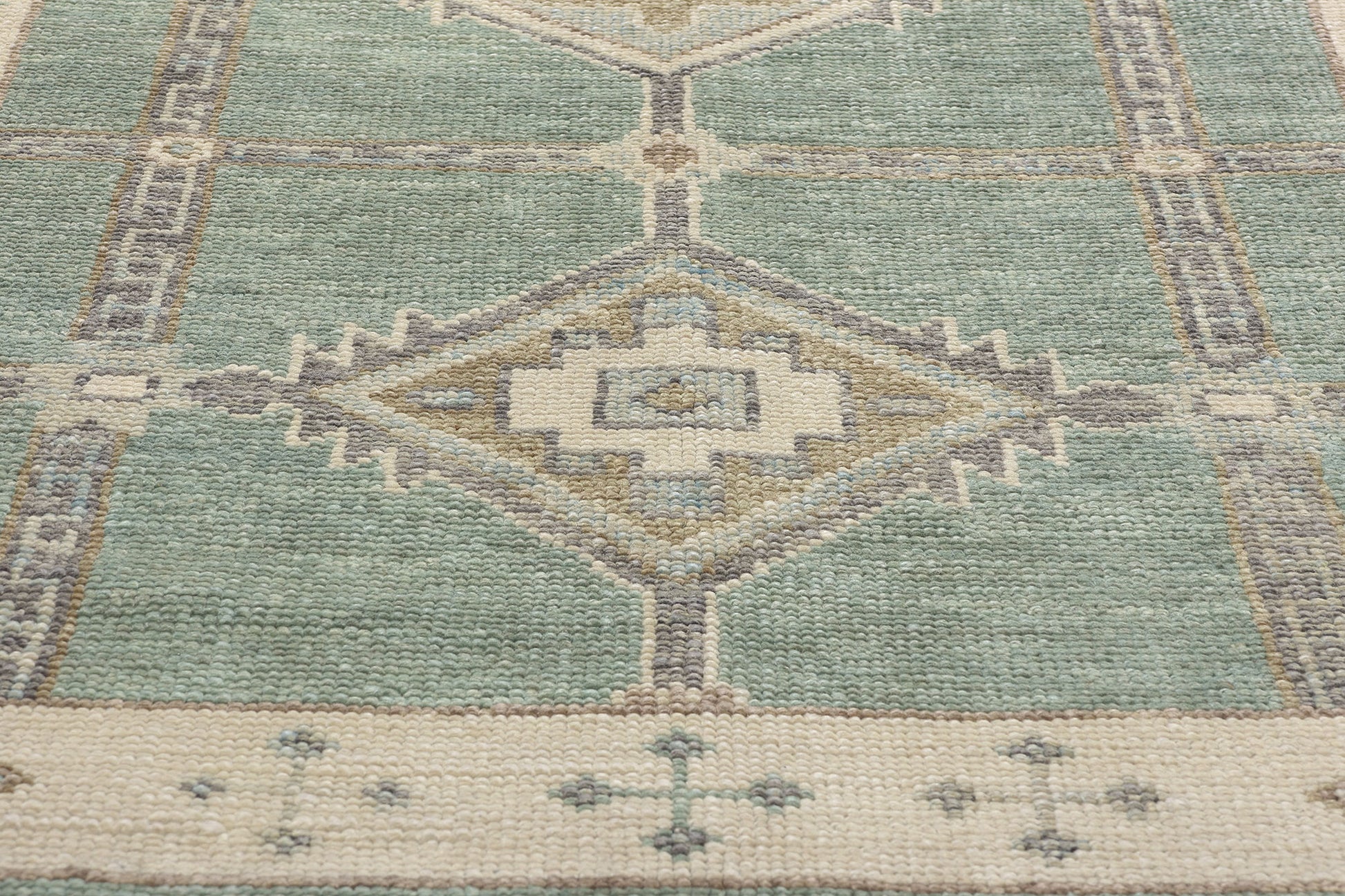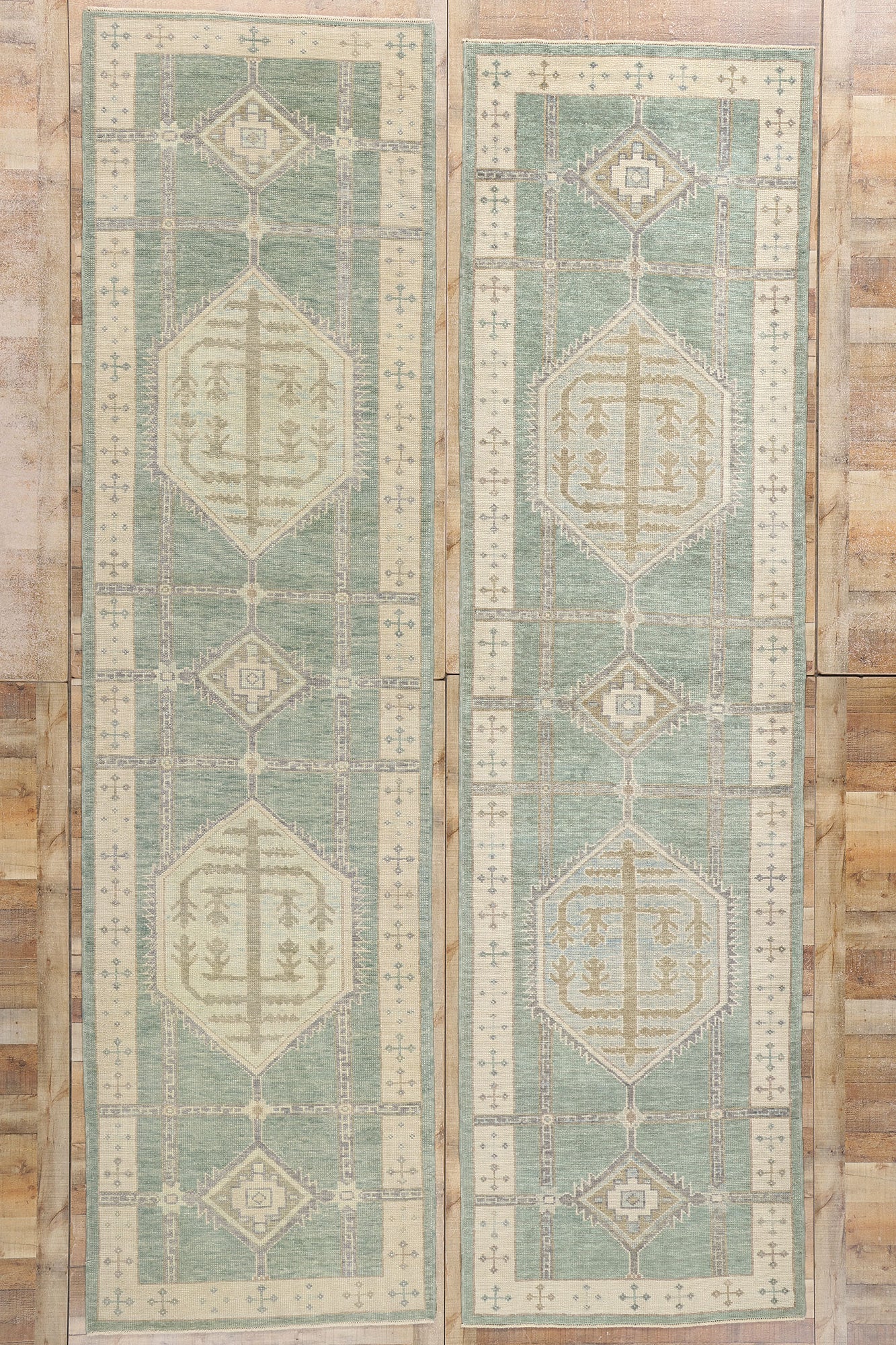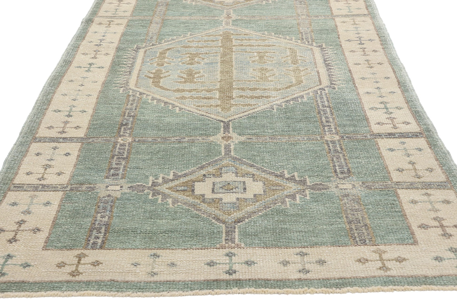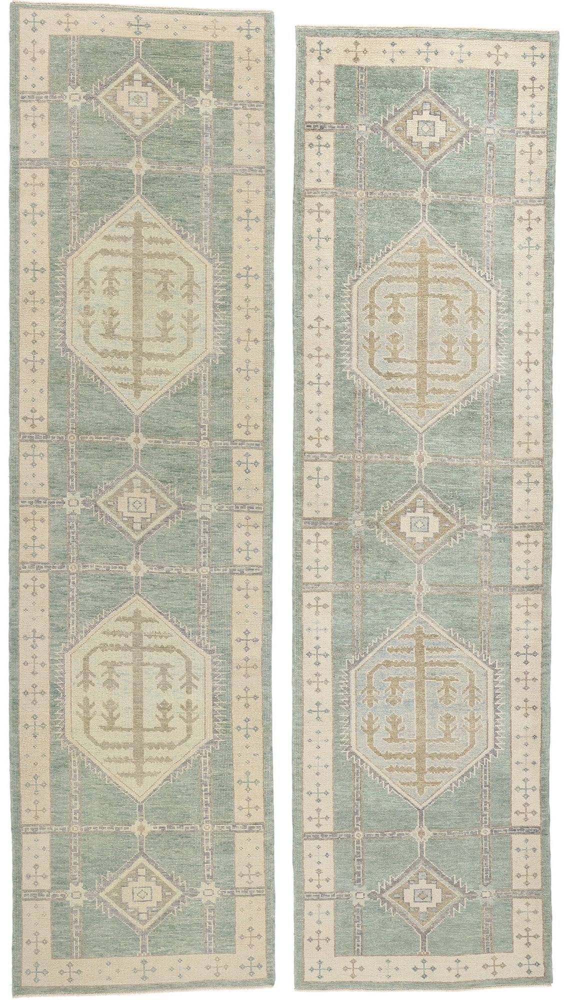 A repeating cross motif border on a beige backdrop frames the composition, flanked by a solid sage green outer border. This layered framing gives the rug a grounded, cohesive appearance while offering a nod to traditional Anatolian weaving. The combination of soft hues and symbolic motifs ensures this Turkish Oushak rug runner bridges the gap between heritage and modernity, making it an ideal addition to both contemporary and rustic interiors. Its design tells a story of history and artistry, bringing warmth and cultural significance to nearly any space it graces.