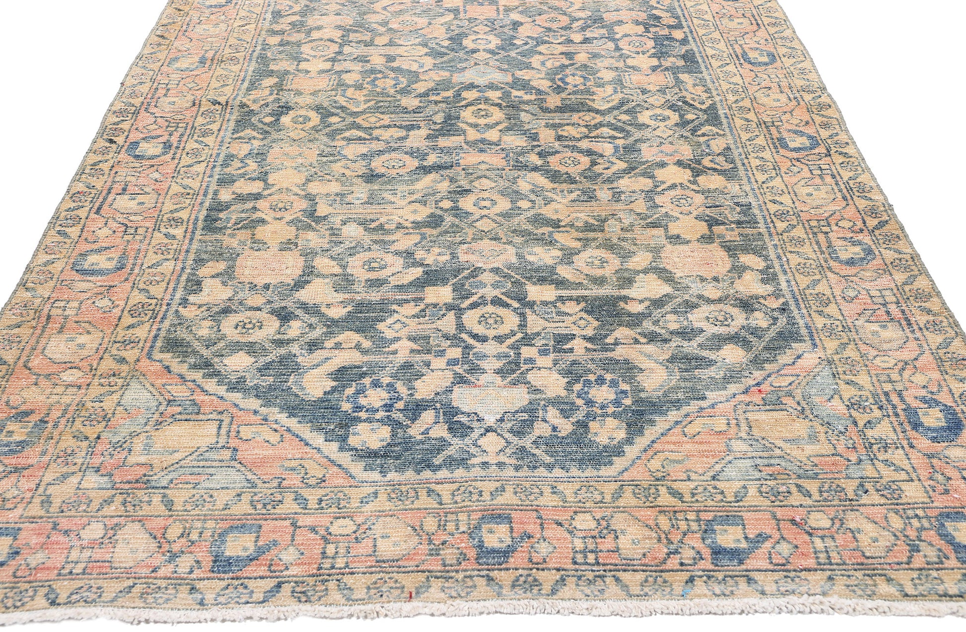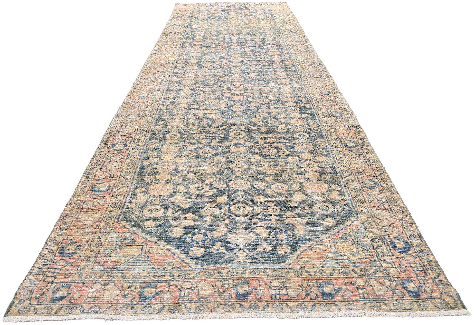 The Persian carpet runner’s richly detailed field is adorned with an allover Herati motif pattern, a hallmark of Persian rug design. The delicate interplay of floral rosettes, stylized leaves, and diamond lozenges creates a mesmerizing visual rhythm that is both intricate and balanced. The soothing palette of faded blue and beige with hints of soft pink adds depth and texture to the Persian runner, while the distressed finish enhances its vintage character, lending it a timeless sophistication. This harmonious combination of design and color makes this Hamadan runner a stunning centerpiece for nearly any hallway or transitional space.