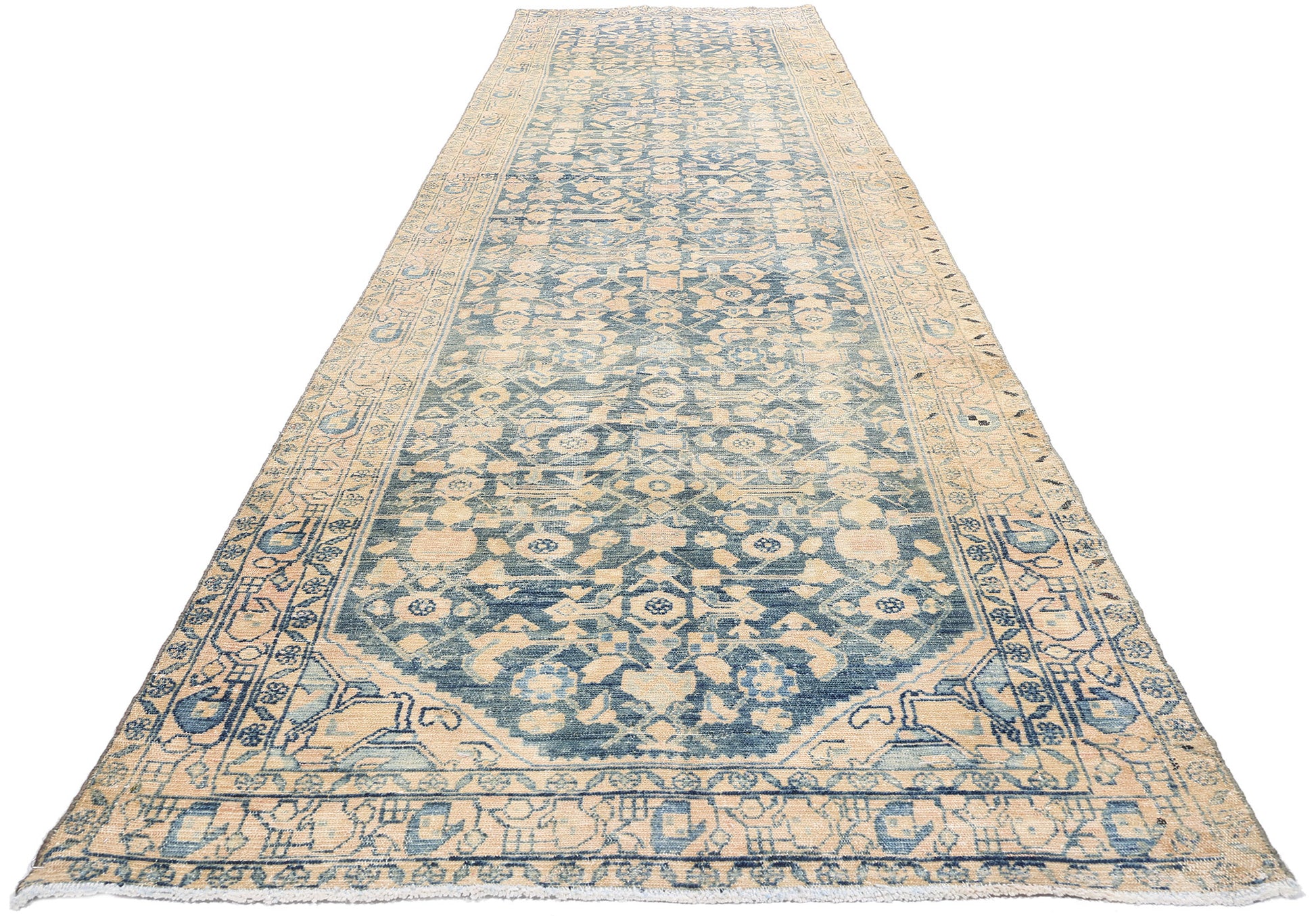 The intricate field of this Hamadan carpet runner is adorned with an allover Herati pattern, a timeless motif of Persian rug design. This classic motif, featuring interlocking floral rosettes and diamond-shaped medallions, symbolizes abundance and harmony. The symmetry and precision of the design are mesmerizing, drawing the eye along the runner’s elongated form. The use of subtle abrash—a natural variation in dye tones—adds depth and character, creating a unique visual story across the rug’s surface.